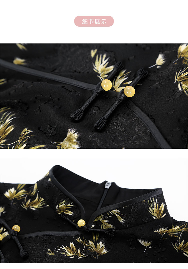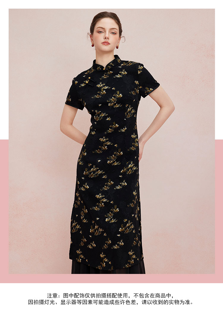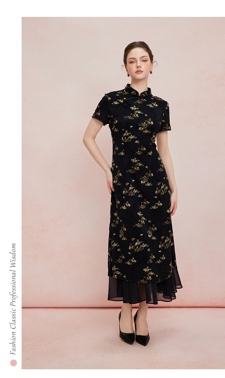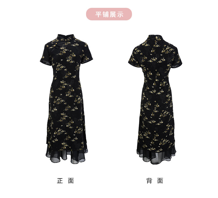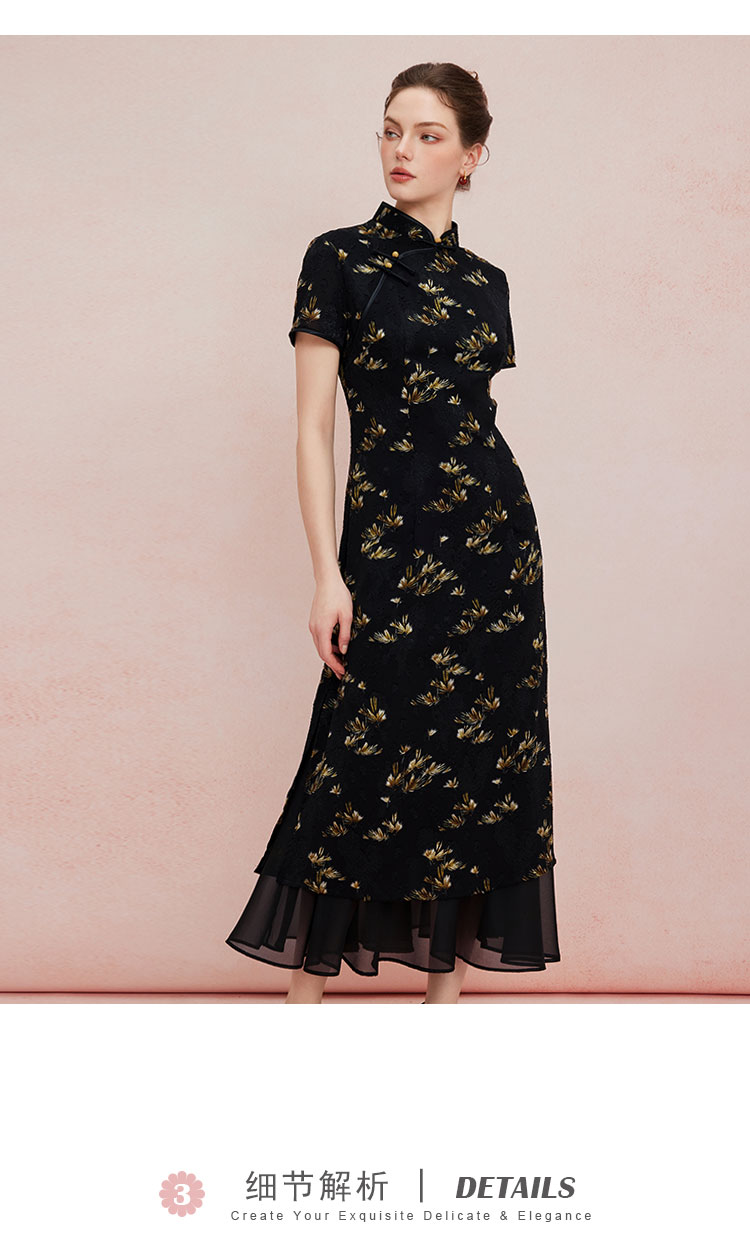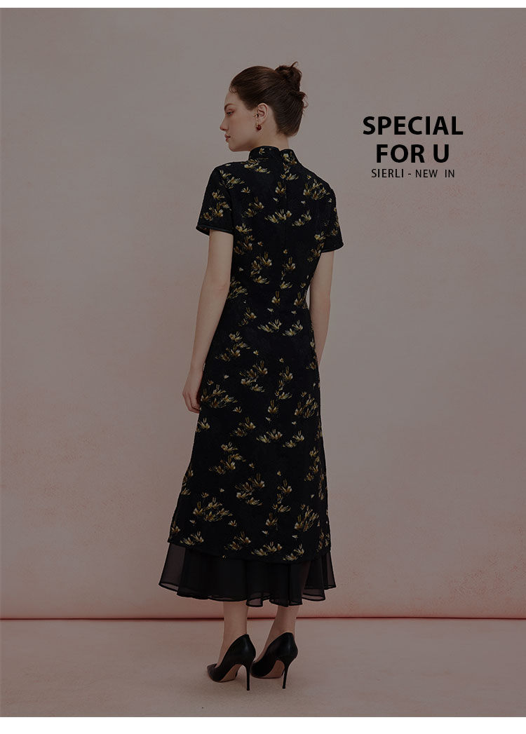 QF820斯尔丽25新款改良式旗袍提花加印花下摆荷叶波浪修身浪漫连衣裙