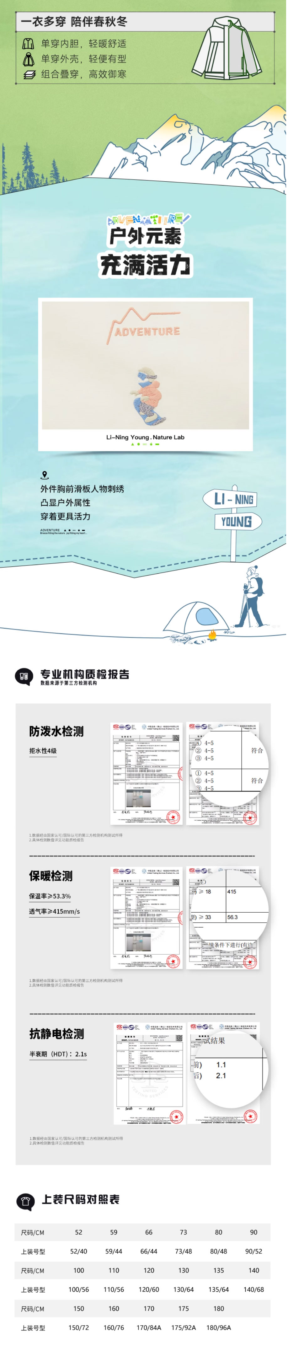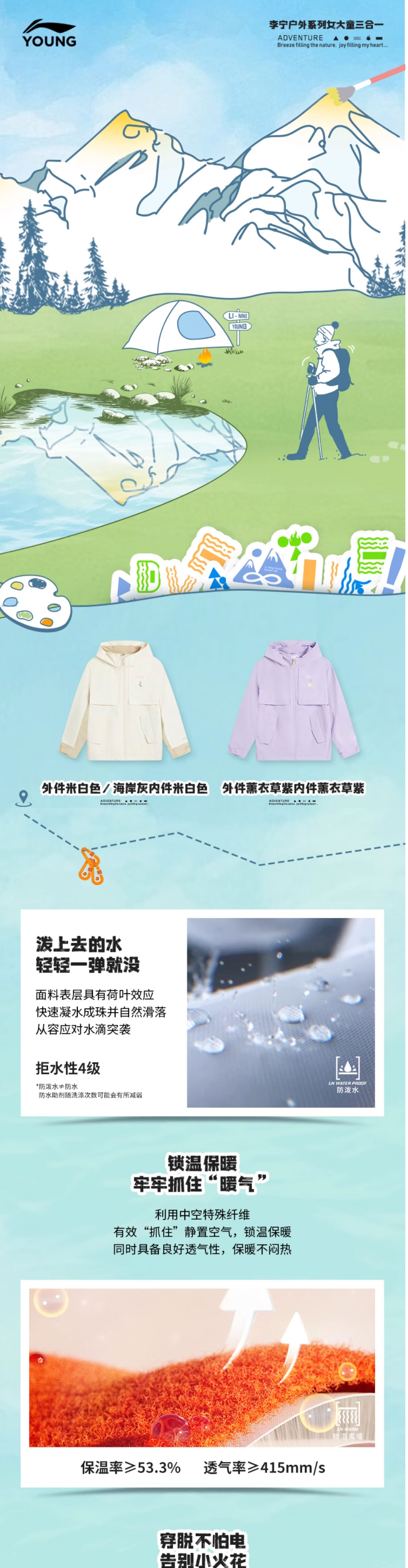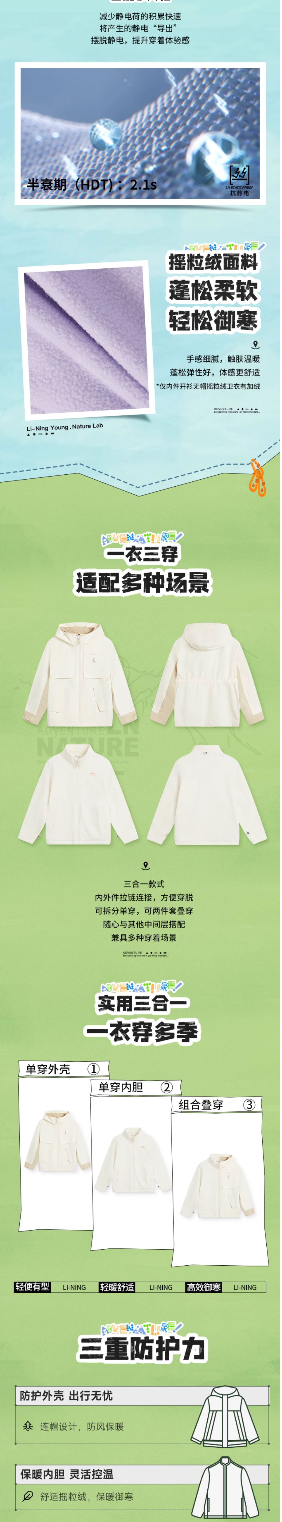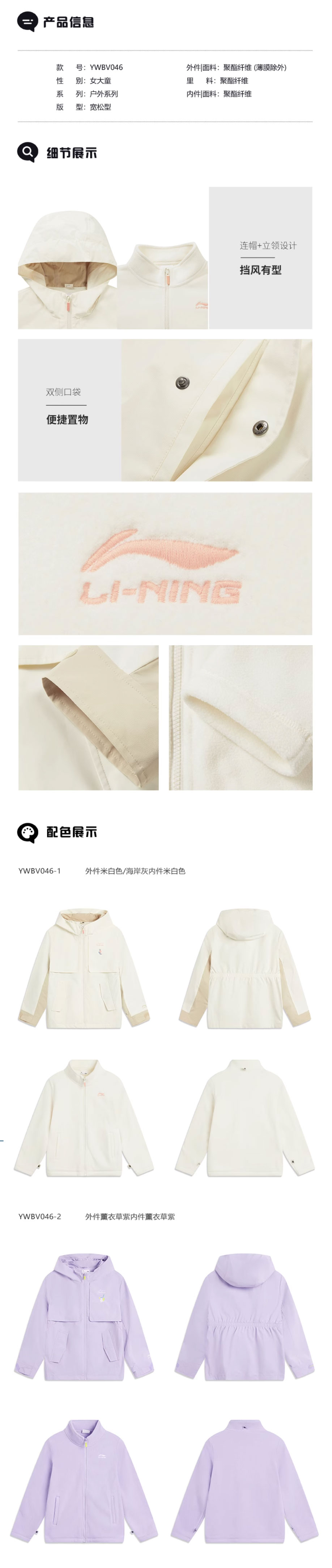李宁童装女童冲锋外套三合一儿童25新款防风运动服YWBV046-2