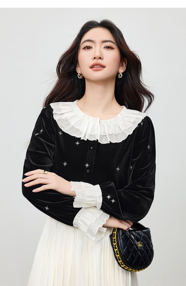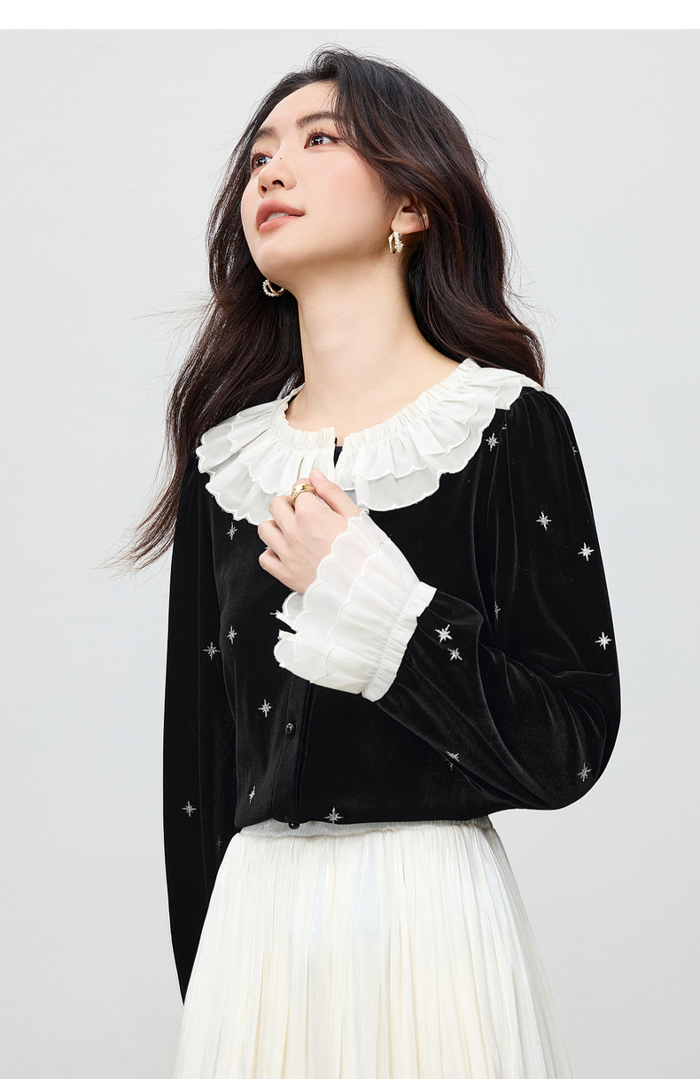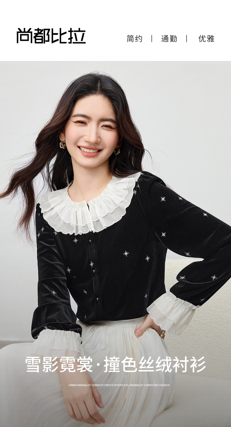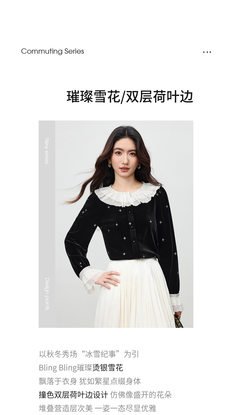 【内购】【雪影霓裳】通勤拼接双层荷叶边圆领烫银雪花图案弹力丝绒衬衫-154CJ3882