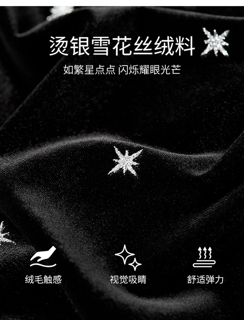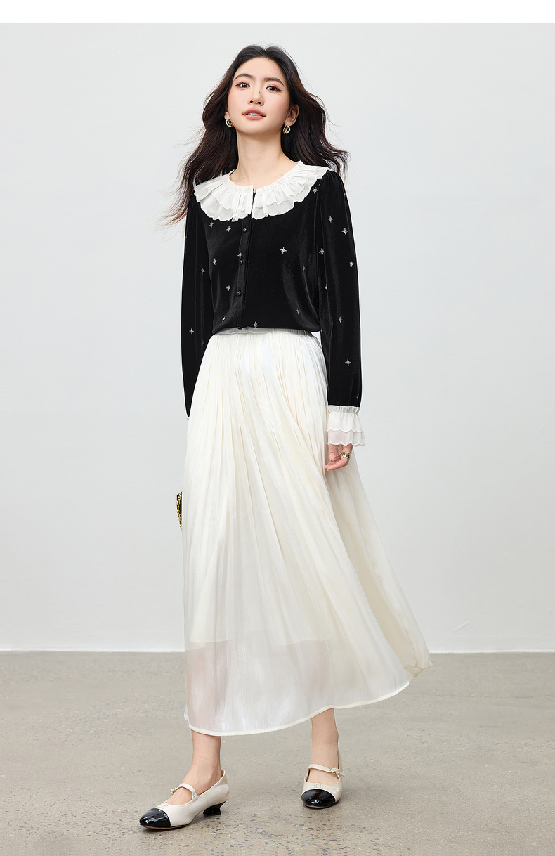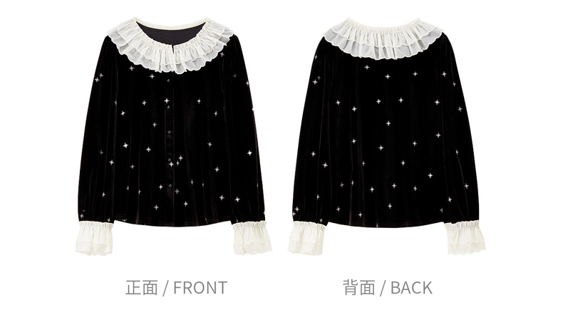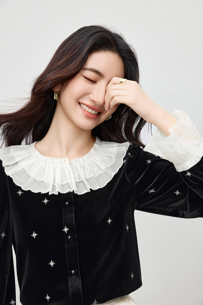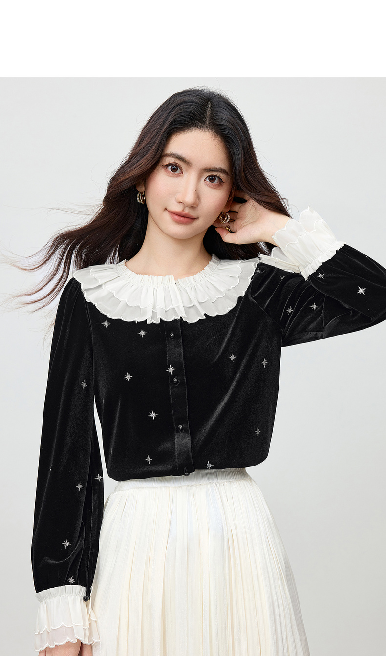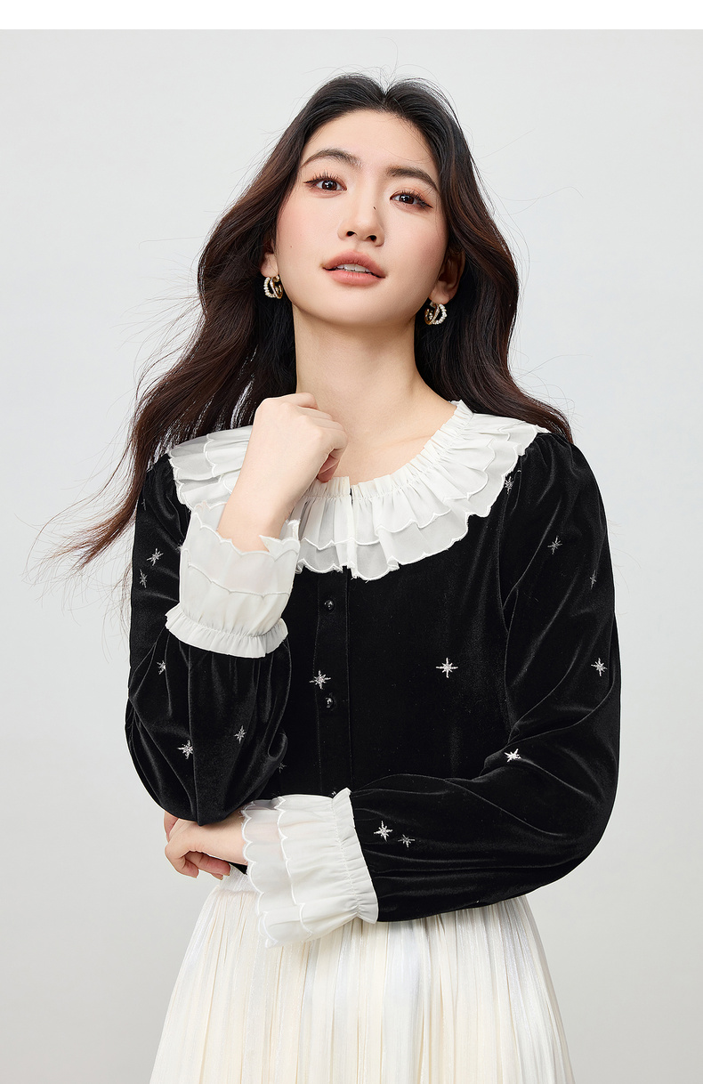 【内购】【雪影霓裳】通勤拼接双层荷叶边圆领烫银雪花图案弹力丝绒衬衫-154CJ3882