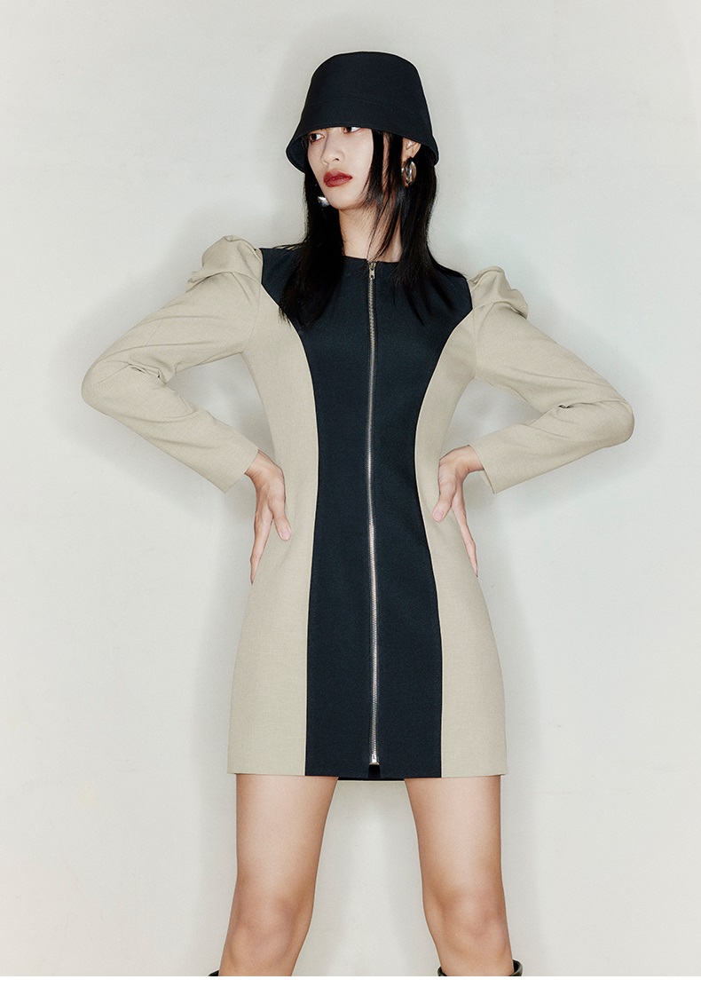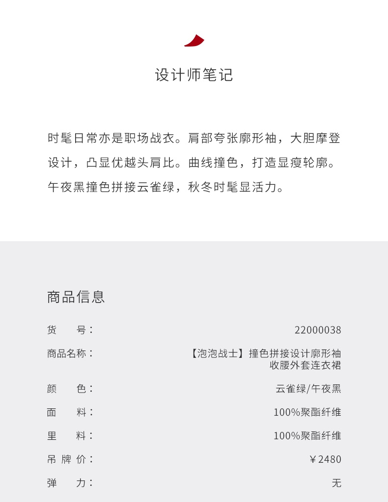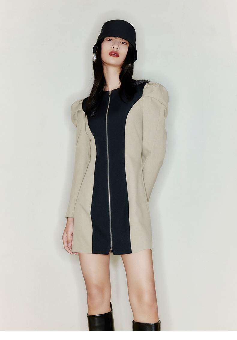 【泡泡战士】撞色拼接设计廓形袖收腰外套连衣裙/22000038