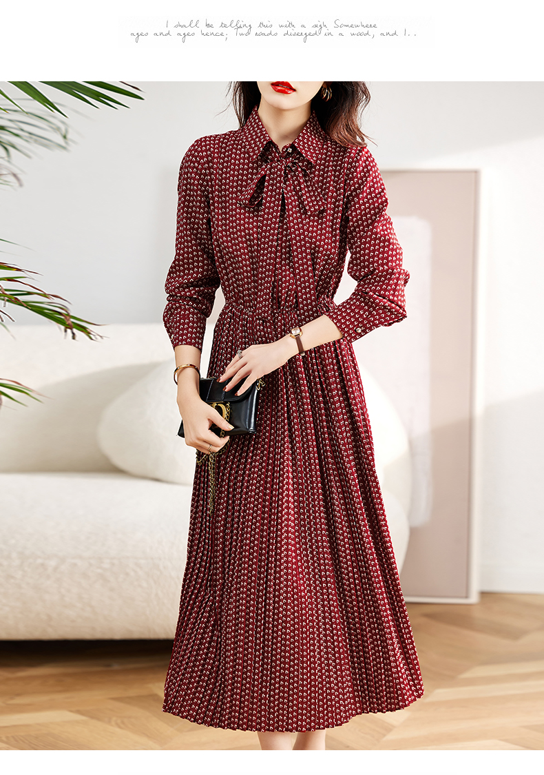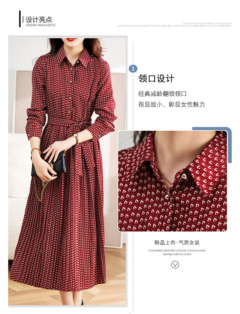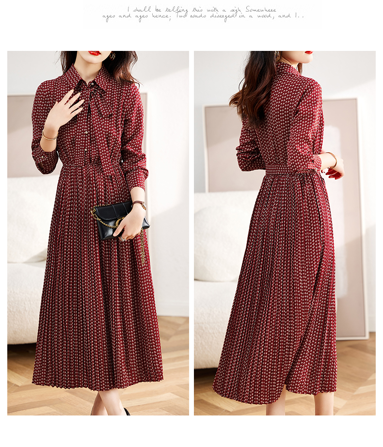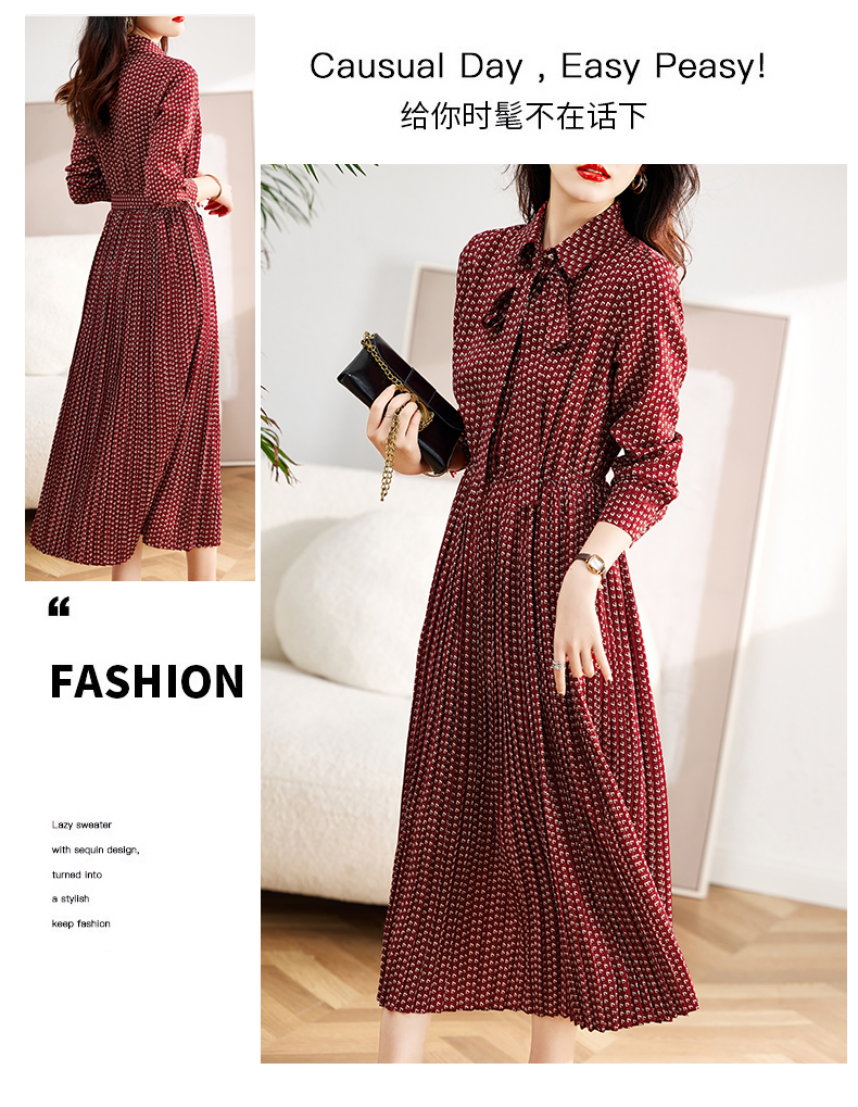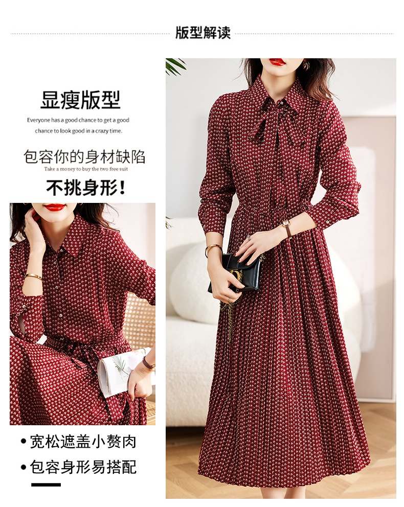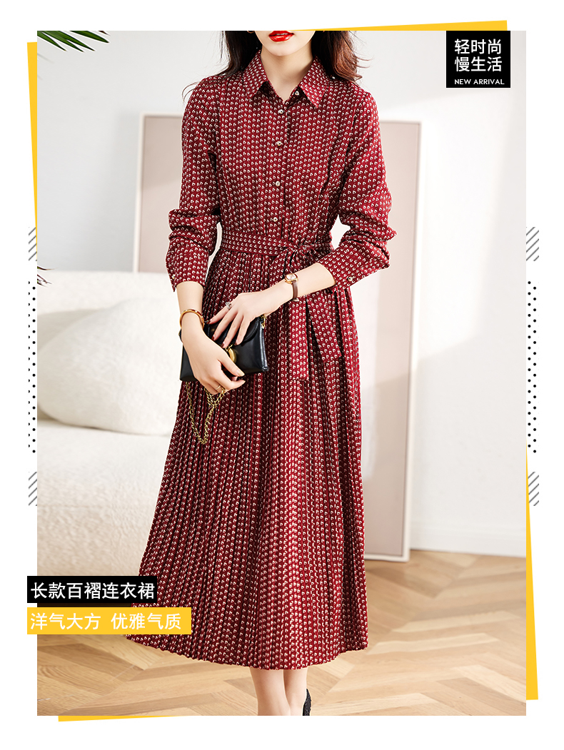 秋冬新款,长袖衬衫领松紧腰长款波点百褶裙学院风连衣裙HR-SYY2017A