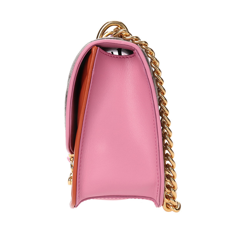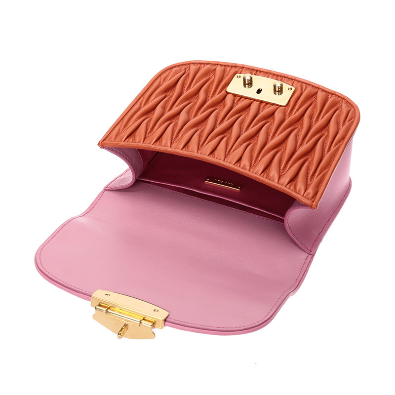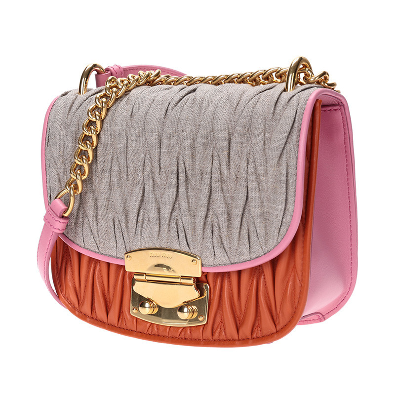 品牌:MiuMiu/缪缪 产地:意大利款式:女士产品颜色:浅驼色木瓜色粉色材质:织物配皮产品结构:按扣开合,1个贴袋,1个主袋产品尺寸:宽约20cm,高约17cm,厚约8cm