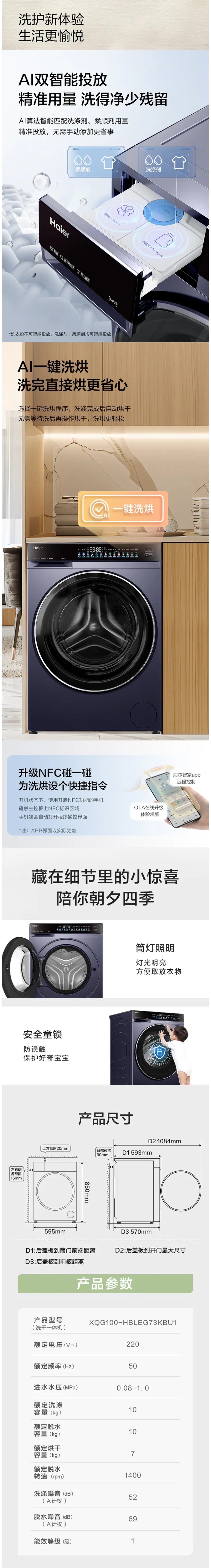 海尔云溪4.0 AI直驱滚筒洗衣机洗烘一体10kg 海尔·云溪·XQG100-HBLEG73KBU1