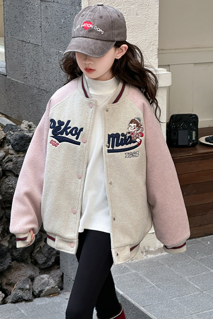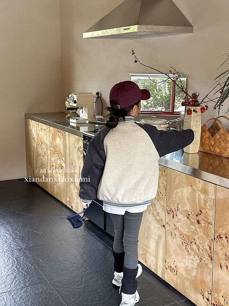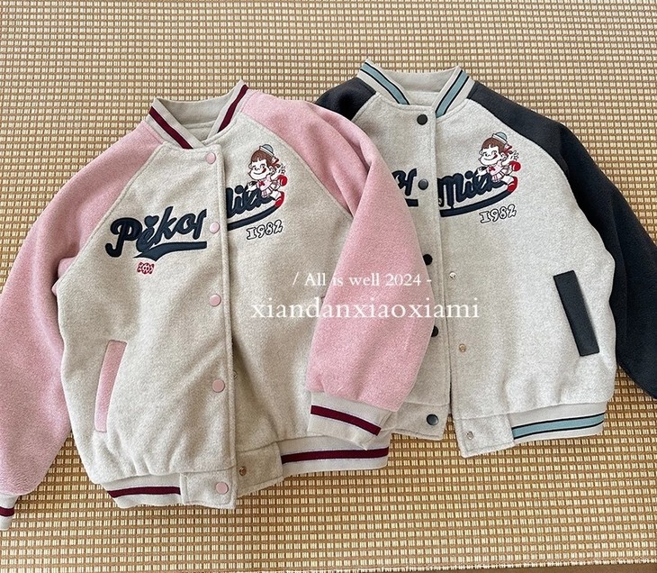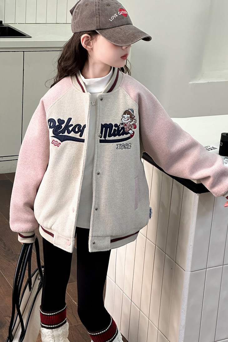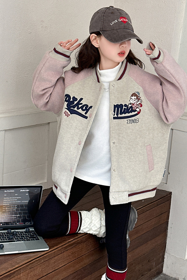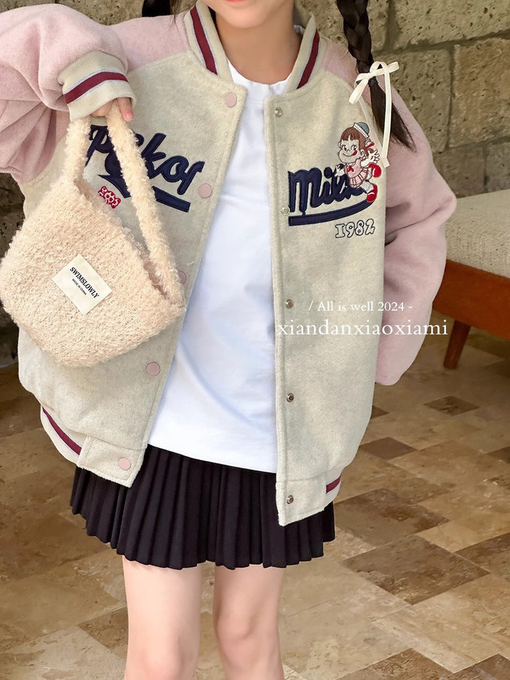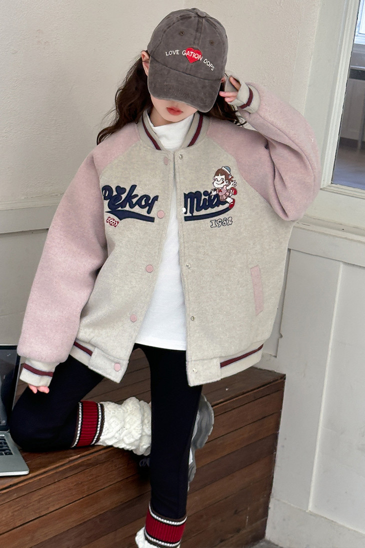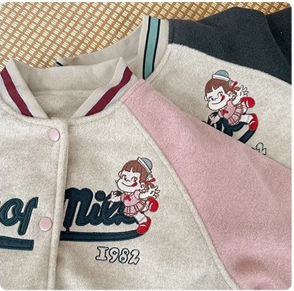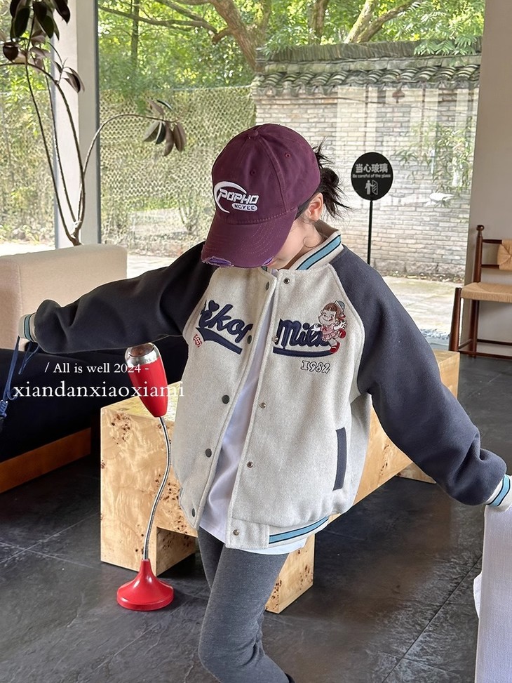 这个冬天霸屏相册的非它莫属 复古炭灰色和皮粉色和高级灰色拼接设计+宽松随性的棒球服版型穿上干净利落 胸前进口机万针不二家卡通图案绣花jing致,高档有品质 不是一般棒球服的罗纹领子哦更加富有创意 下摆和袖口都采用chun棉的编织防风撞色定制罗纹与袖子颜色相呼应 既提升了整体的质感又让衣服显得干练不臃肿洋气有时尚感