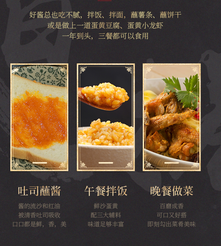 2.好酱总也吃不腻,拌饭、拌面,蘸薯条、蘸饼干,或是做上一道蛋黄豆腐、蛋黄小龙虾,一年到头,三餐都可以食用
