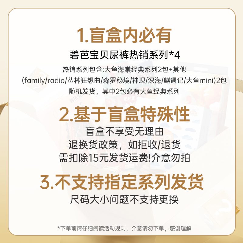 【惊喜盲盒】碧芭宝贝纸尿裤拉拉裤盲盒不指定系列随机发货4包,拍下即默认活动规则,不支持退换货,如拒收需扣除发货运费15元