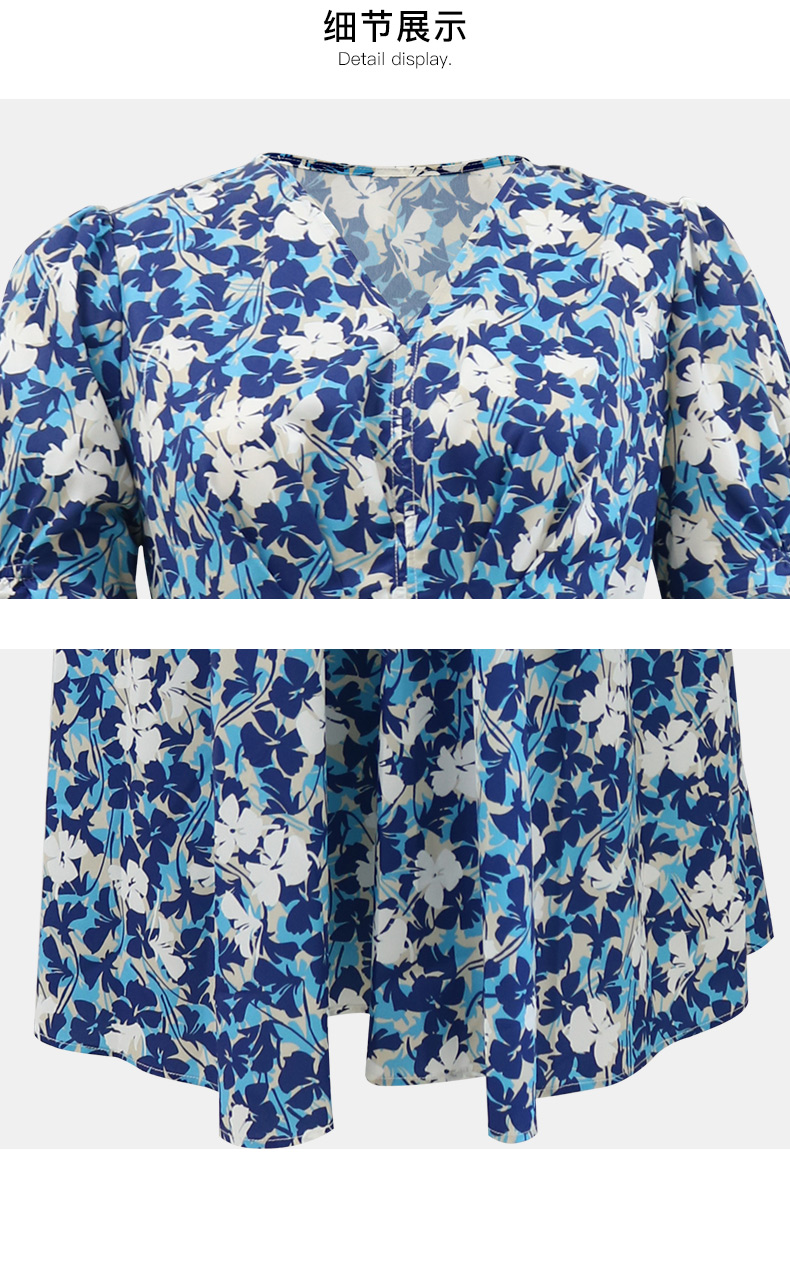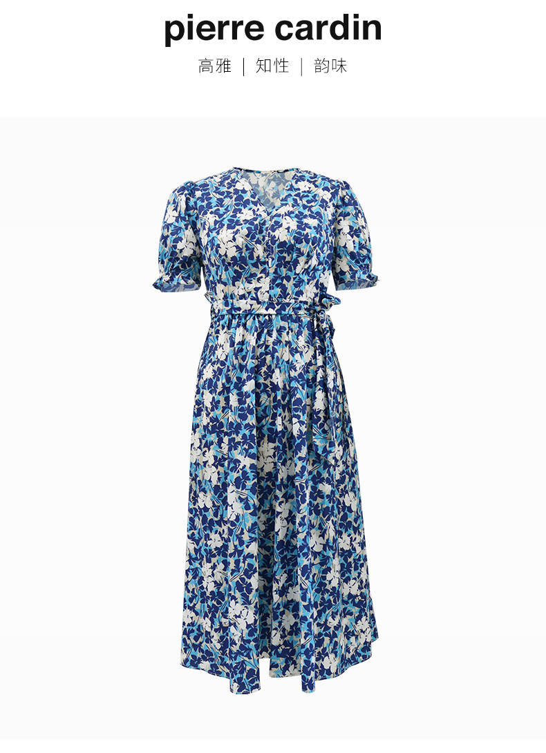 皮尔卡丹女装连衣裙V领蓝花色夏季宽松舒适碎花裙P4257D4157L3