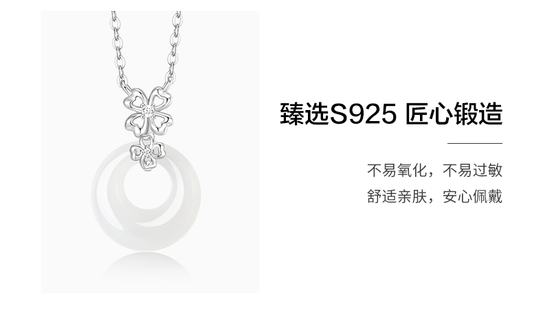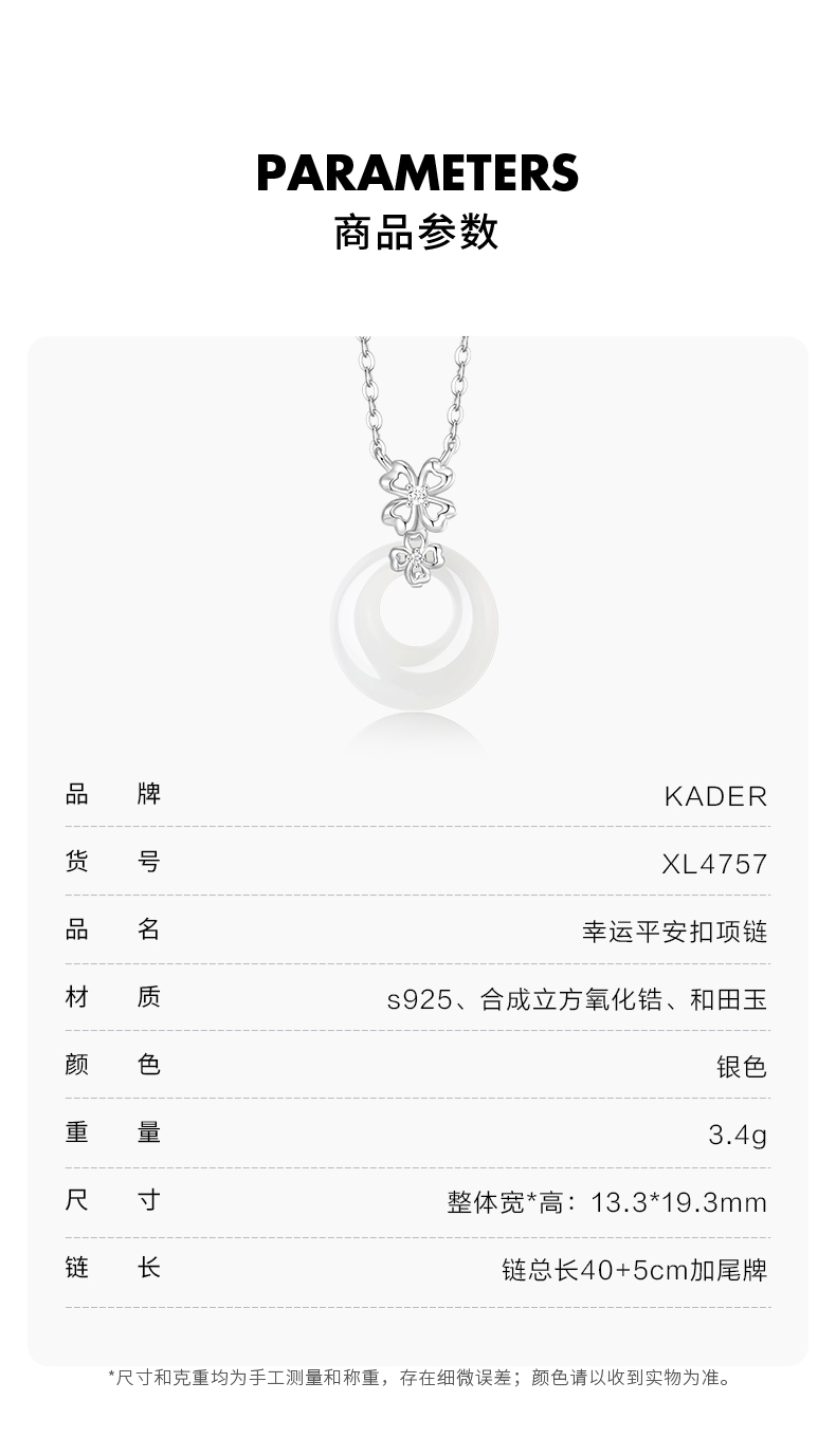 卡蒂罗/KADER 如意福牌系列 幸运平安扣项链 925银和田玉新中式国潮四叶草平安如意可调节锁骨链 温柔浪漫优雅气质