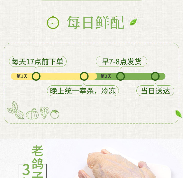 因天气炎热,为保证现杀鸽子新鲜,乳鸽 老鸽统一预售,周四晚上5点截单,周五发货,1只起售 。