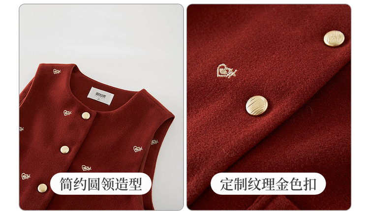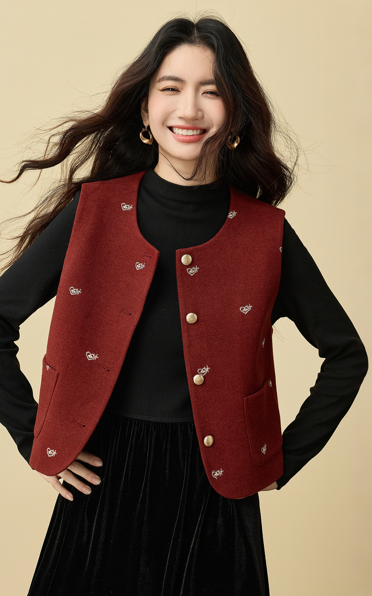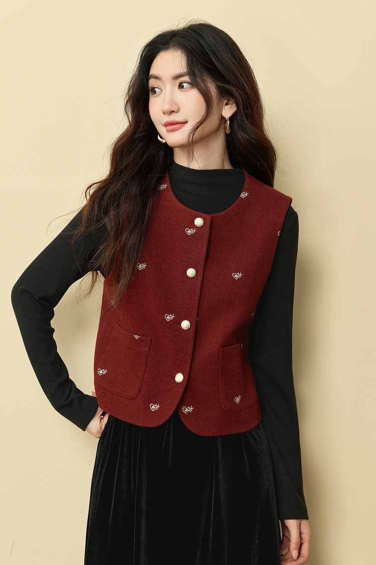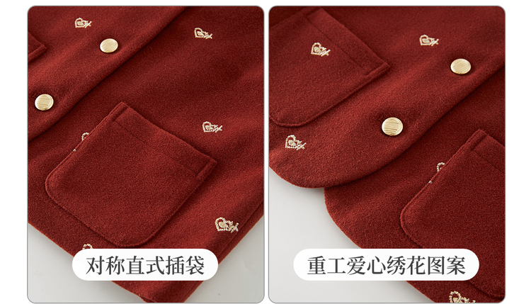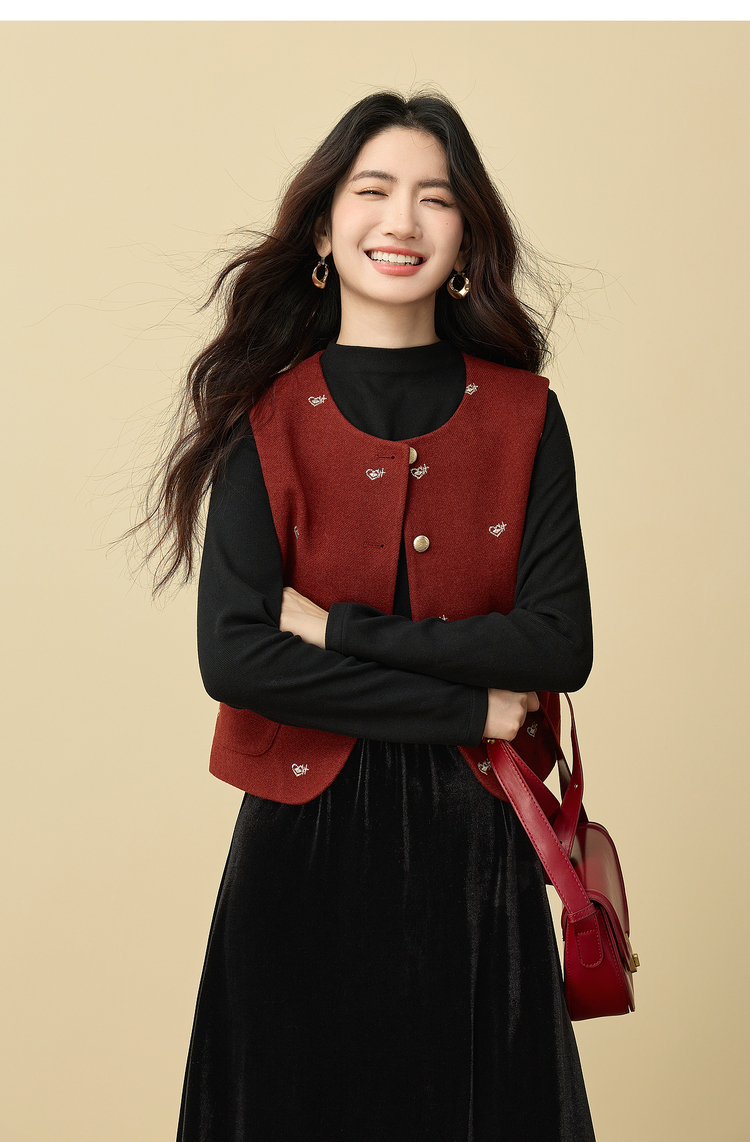 【年货节】熙世界圣诞红色毛呢马甲背心女秋冬小个子爱心刺绣无袖短外套上衣