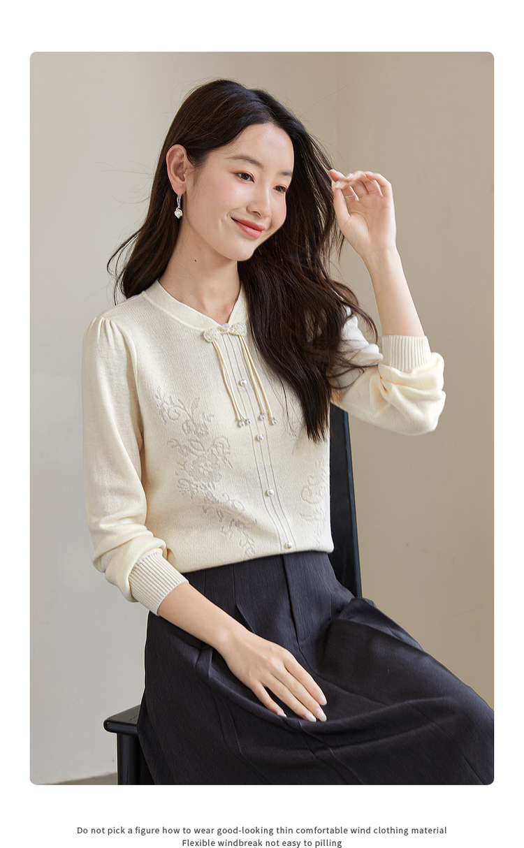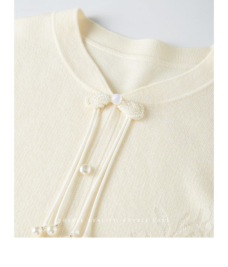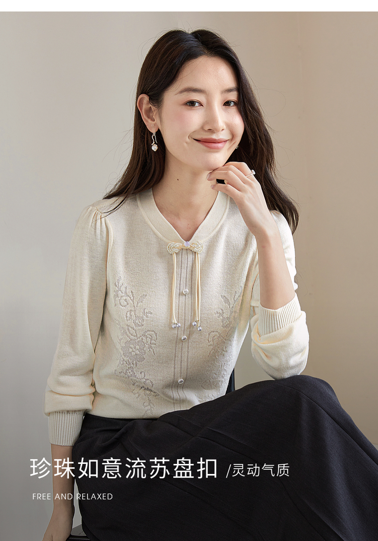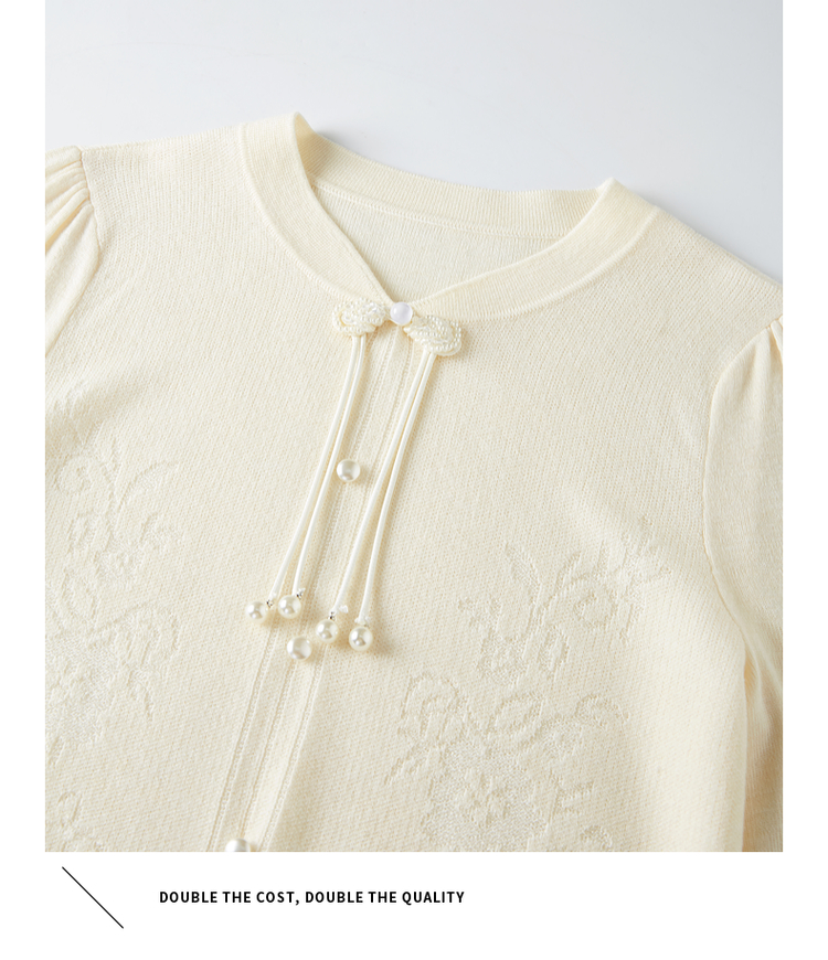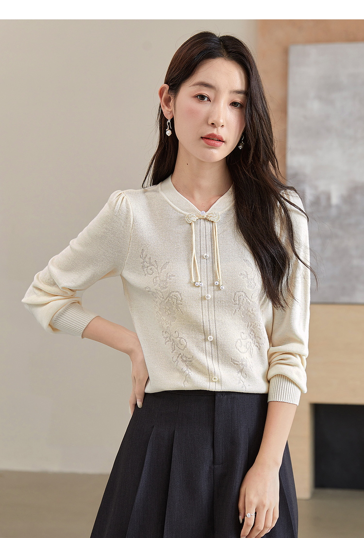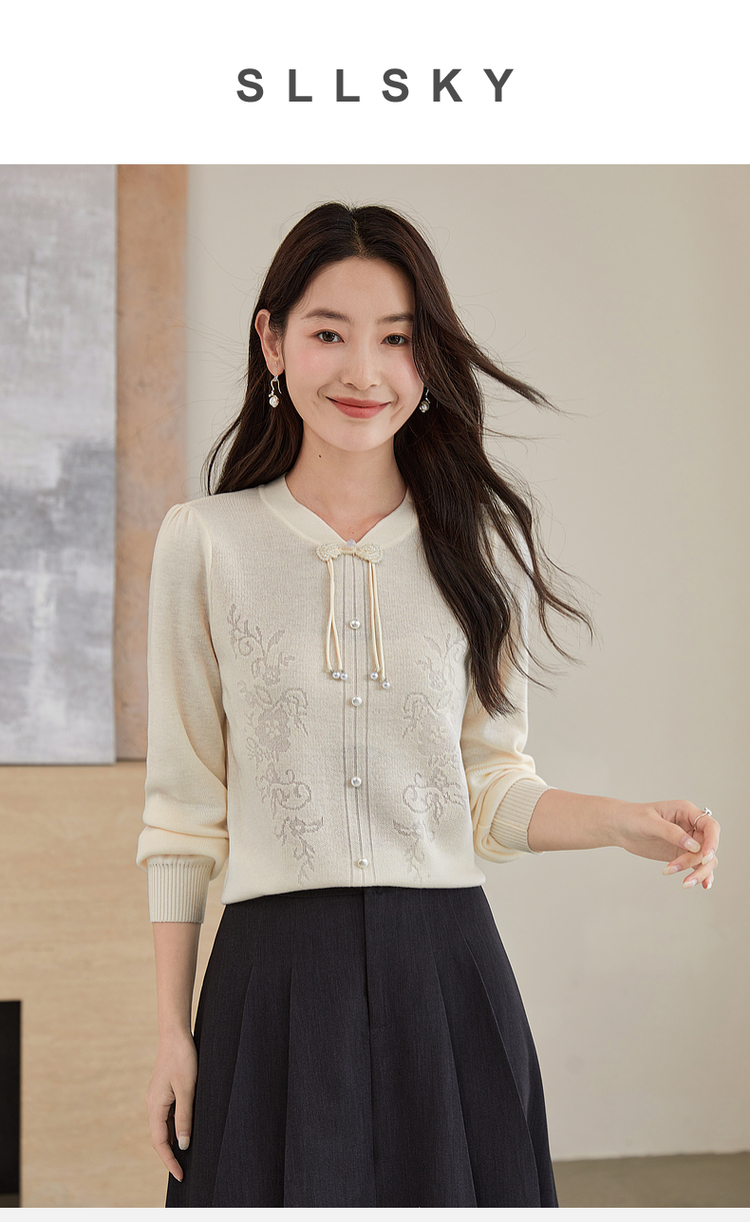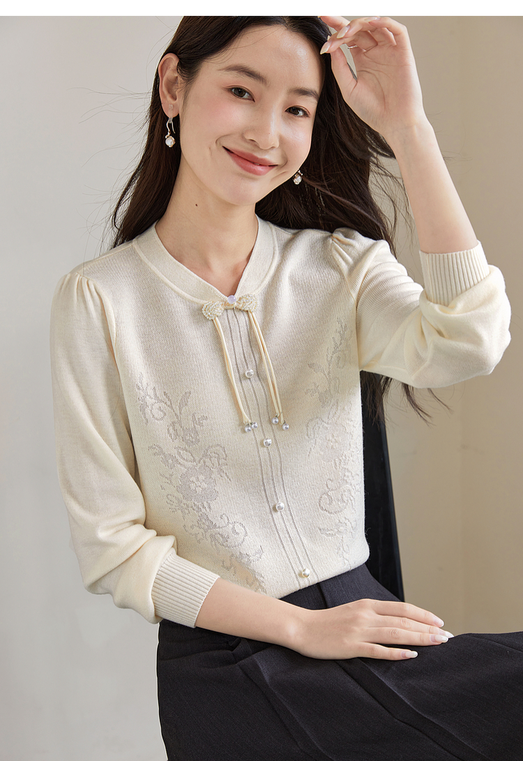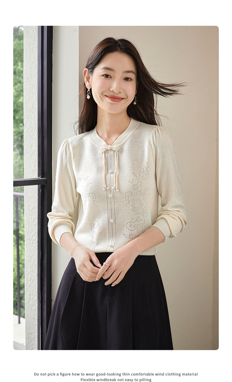 【69元福袋,不支持退换】熙世界新中式暗纹提花针织衫2025秋季新款珍珠盘扣正肩国风上衣