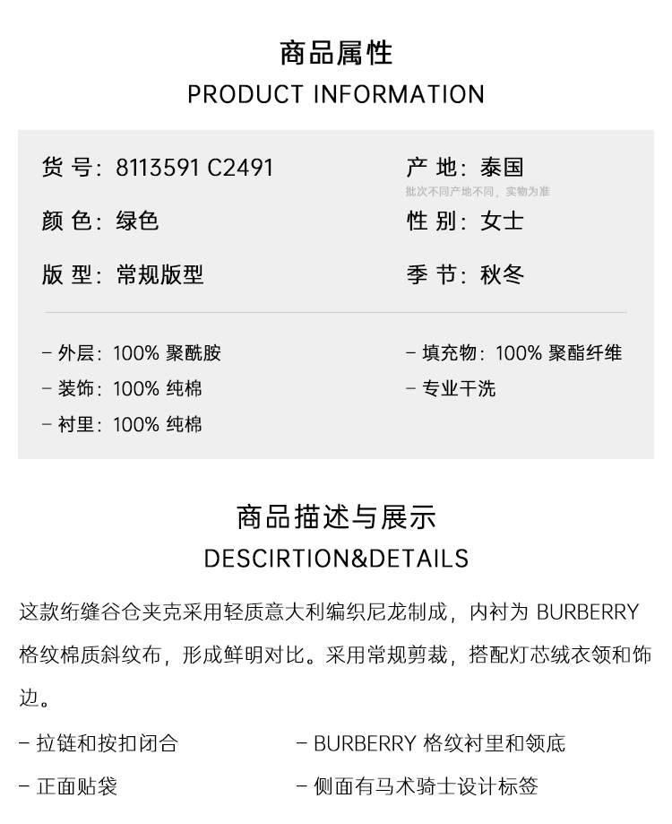 BURBERRY 巴宝莉 女士马术骑士标签绗缝尼龙谷仓夹克棉服 绿色 8113591 C2491