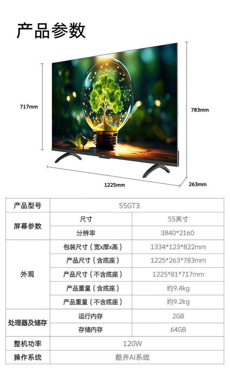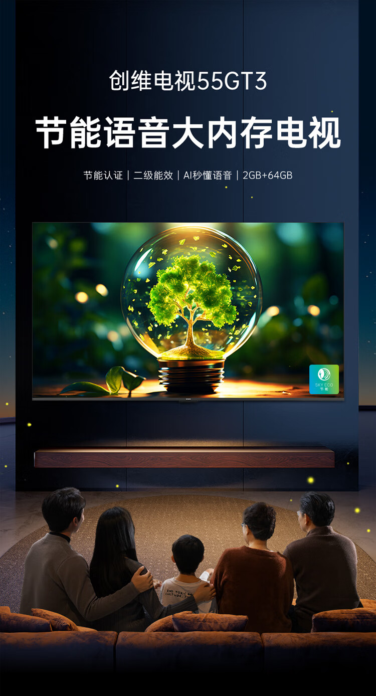 创维55英寸55GT3 AI秒懂语音2+64G大内存 二级节能认证 三重健康护眼 4K超高清 5大智能投屏 55英寸