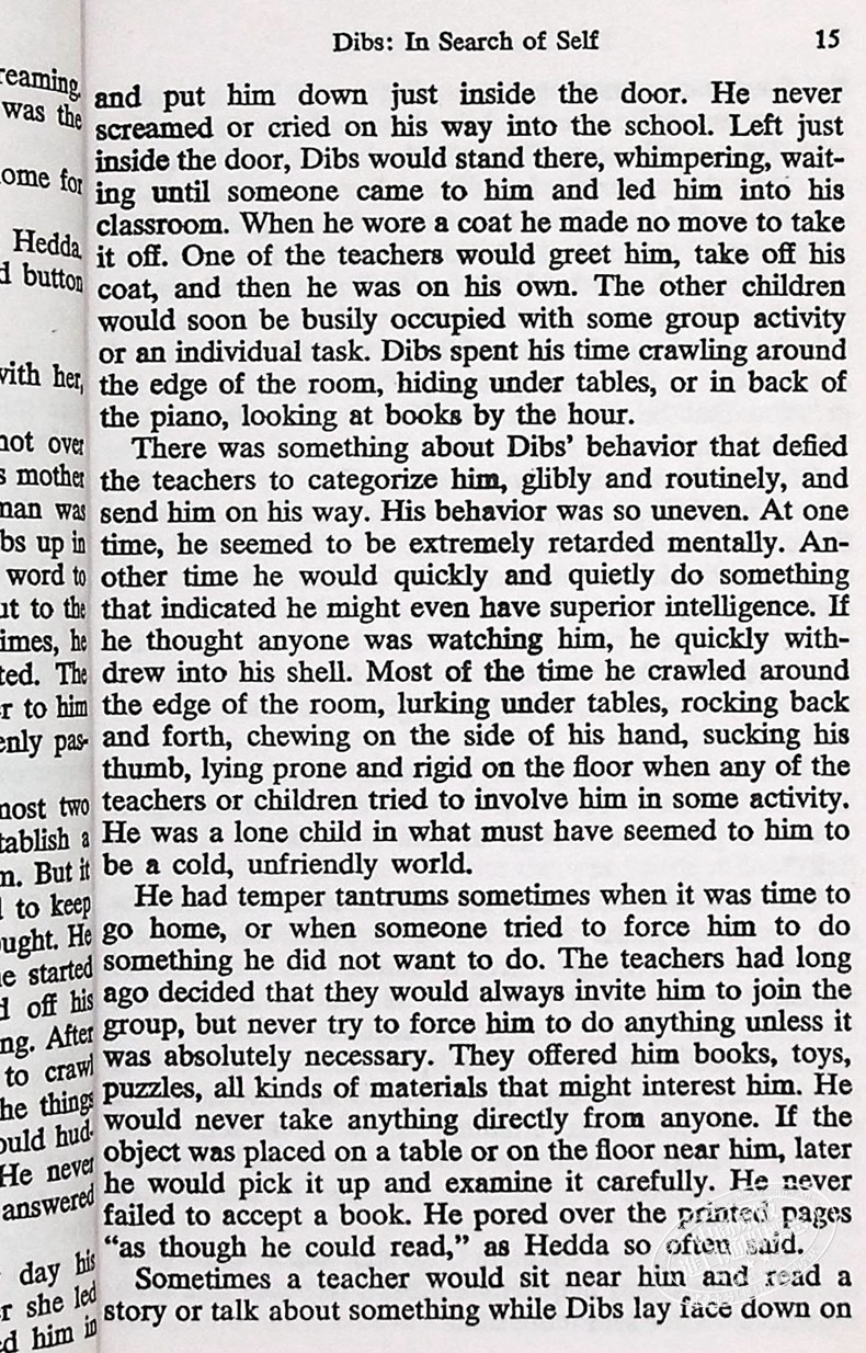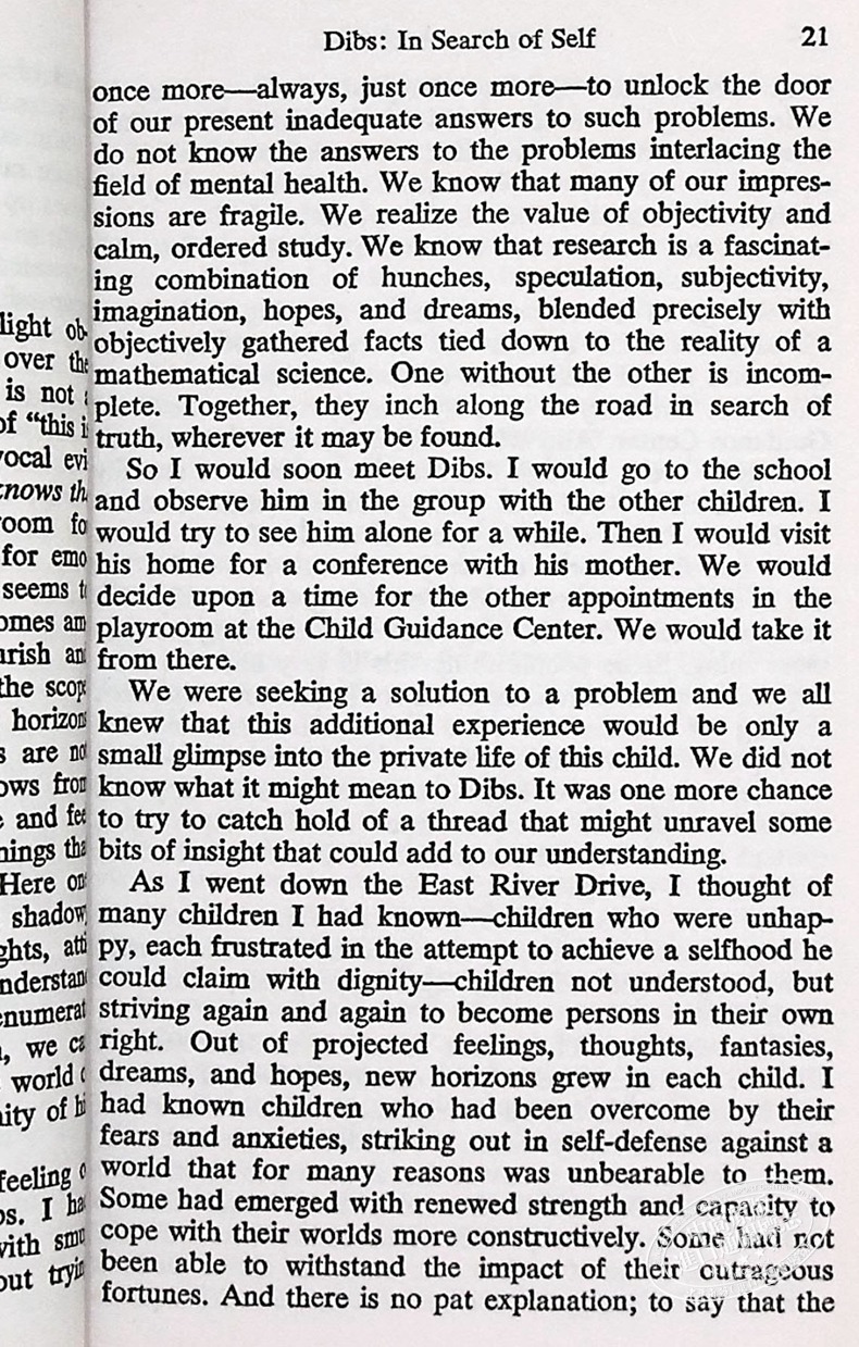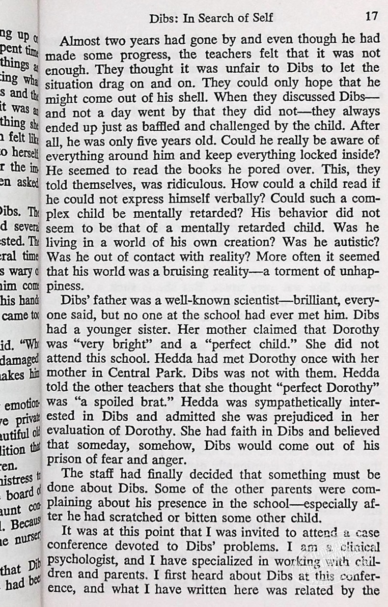 The classic of child therapy. Dibs will not talk. He will not play. He has locked himself in a very special prison. And he is alone. This is the true story of how he learned to reach out for the sunshine, for life . . . how he came to the breathless discovery of himself that brought him back to the world of other children.
