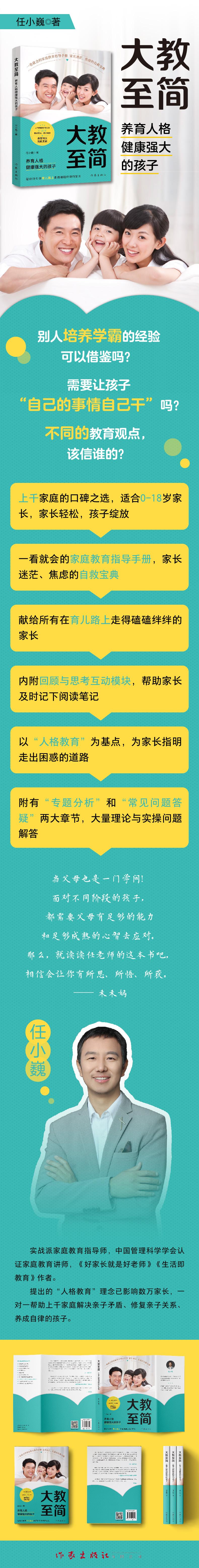 本书为实战派家庭教育指导师任小巍的精华之作,作者旨在修复家庭中的亲子关系,使用“人格教育”理念为养育孩子的终极目标,帮助数万家庭度过紧张的时期、解决家庭矛盾。家庭教育并不是越复杂越有效,很多时候需要家长给教育做减法,作者让家长认清很多有效的教育往往都是简单的方法,所谓的“大教至简”,才能养成人格健全的孩子。