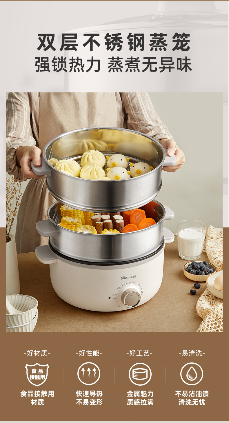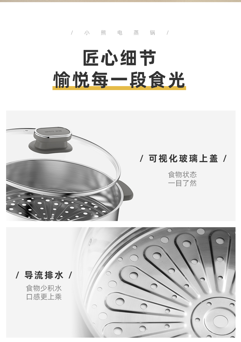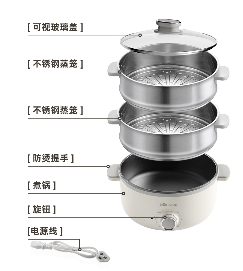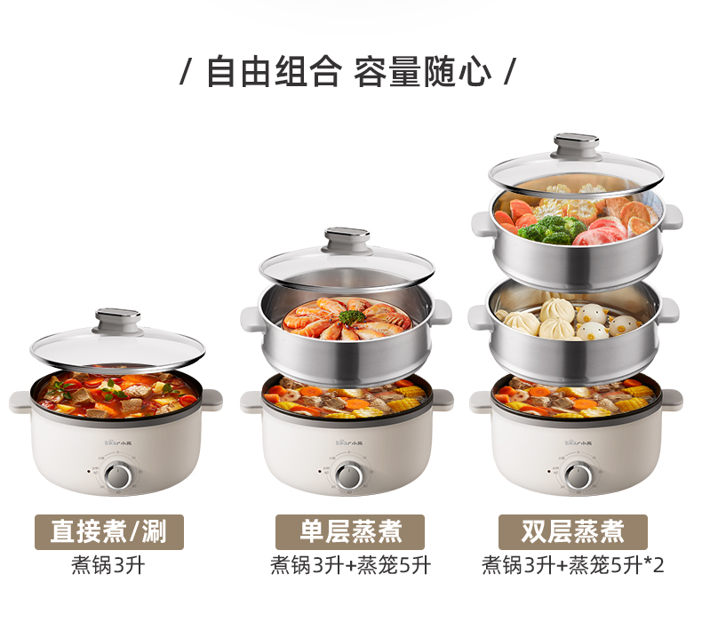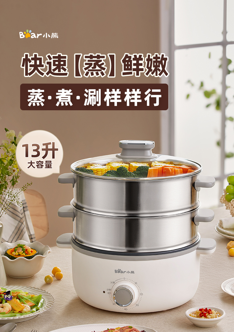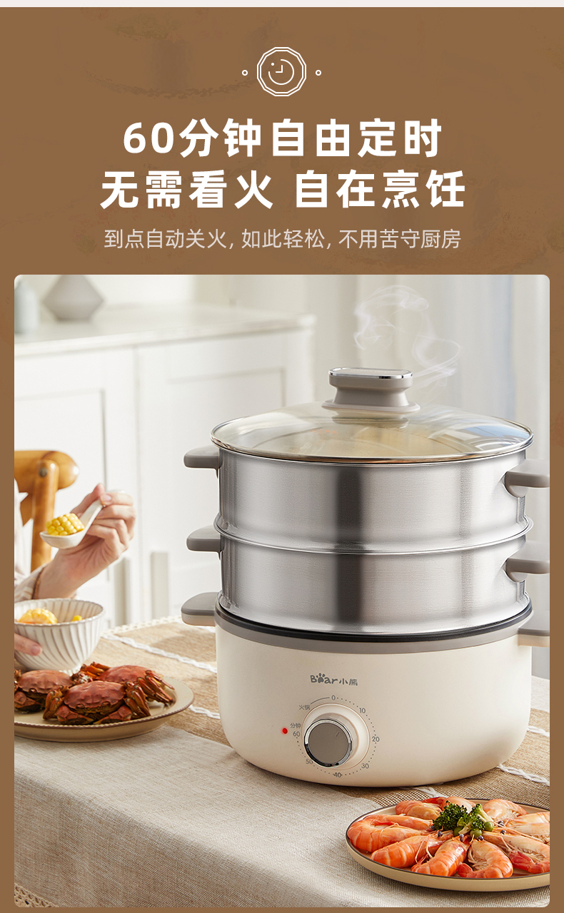 【小程序】小熊电蒸锅 DZG-CA3A1 60分钟定时器+2个5L蒸笼+玻璃盖