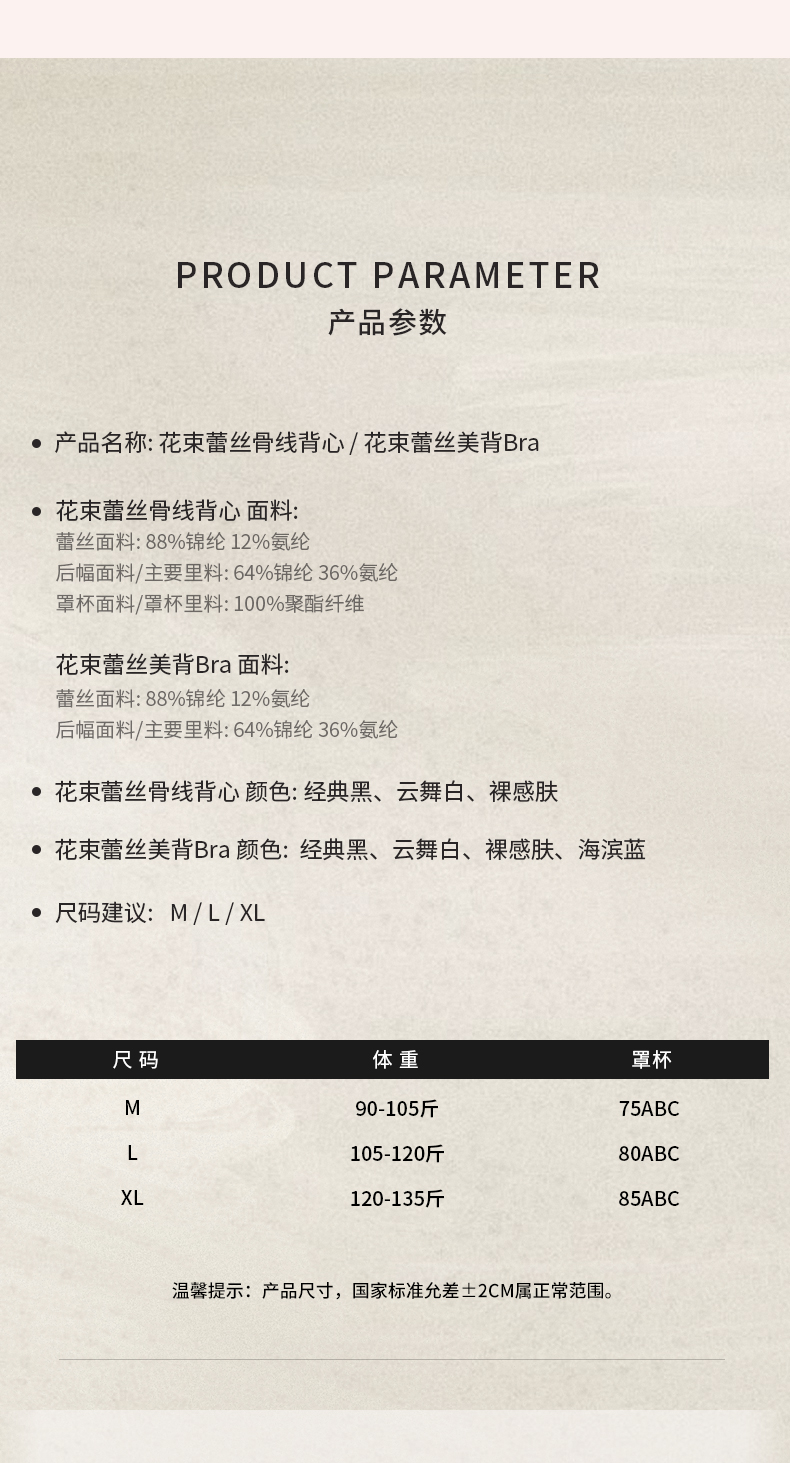 【品名】“下单赠原素感内裤1条”我的花匠Me 花束蕾丝美背/花束蕾丝骨线背心 舒适百搭 【规格】 美背:云舞白、裸感肤、经典黑、海滨蓝 背心:云舞白、裸感肤、经典黑 【尺码】M-XL 【产地】国内 【材质】 美背:蕾丝面料:锦纶88% 氨纶12% 后幅面料/主要面料:锦纶64% 氨纶36% 背心:蕾丝面料:锦纶88% 氨纶12% 后幅面料/主要面料:锦纶64% 氨纶36% 罩杯面料/罩杯里料:聚酯纤维100% 【发货包装】独立包装 【发货地】广东 【发货快递】中通 【补邮费地区】新疆、西藏+20元 【发货时效】48-72小时,周末节假日顺延 |