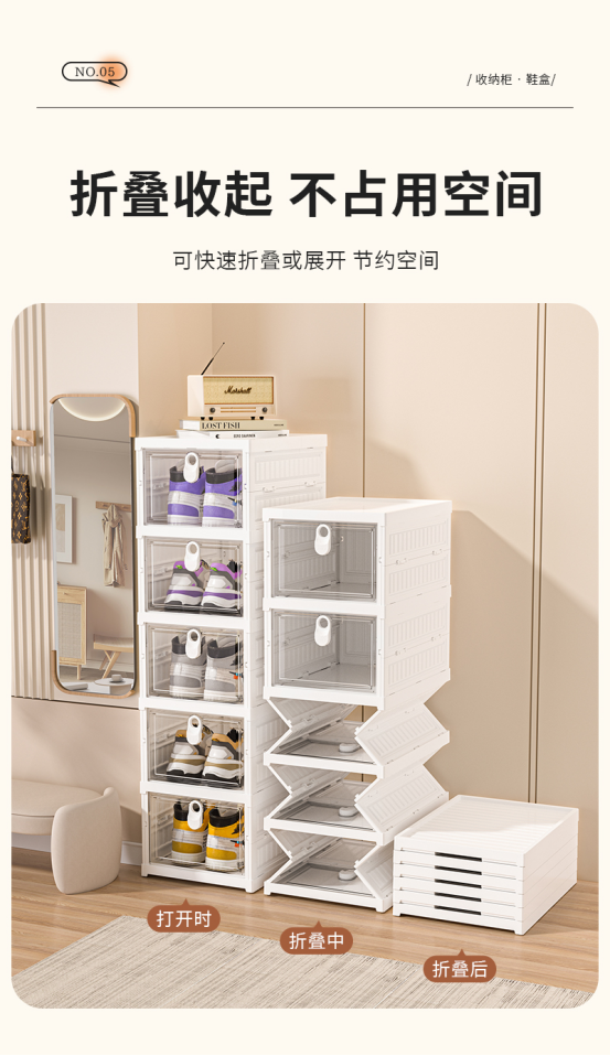 谁不是拥有十几双甚至几十双的存货?既面临换季来回翻找的痛苦,又面临收纳整洁的问题。 尤其是AJ限量款和长筒靴子,家中各种角落堆得乱七八糟,落了灰尘不说,互相挤压着都变形了,简直成了“车祸现场”。 此时你需要一款「折叠鞋柜」来拯救你!专为解决凌乱的鞋子收纳问题而设计,透明可视化分类清晰,一目了然,且储物便捷、防尘防潮,鞋子多必备