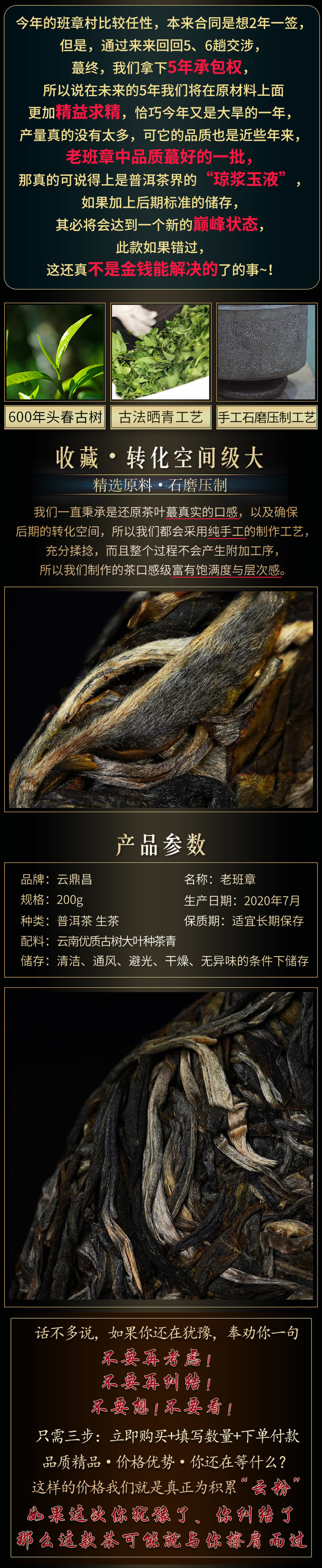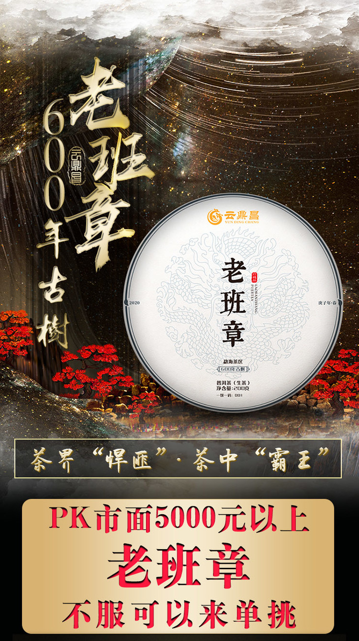 【库存不多了】云鼎昌【老班章】2020普洱茶生茶勐海600年古树纯料茶叶饼茶茶王,200克/饼