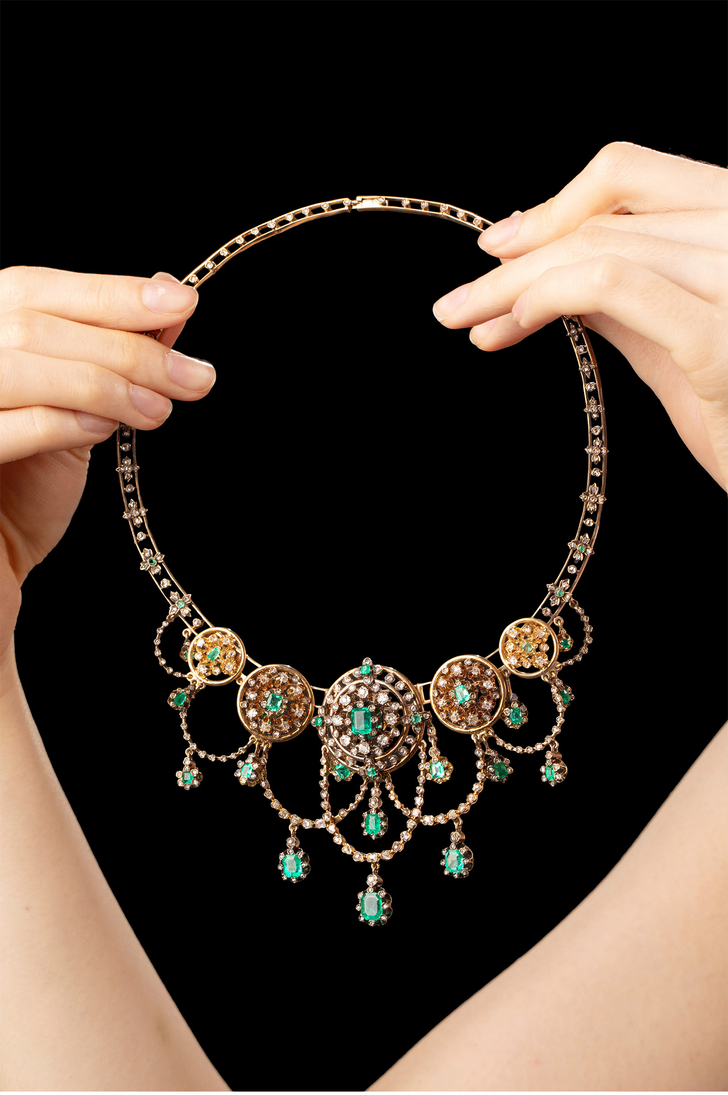 独角鹿西洋古董 1880年代法国珠宝世家出品垂花帷幔式18K黄金镶嵌祖母绿与钻石珠宝套件 带原盒
