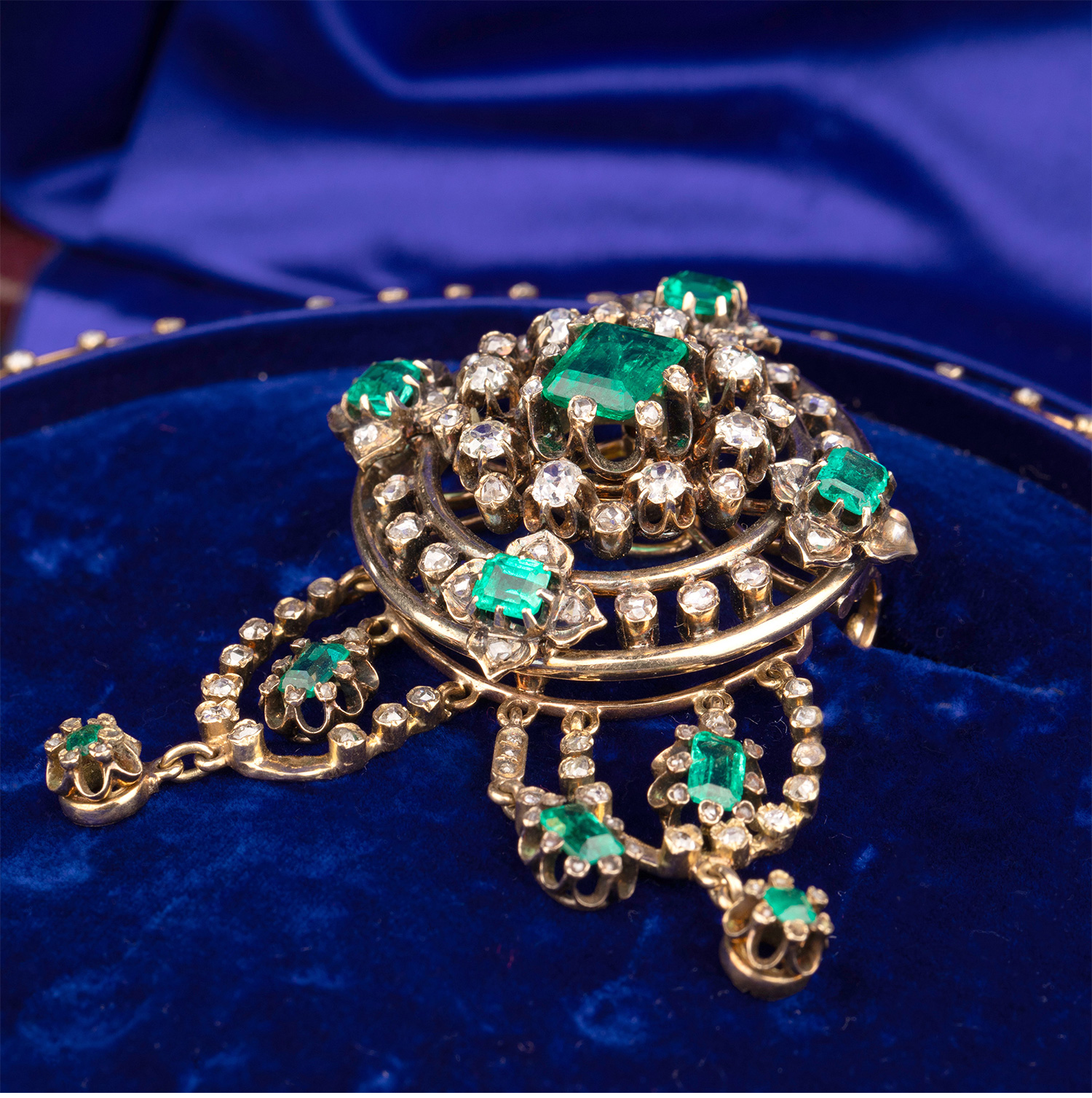 1880年代法国珠宝世家出品垂花帷幔式18K黄金镶嵌祖母绿与钻石珠宝套件 带原盒
