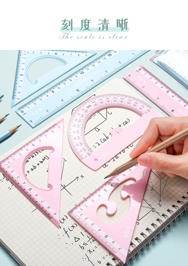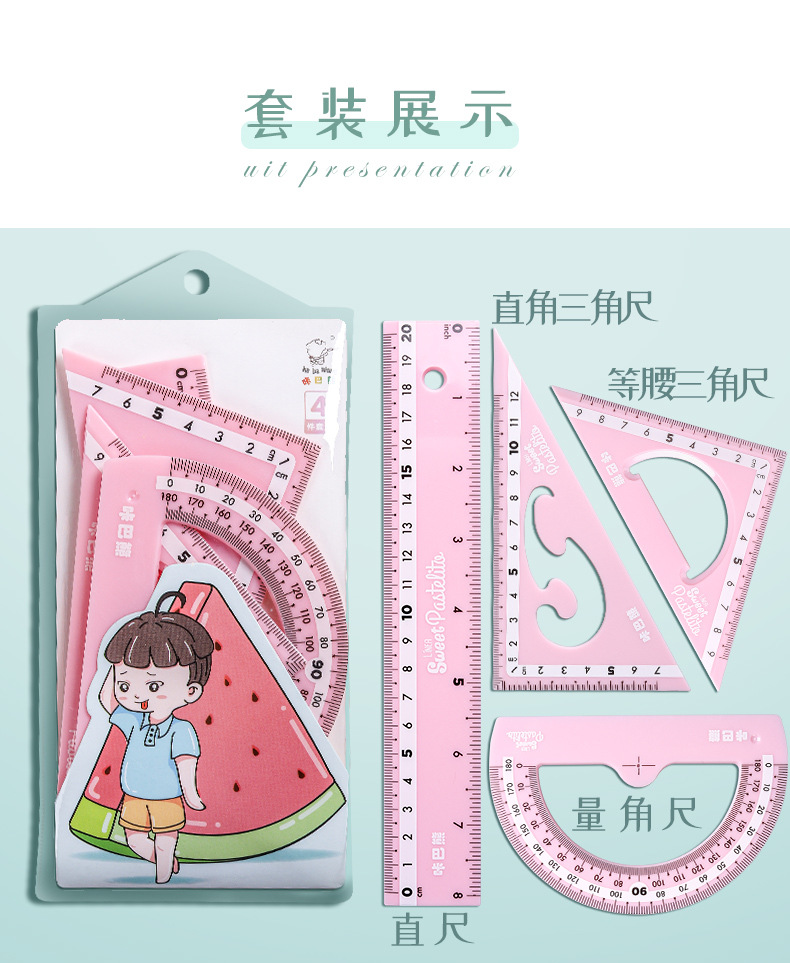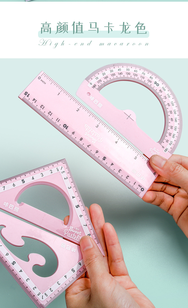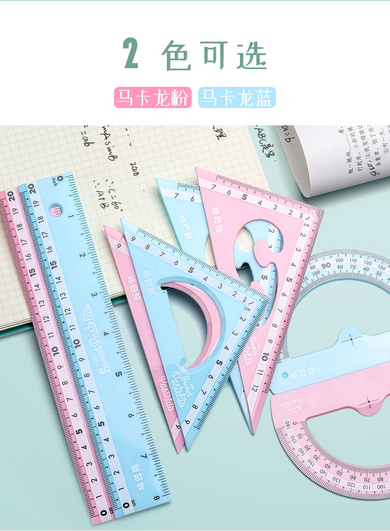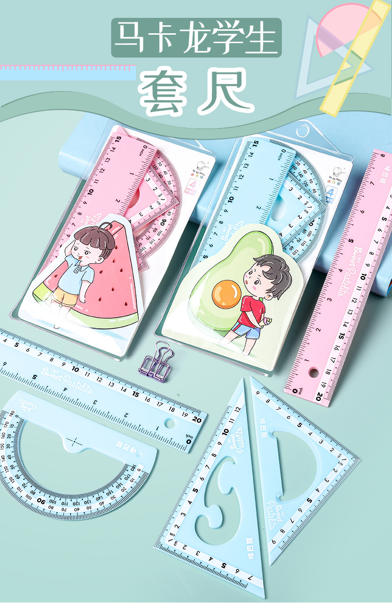 【马卡龙4件套尺子】彩色尺子文具四件套学生用塑料直尺三角尺带波浪线量角器儿童多功能套尺日韩可爱用品圆规套装ins风女