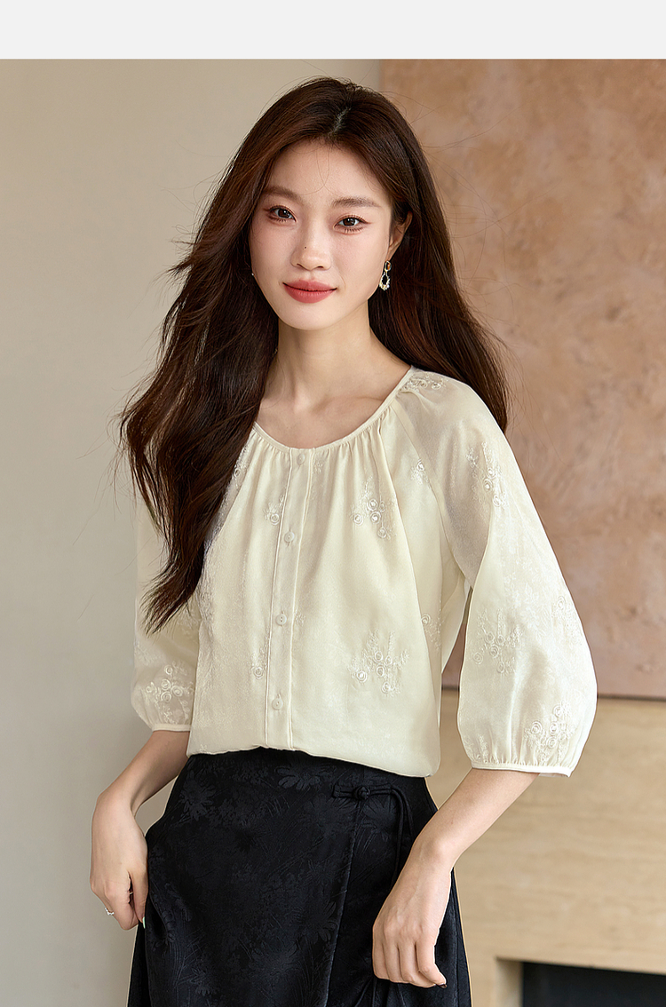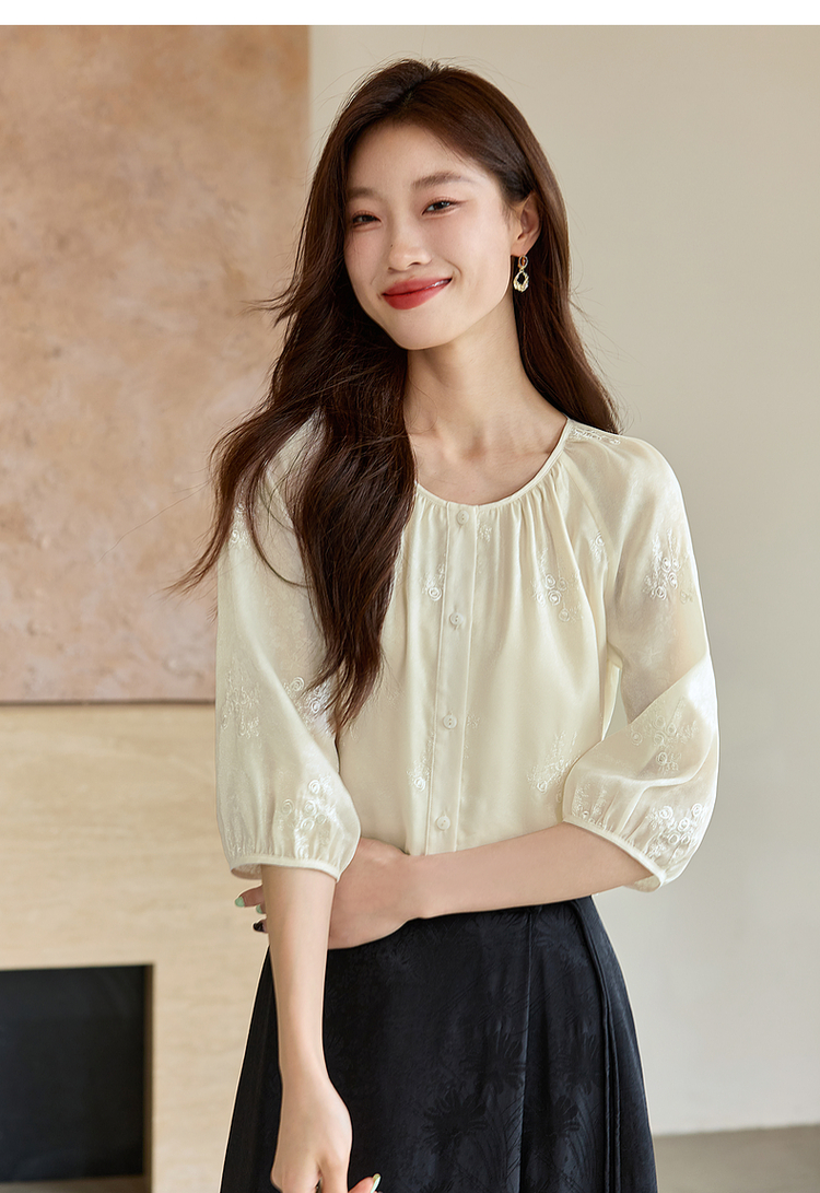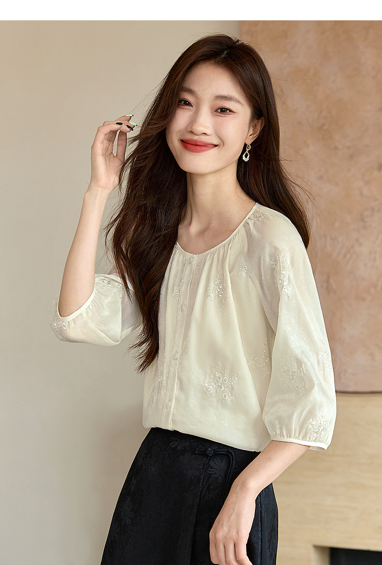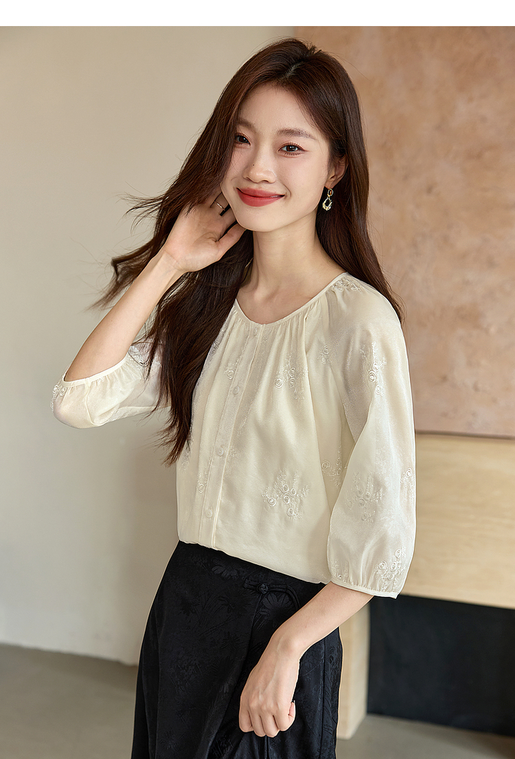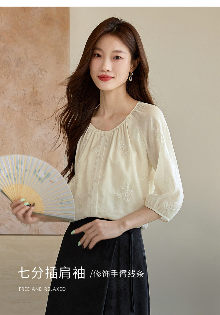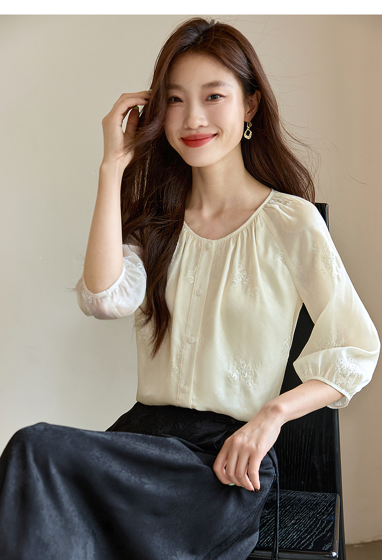 【1件62折】熙世界重工刺绣雪纺衬衫2025早秋新款欧根纱圆领小衫七分袖上衣