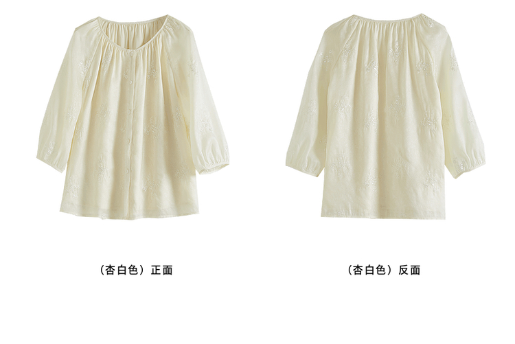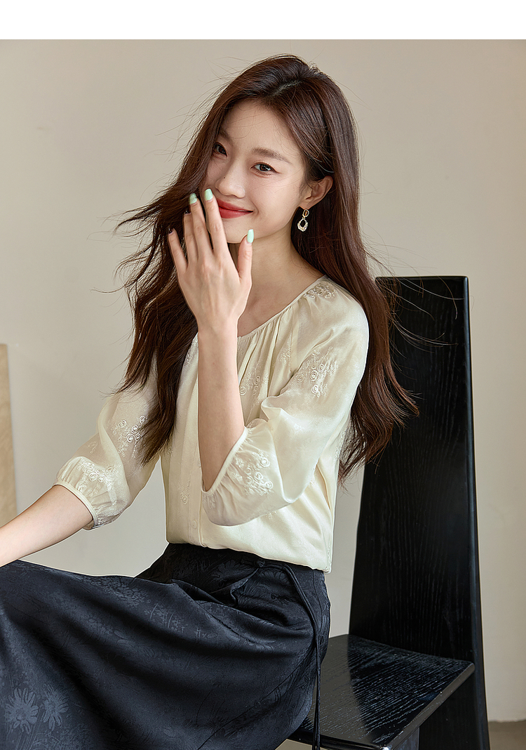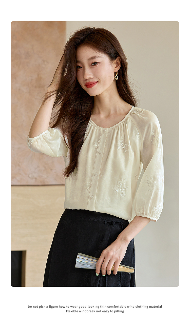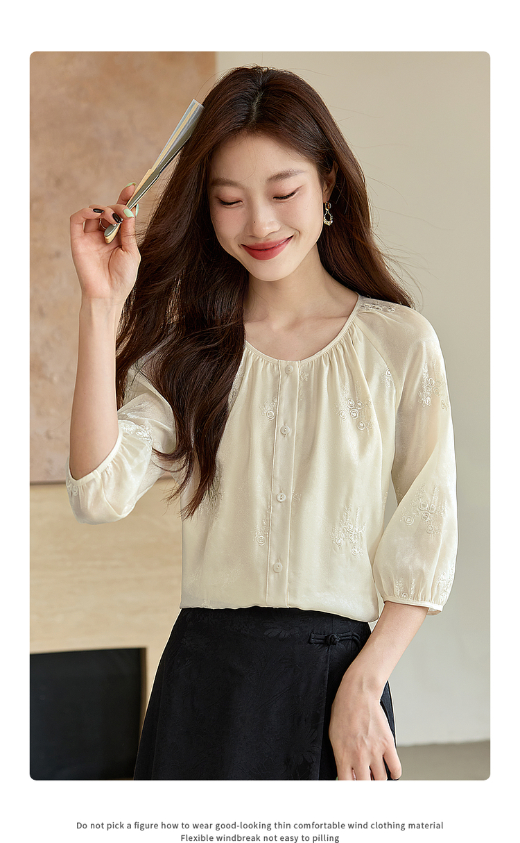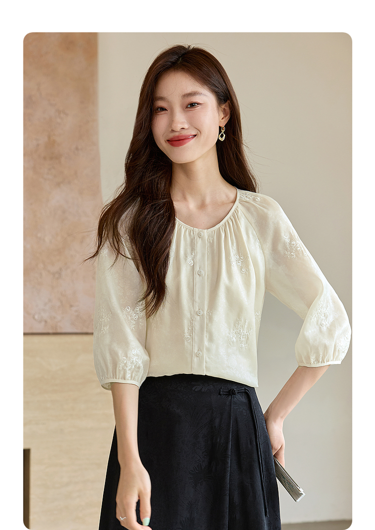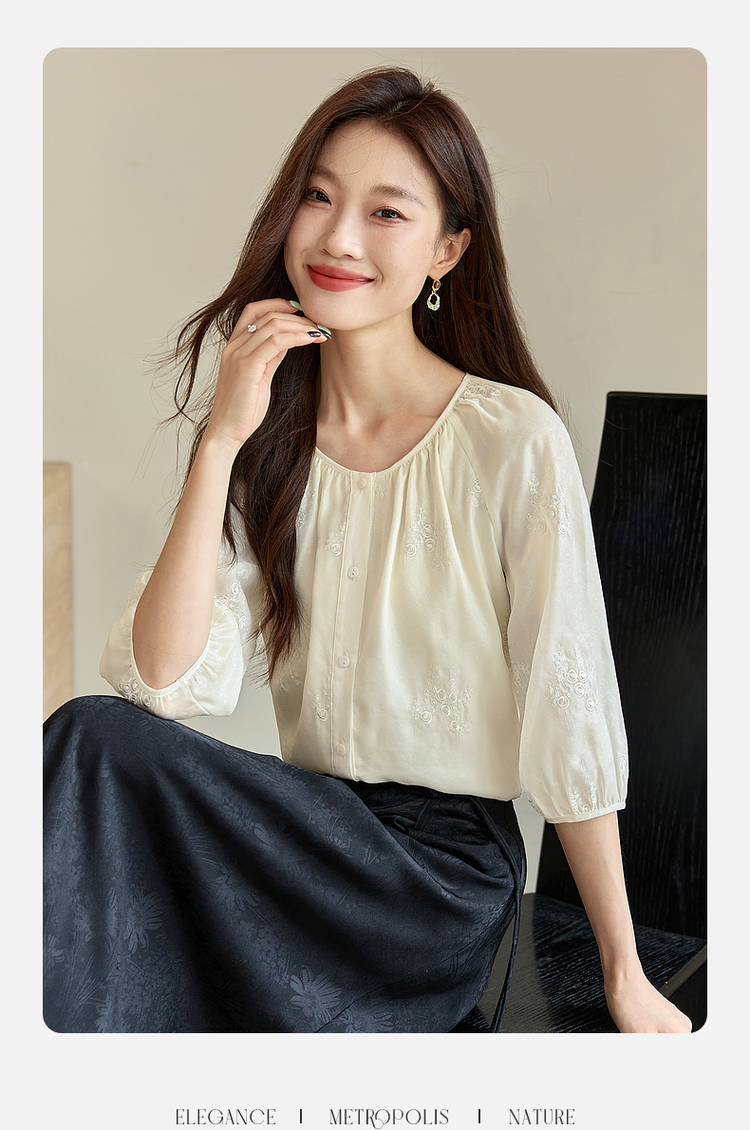 【1件62折】熙世界重工刺绣雪纺衬衫2025早秋新款欧根纱圆领小衫七分袖上衣