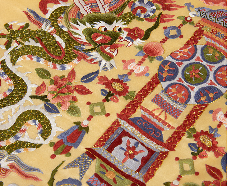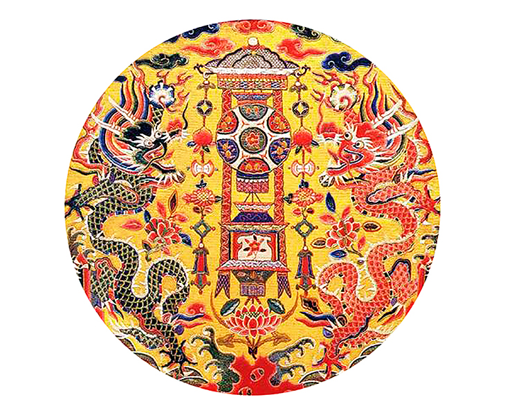 [双龙五谷丰登]以宫灯,双龙,云纹,海水江崖构成图案,颜色则根据刺绣的不同面料,配以盘金双龙和红绿彩色双龙。 宫灯旁悬挂谷穗果实,四周穿插以蜜蜂,利用汉字的谐音,借“灯”寓“登”,借“蜂”寓“丰”,隐喻为“五谷丰登”,也是庆丰收之意。而龙一直以来被认为最高的祥瑞,代表着吉祥美满。故《双龙五谷丰登》则是“彩龙兆祥,民富国强”,祈祥纳福,吉祥美满,爱情事业双丰收之意。