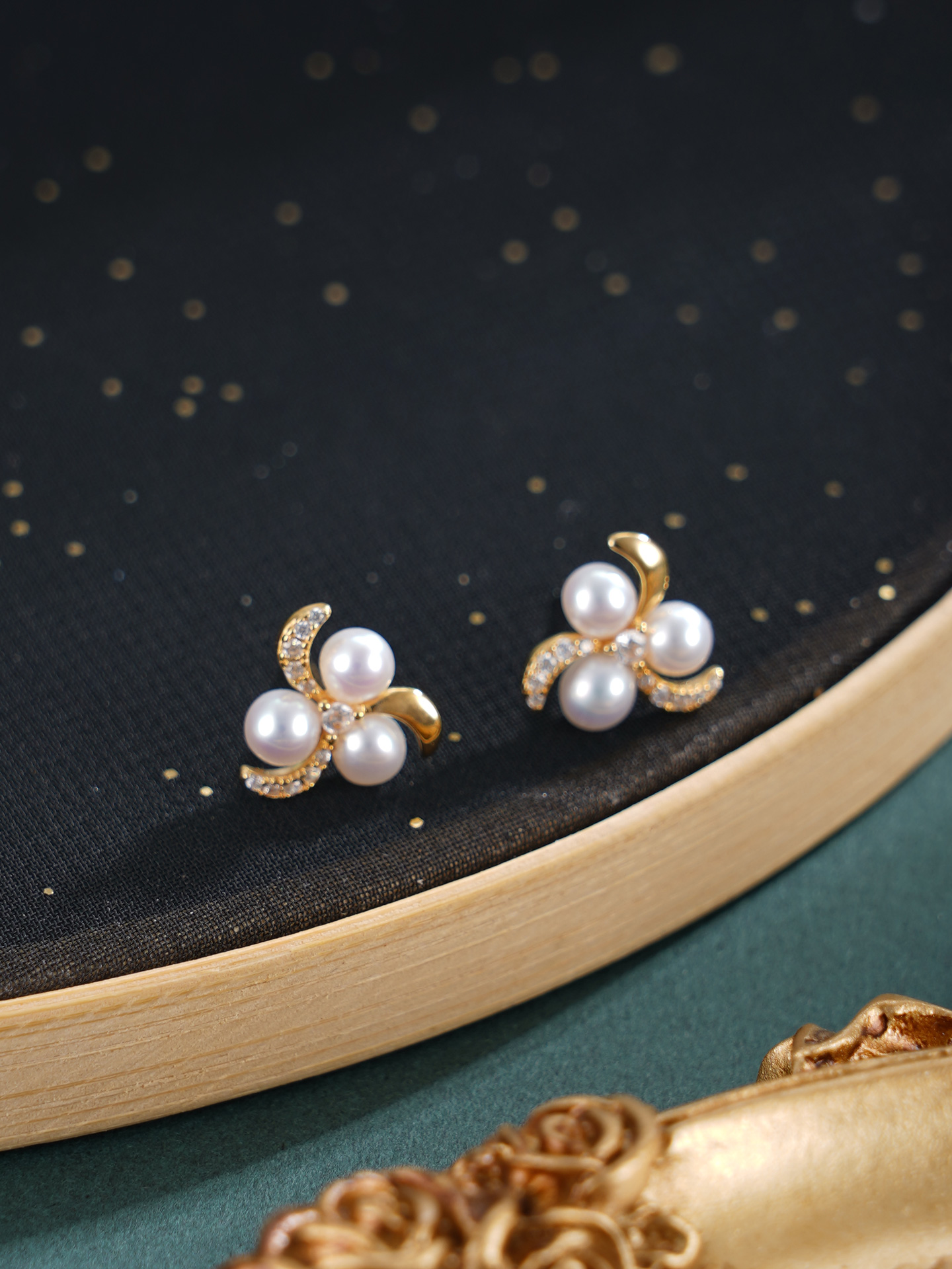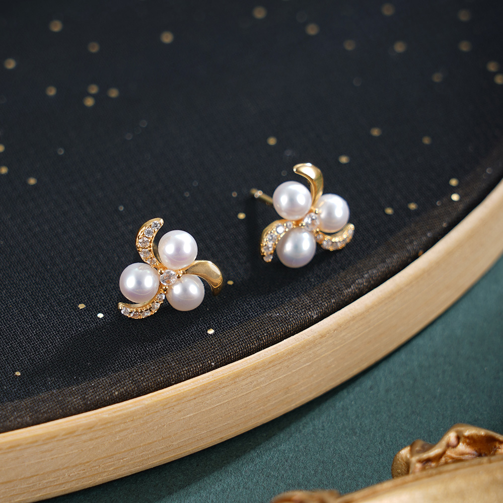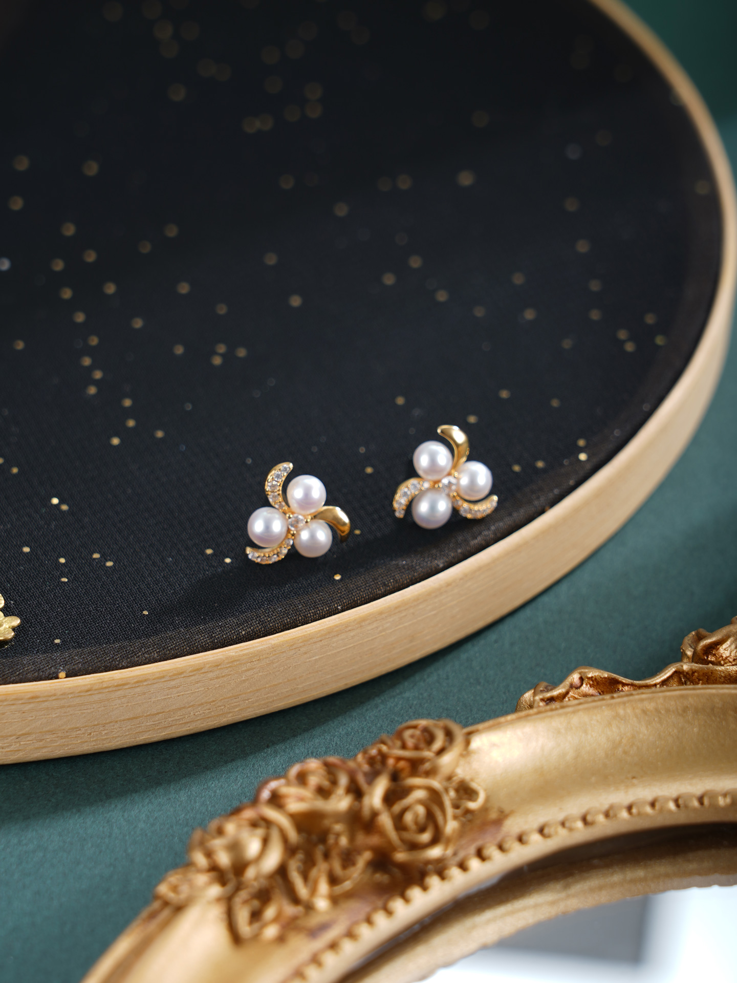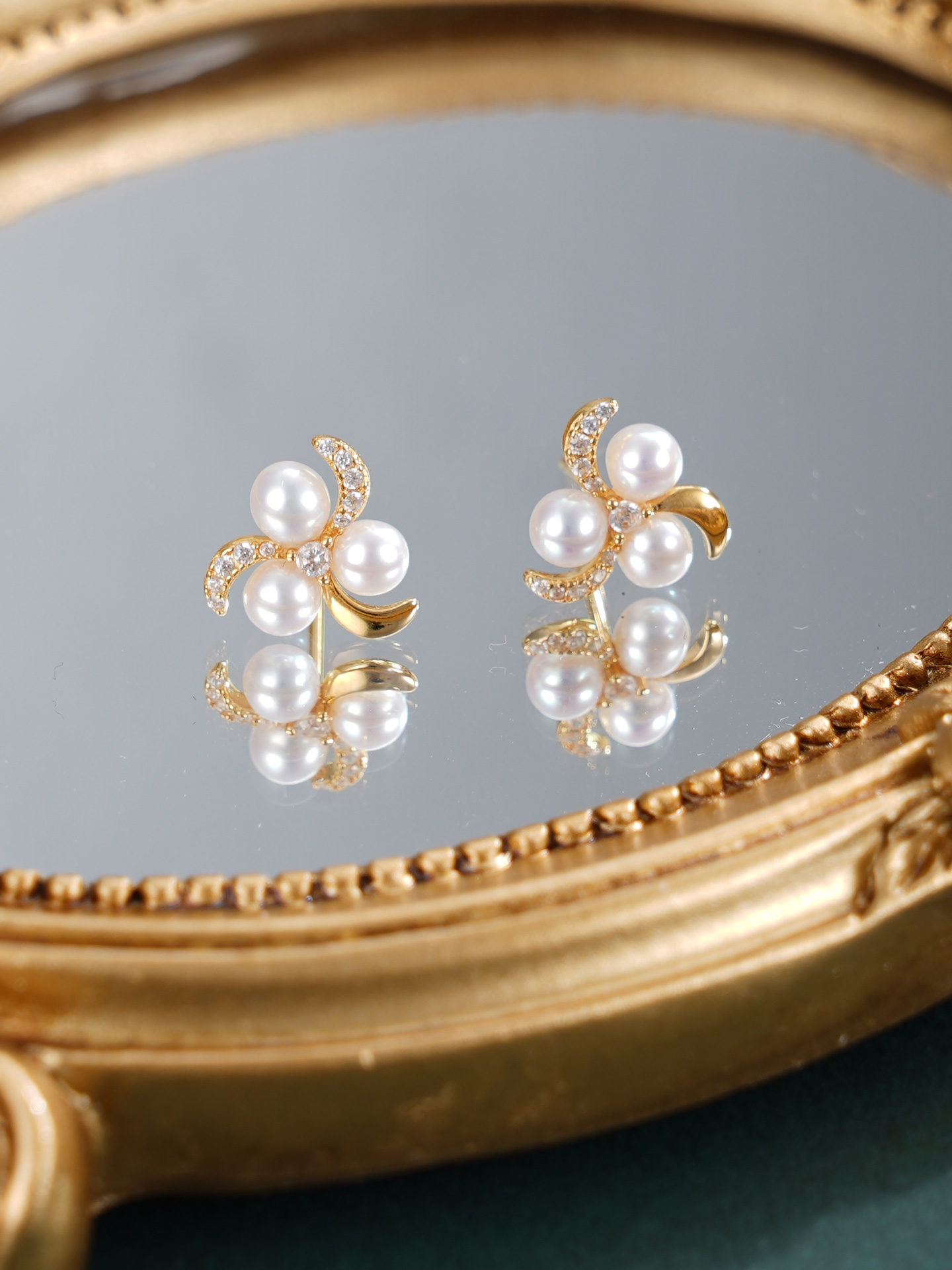 子佩集【风车漫旋】银S925珍珠惜王妃耳钉【MLEH029】3.8mm珠镀金风车三瓣花2601