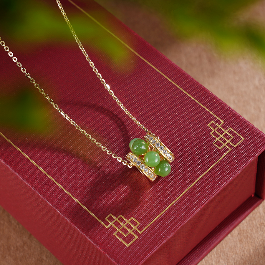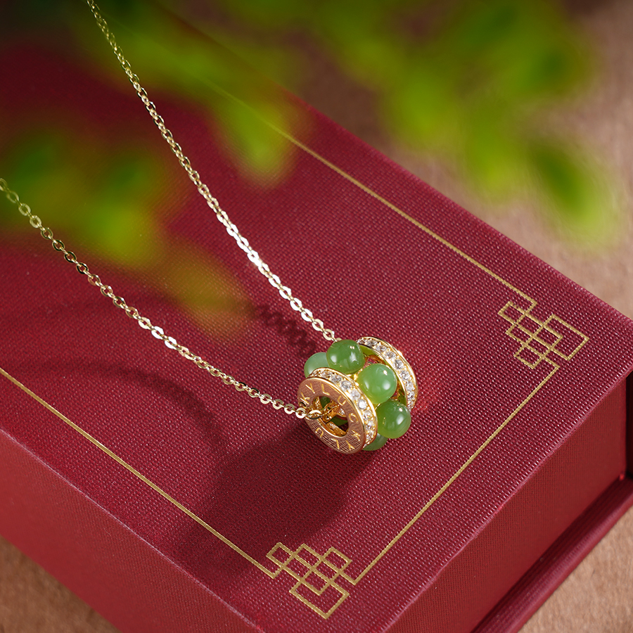 【寓意】:一款具有动感的滚珠吊坠,和田碧玉环绕镶嵌,流转着春日生机。寓意好运流转,诸邪退避。