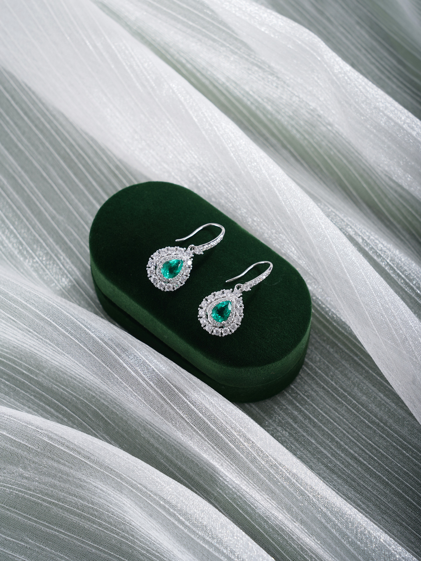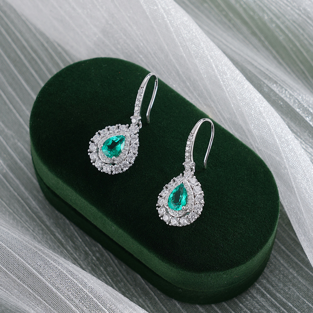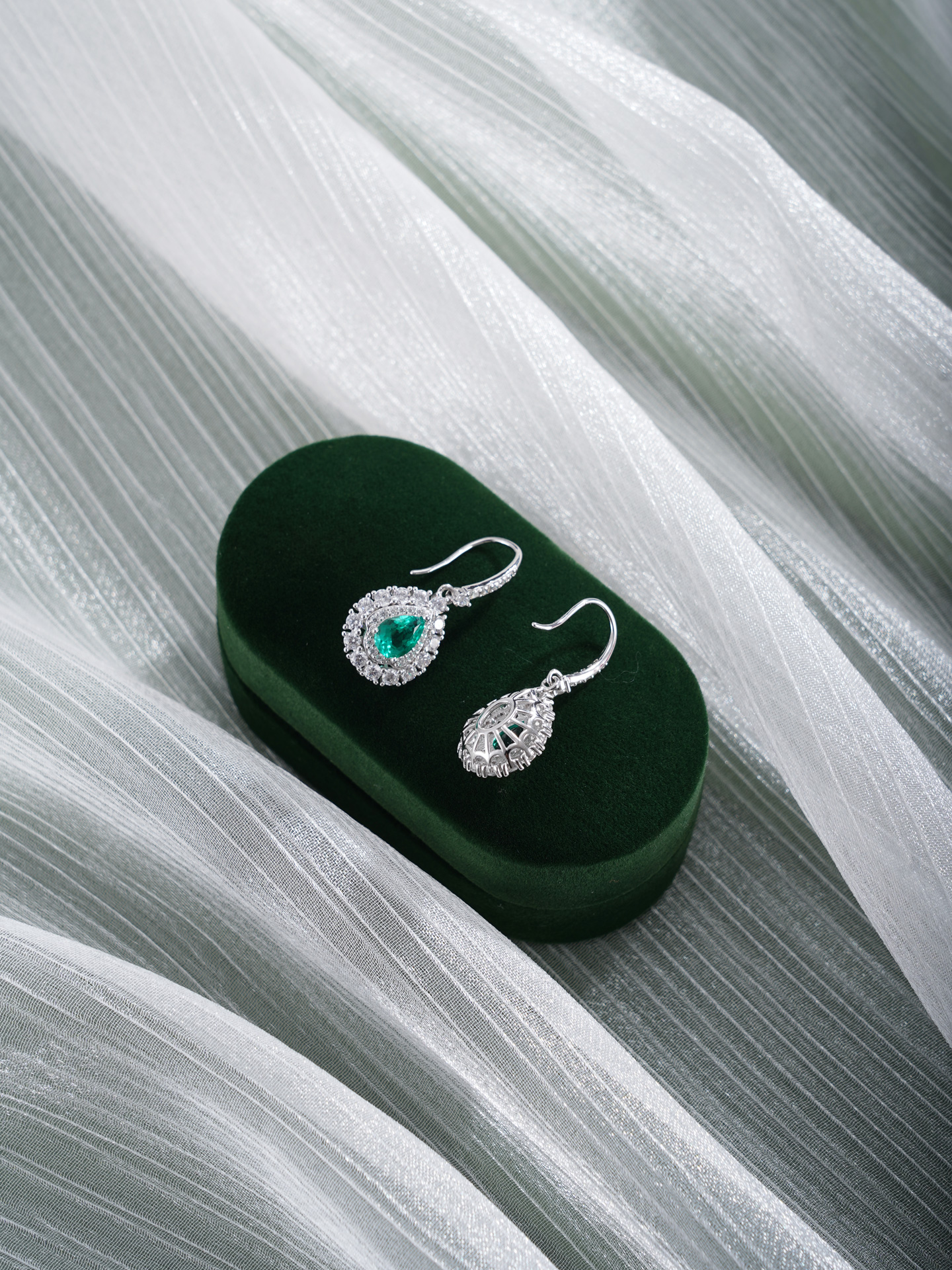 【寓意】:以纯银精铸水滴形耳环,白色锆石搭配祖母绿错落镶嵌,如晨露凝结的薄荷叶尖,在光晕中流转着清新与灵动。寓意生机焕发、福运如春。