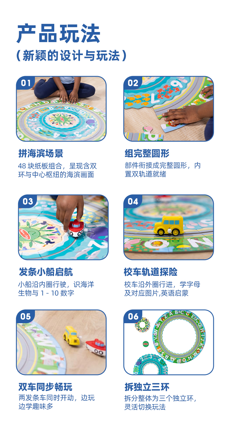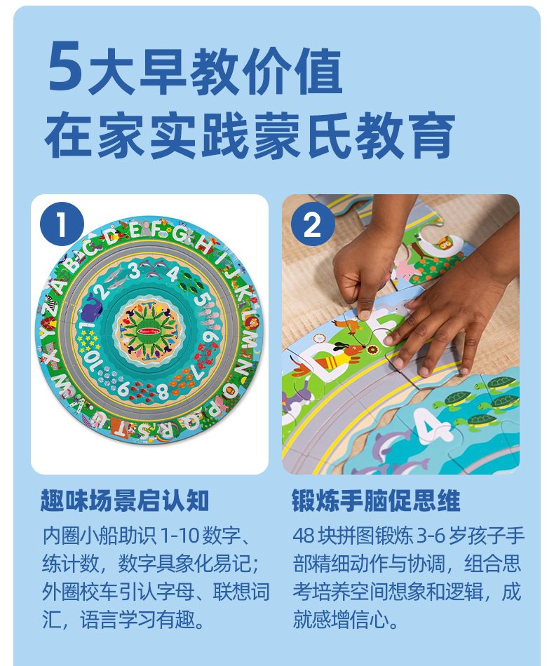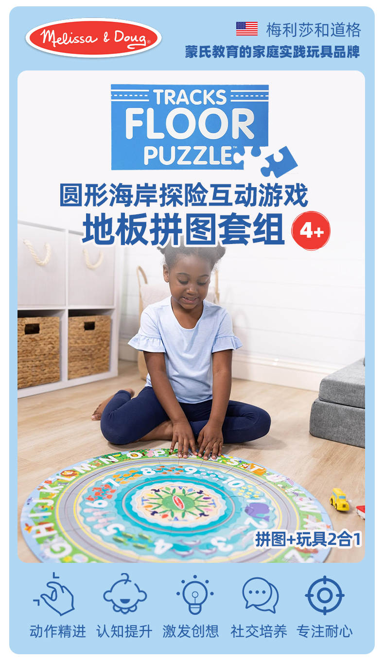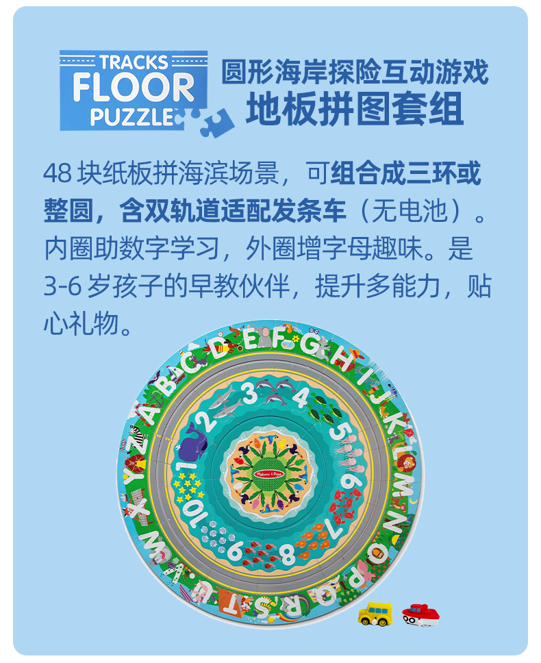 *美国Melissa&Doug圆形海岸探险互动游戏地板拼图套组(纸质+2辆轨道小车)儿童幼儿拼图益智玩具