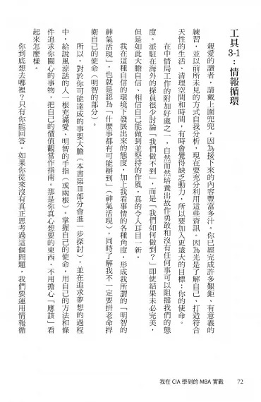 →每次面對人生重大選擇,都優先選擇最令人想像不到的那條路走,與其選擇最沒有風險、最睿智的選擇,我反而選擇了一趟精彩的冒險旅程,再運用在中情局學到的思維與方法,完成它!