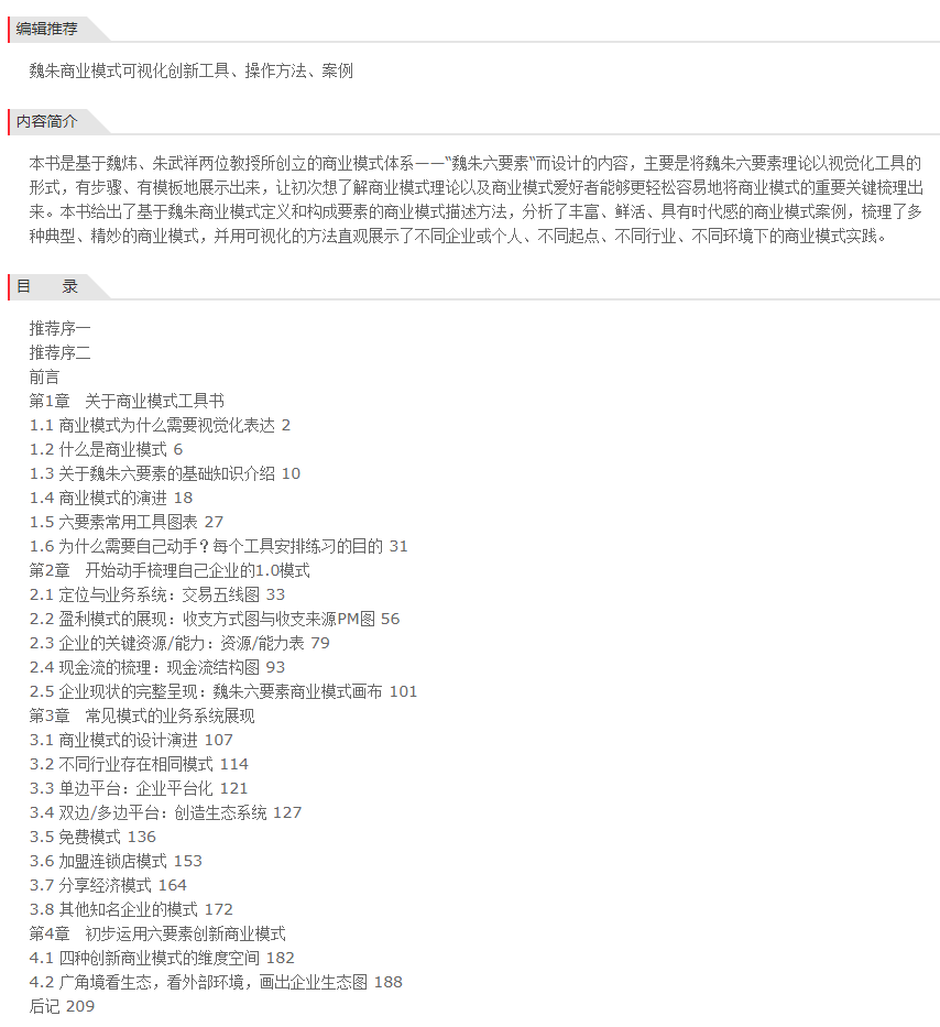 本书是基于魏炜、朱武祥两位教授所创立的商业模式体系——“魏朱六要素“而设计的内容,主要是将魏朱六要素理论以视觉化工具的形式,有步骤、有模板地展示出来,让初次想了解商业模式理论以及商业模式爱好者能够更轻松容易地将商业模式的重要关键梳理出来。本书给出了基于魏朱商业模式定义和构成要素的商业模式描述方法,分析了丰富、鲜活、具有时代感的商业模式案例,梳理了多种典型、精妙的商业模式,并用可视化的方法直观展示了不同企业或个人、不同起点、不同行业、不同环境下的商业模式实践。
