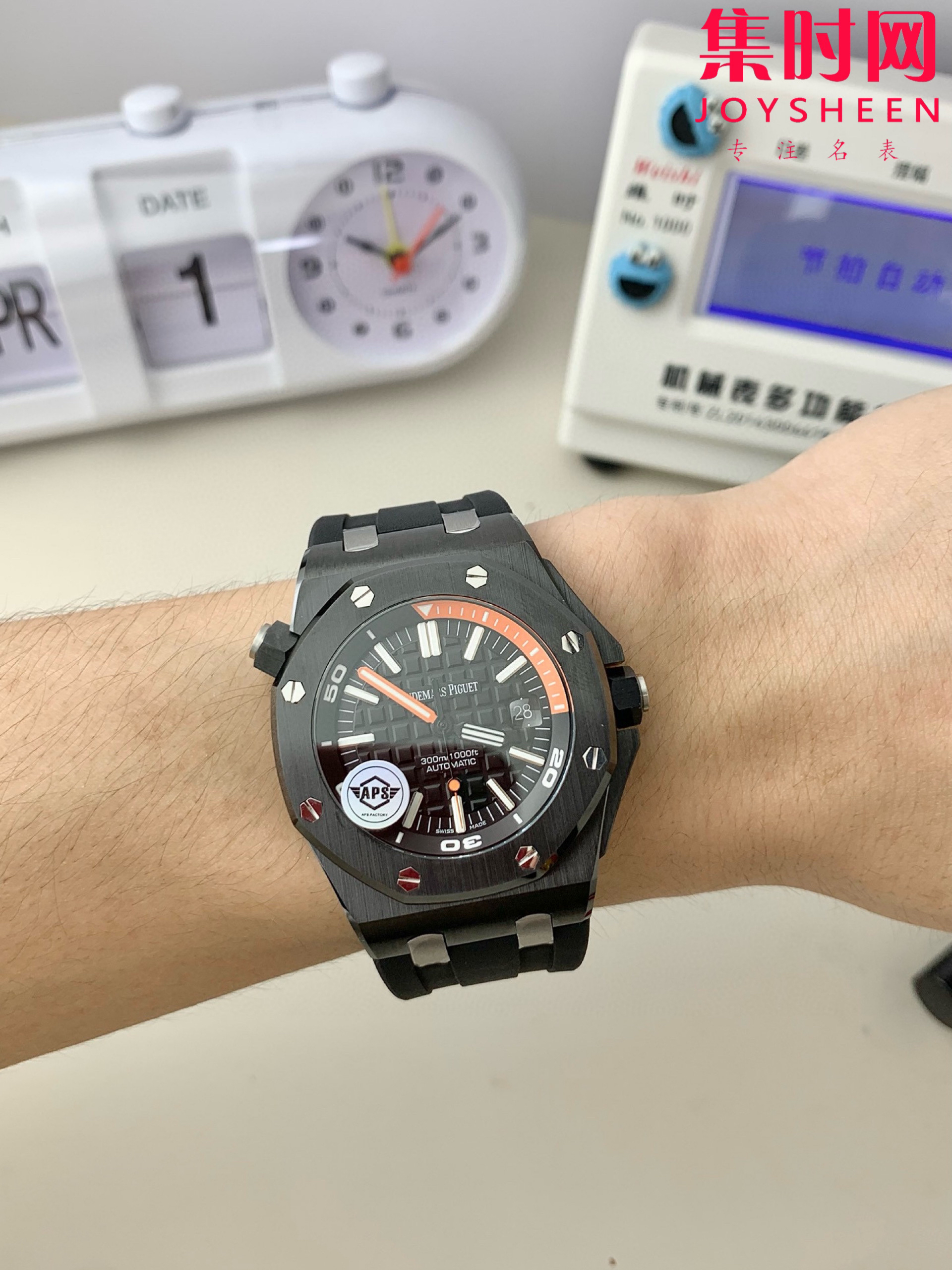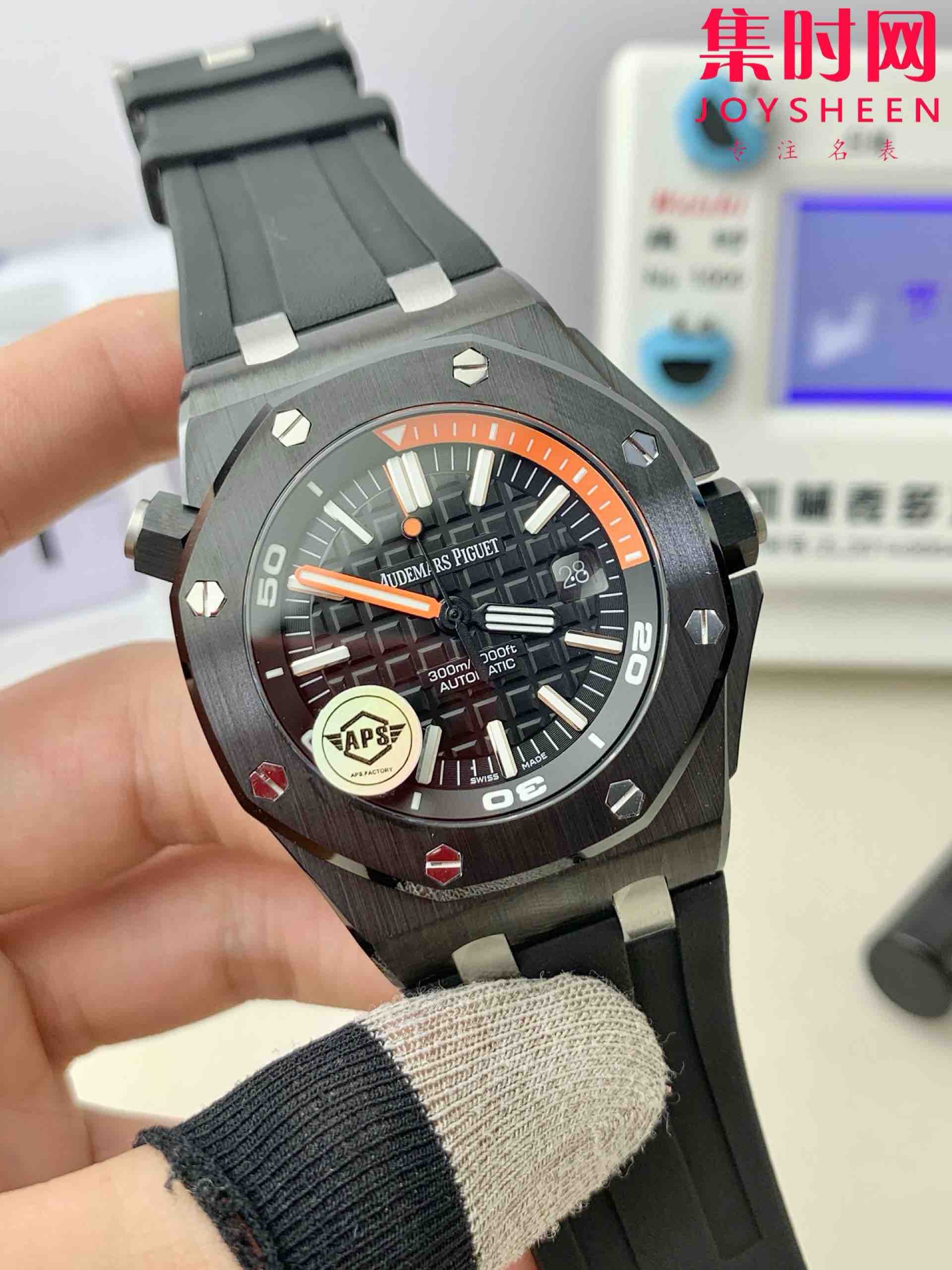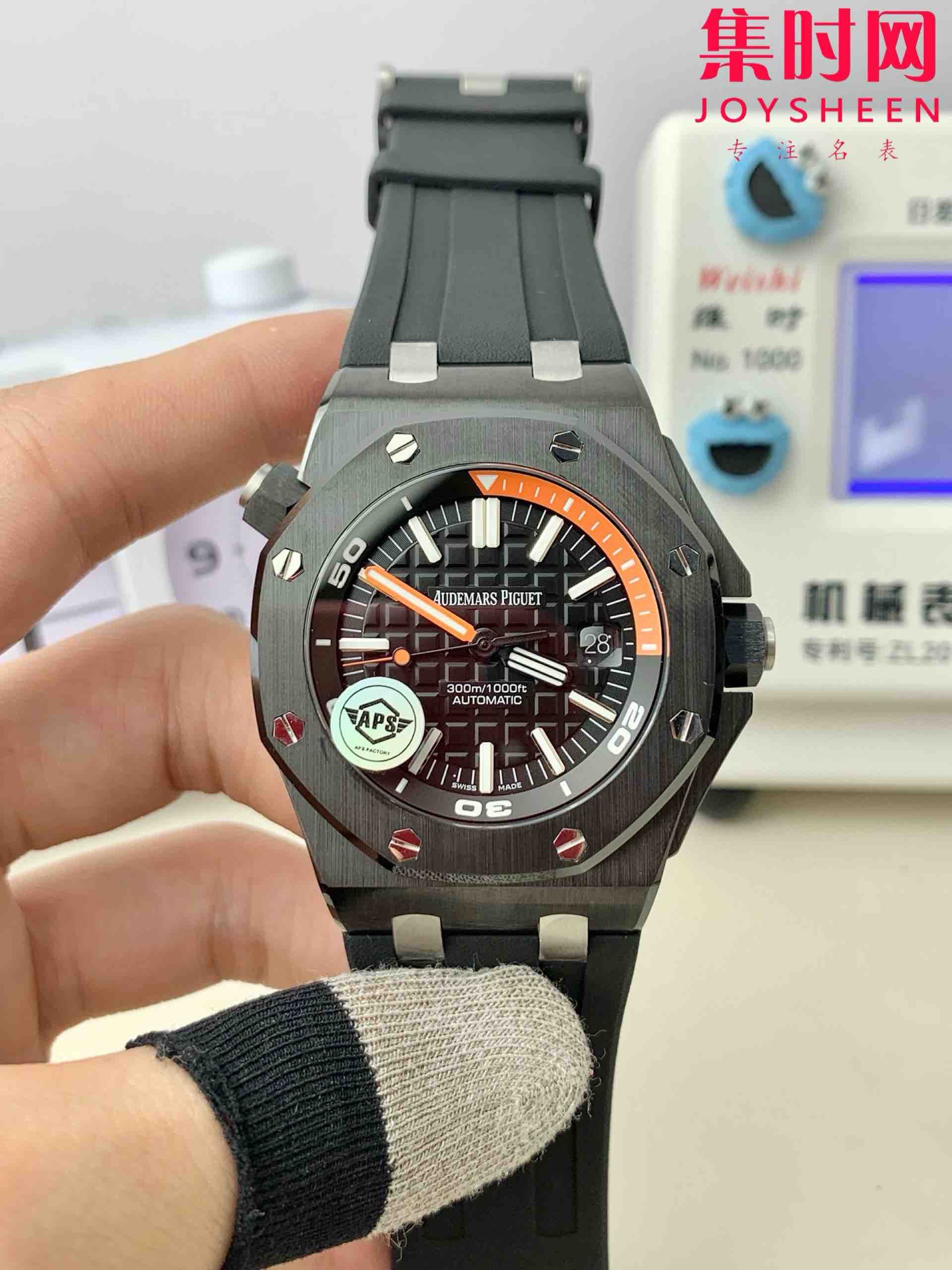 3⃣️字面: 表盘同样采用黑色调和橙色15分钟计时完美协调,表盘采用超大格纹装饰,搭配白金荧光立体时标和皇家橡树指针,橙色旋转内表圈搭配潜水刻度和蓝色60-15分钟区域与原装一致