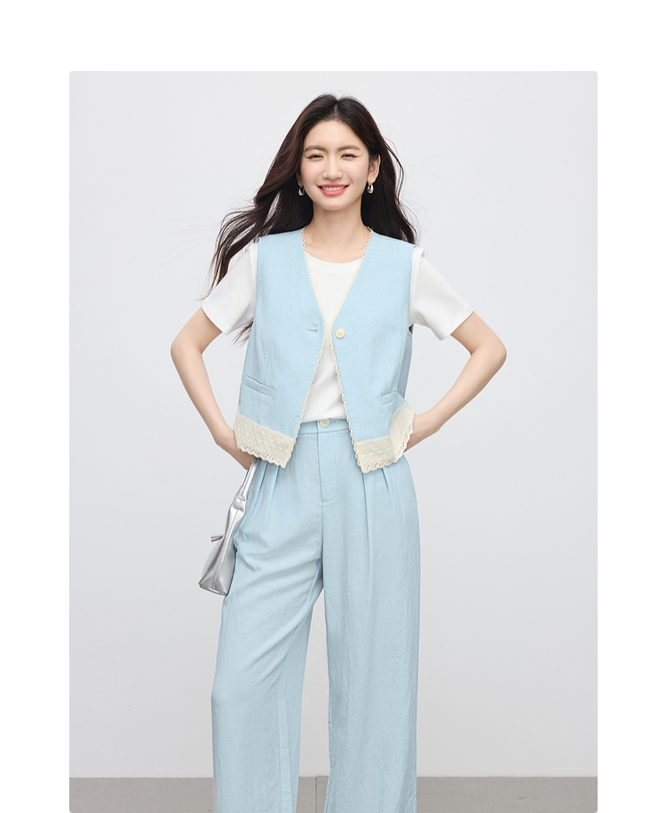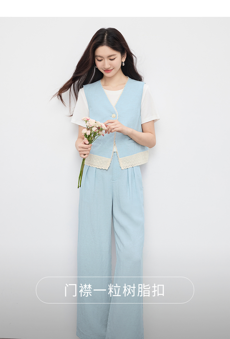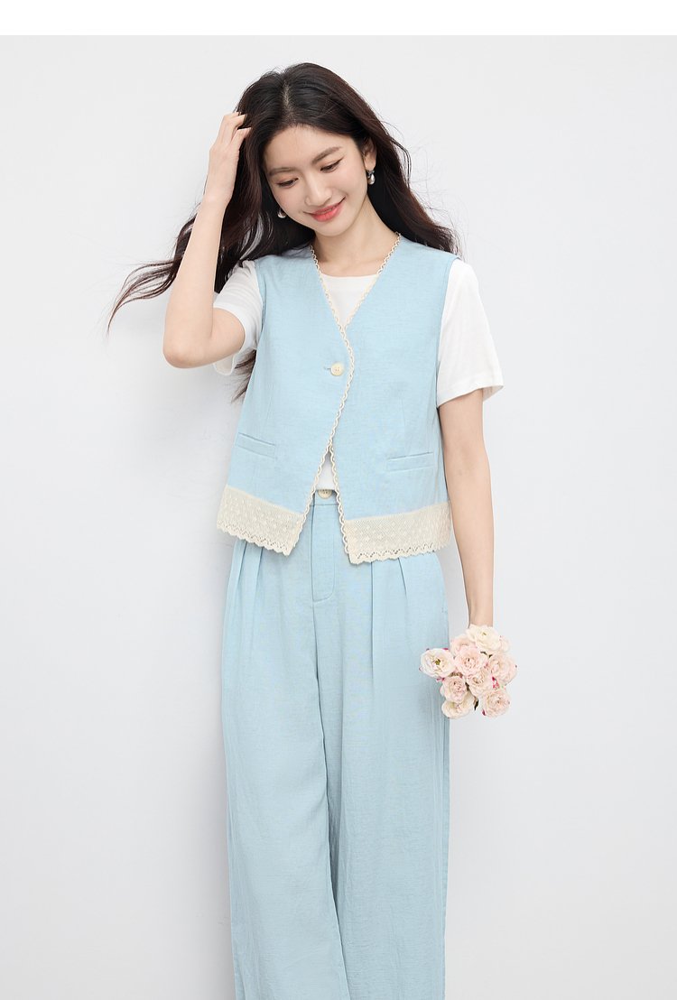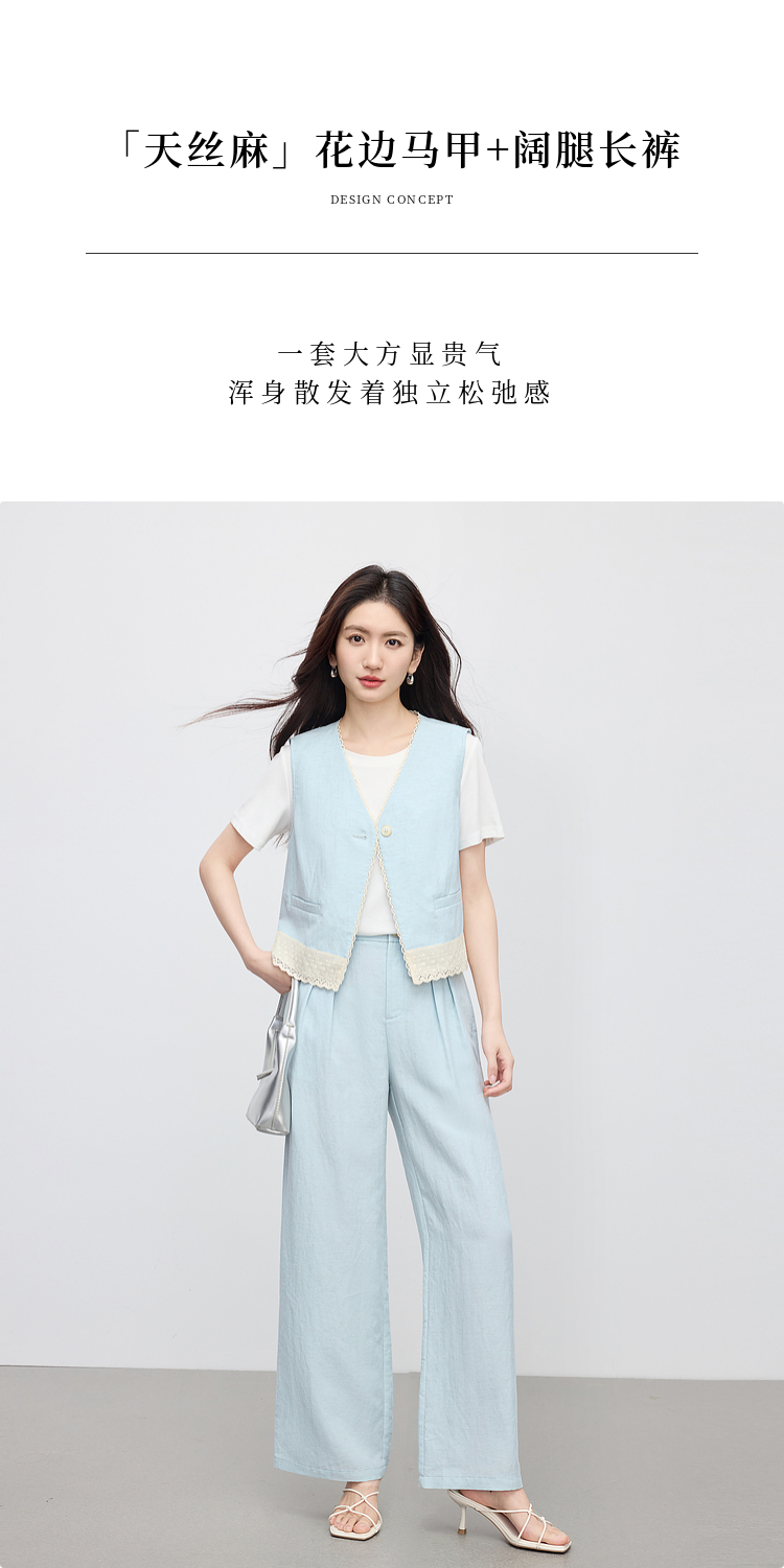【07/30新品6.5折】熙世界小香风套装女夏季高级感天丝亚麻花边马甲休闲阔腿裤两件套