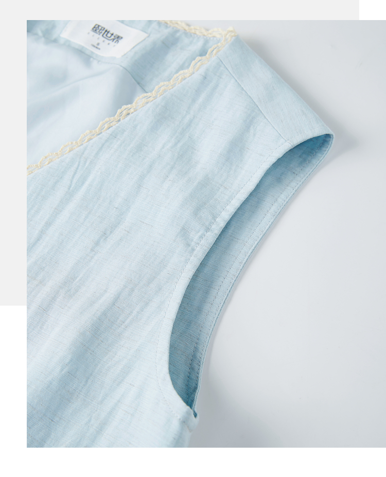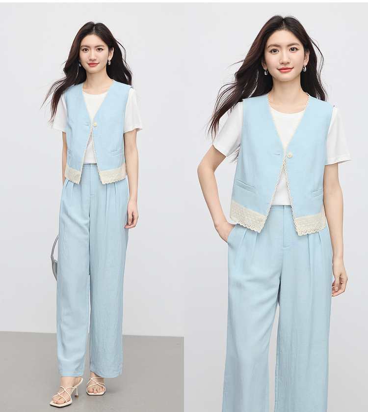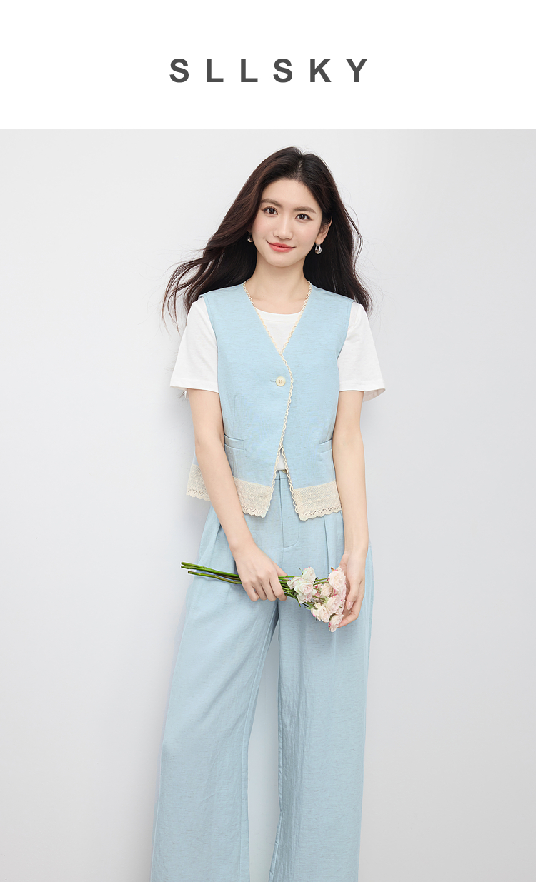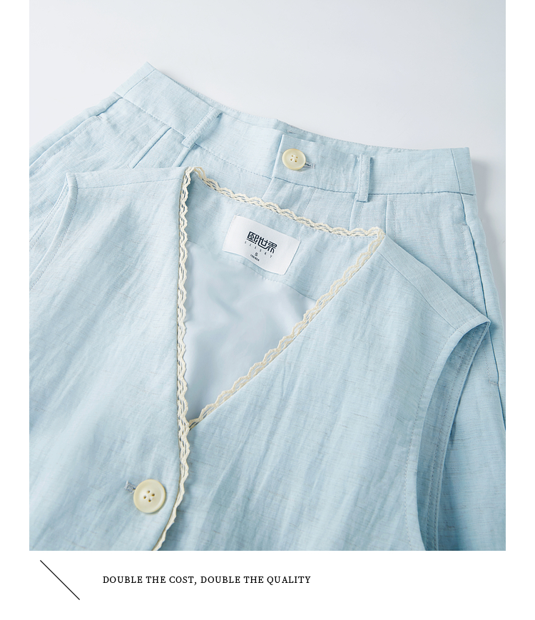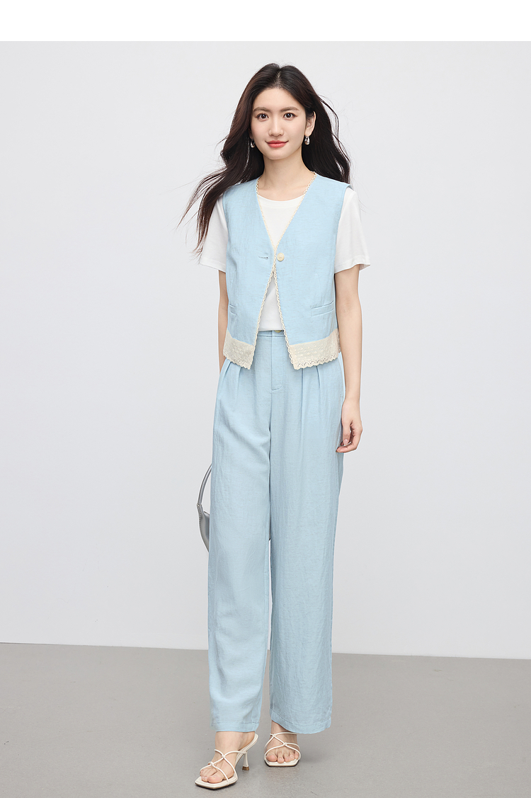 【07/30新品6.5折】熙世界小香风套装女夏季高级感天丝亚麻花边马甲休闲阔腿裤两件套