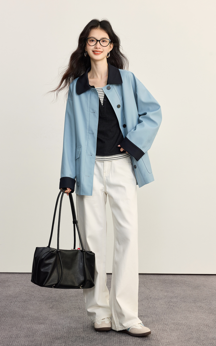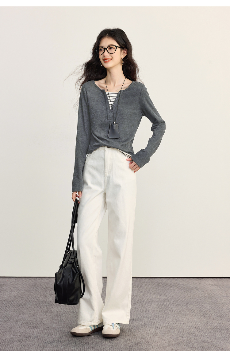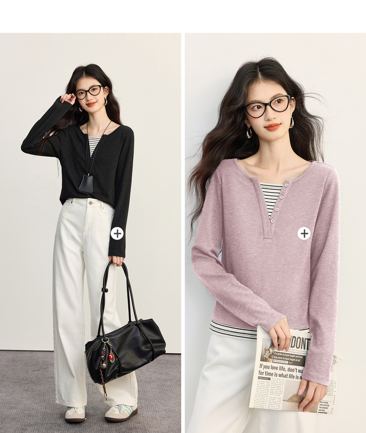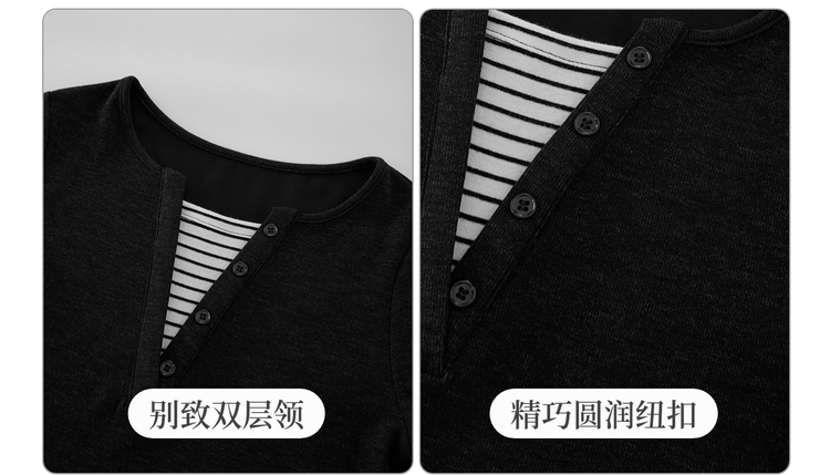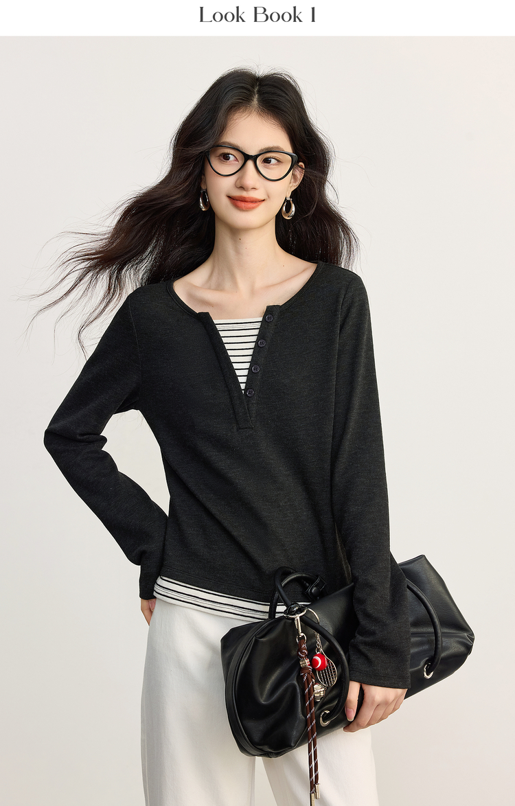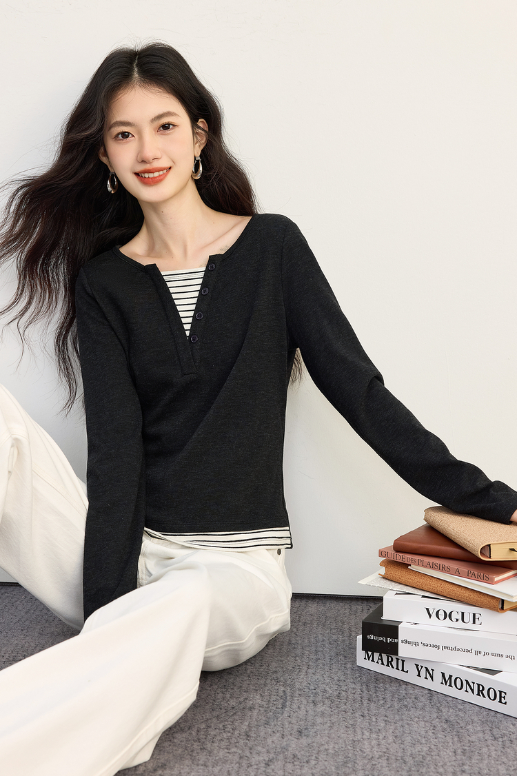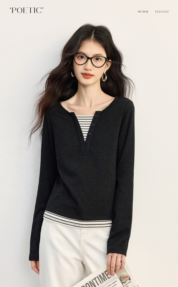 【09/26新品】熙世界条纹拼接假两件针织T恤女长袖秋季新款高级感chic别致上衣