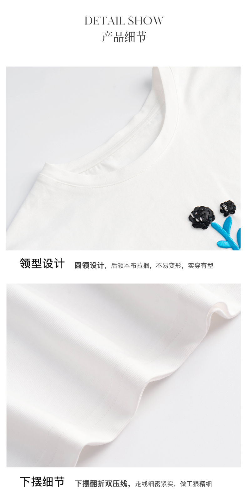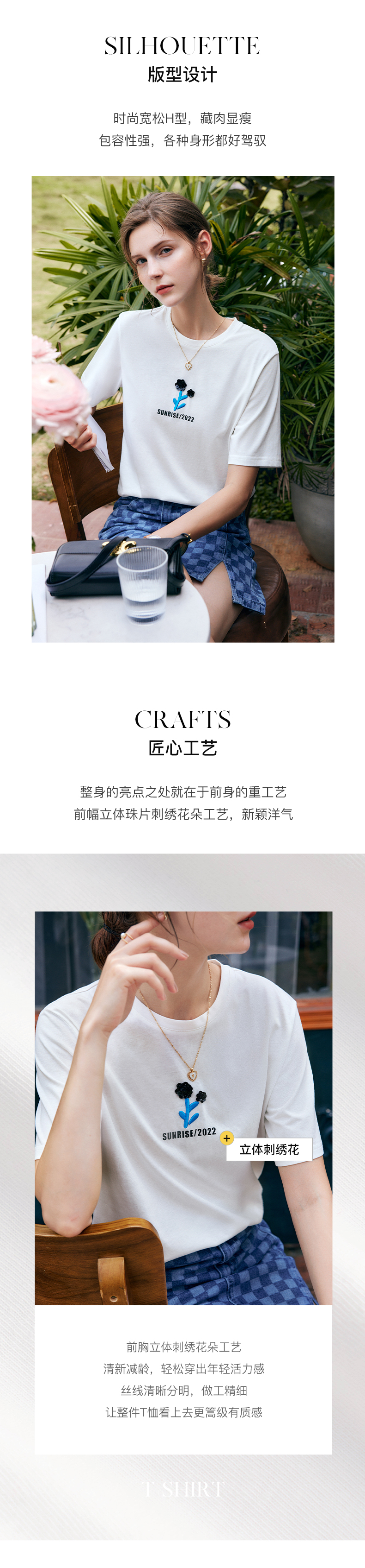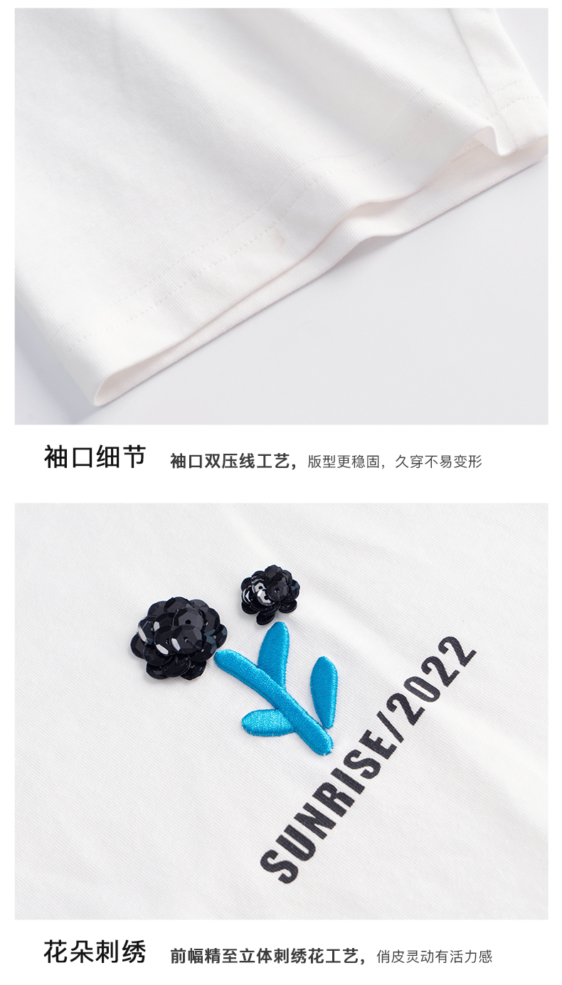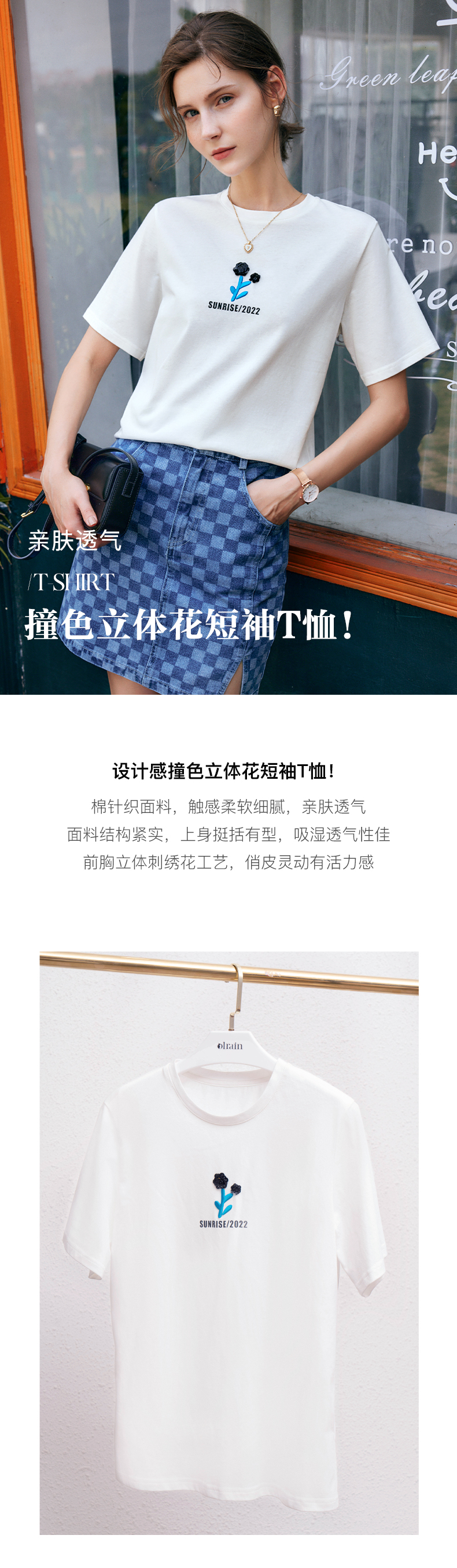 OLrain法式白色短袖t恤女夏季2022年新款宽松刺绣设计感撞色上衣
