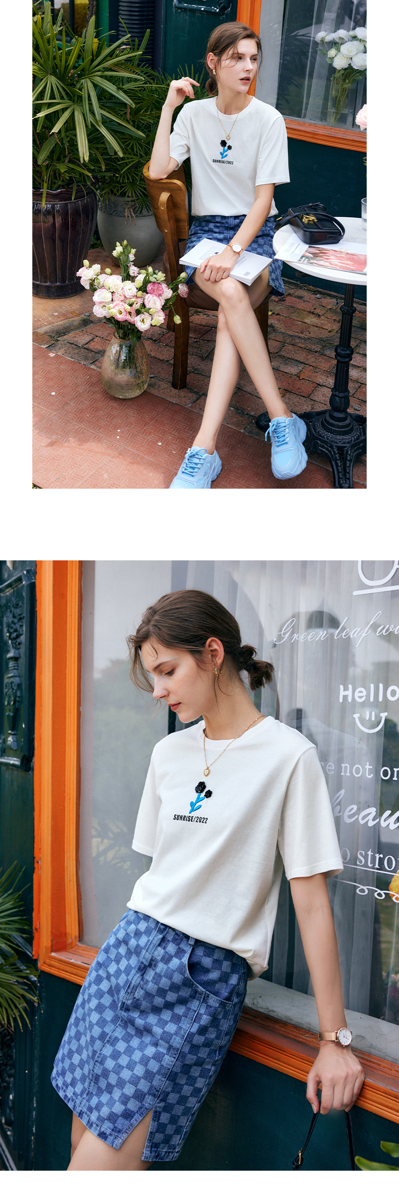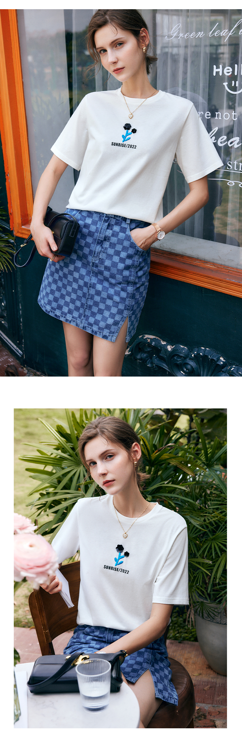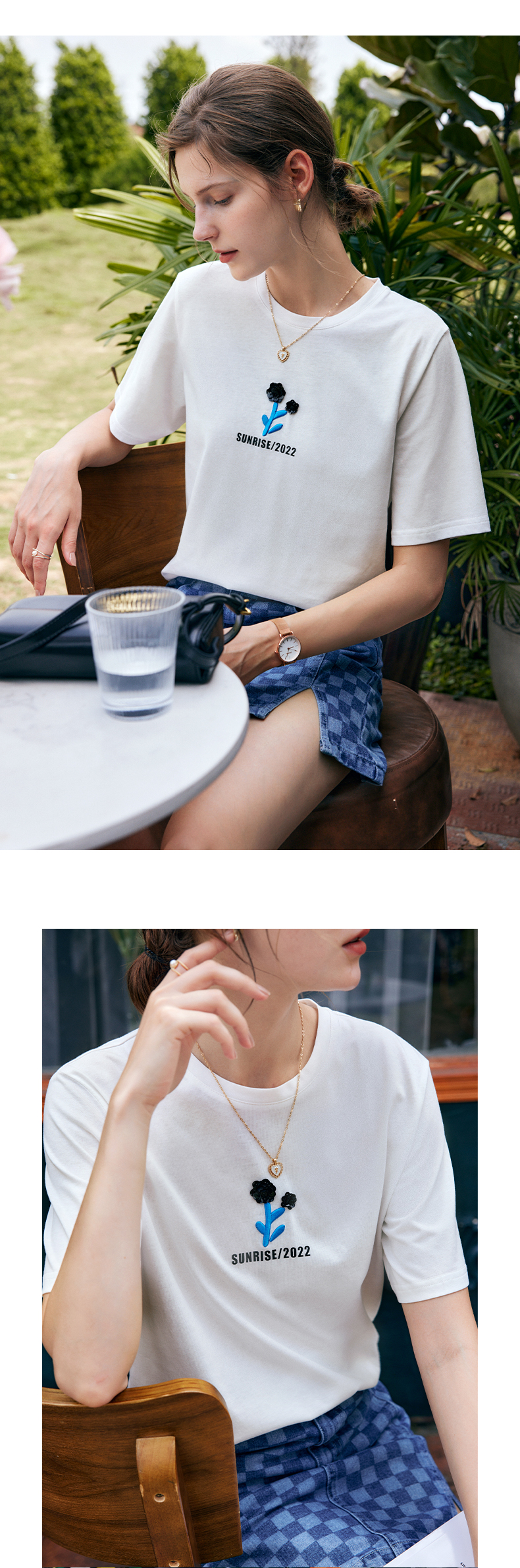 OLrain法式白色短袖t恤女夏季2022年新款宽松刺绣设计感撞色上衣