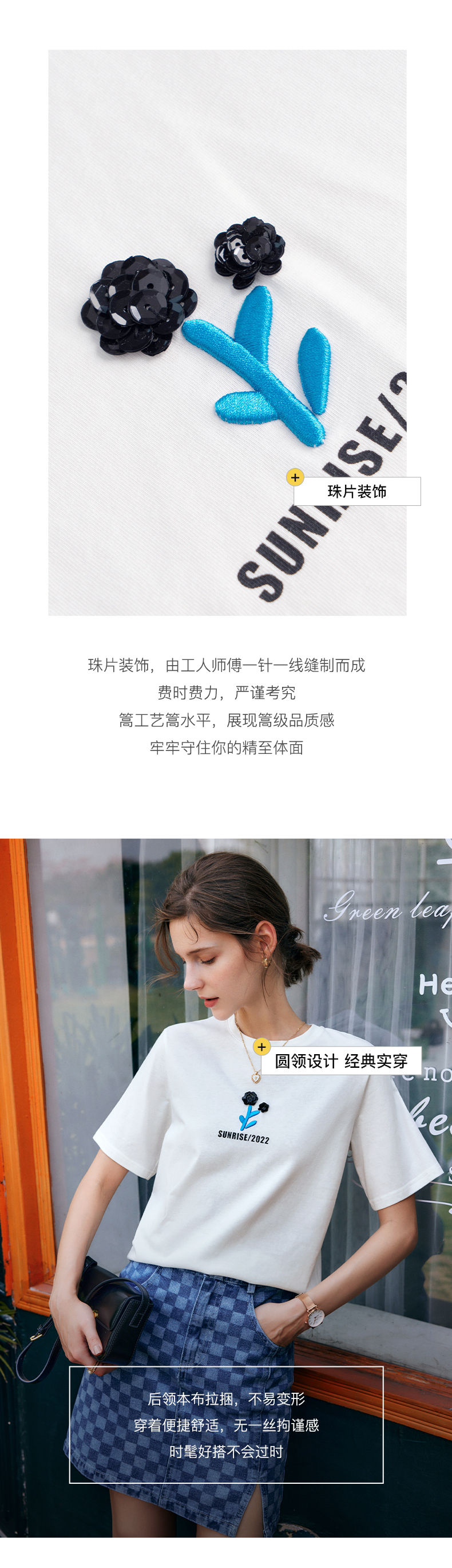 OLrain欧芮儿法式短袖T恤女夏季2023年新款宽松时尚刺绣薄款上衣