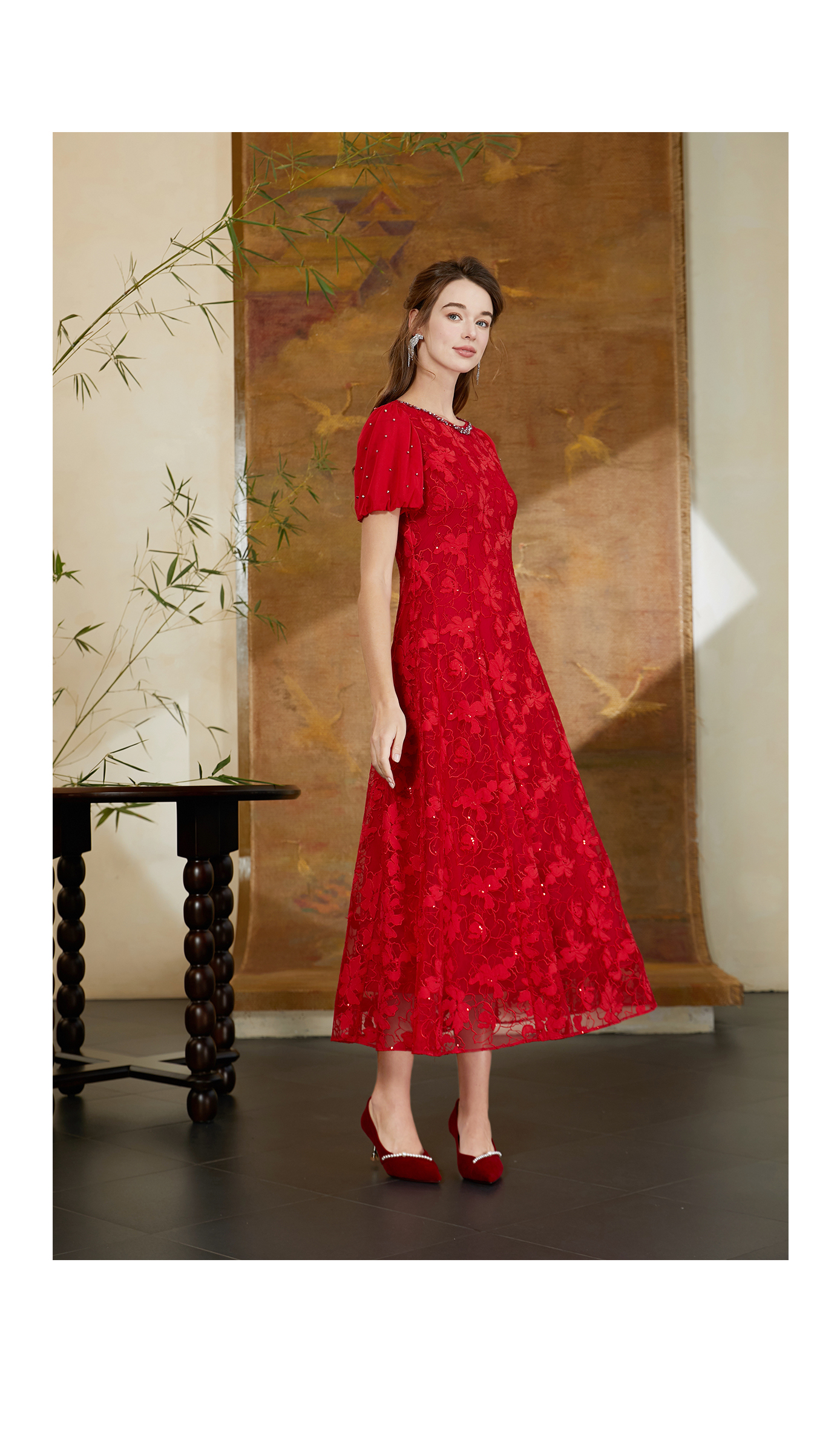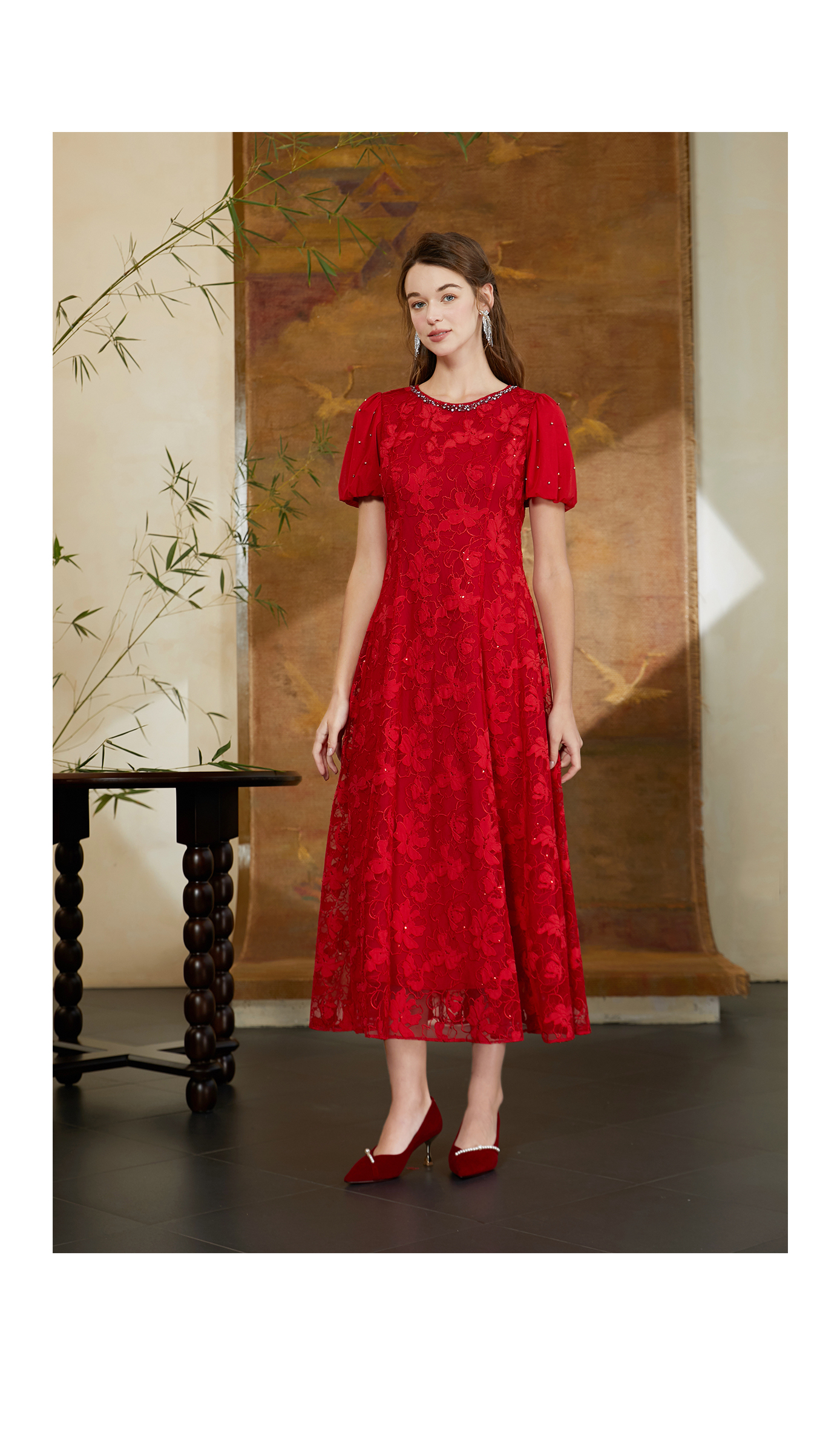 司歌喜庆红裙蕾丝中长裙短袖夏A911048X