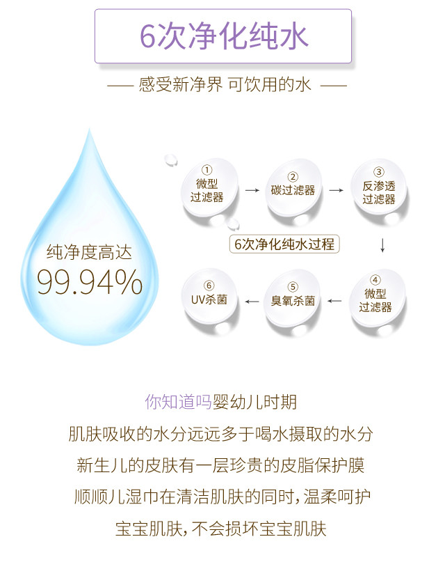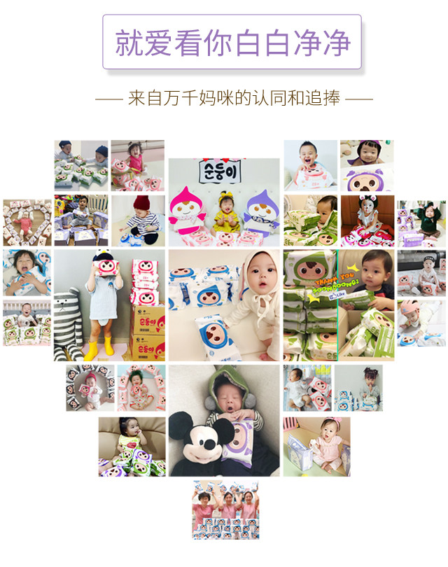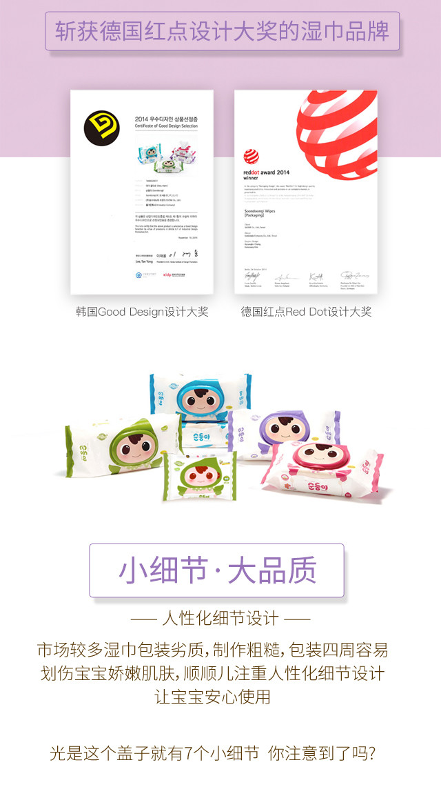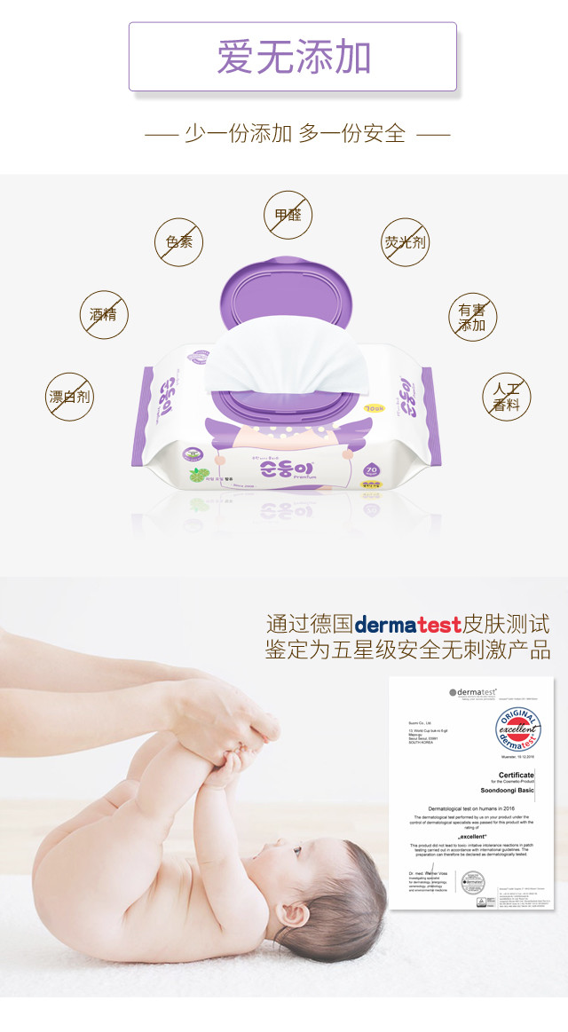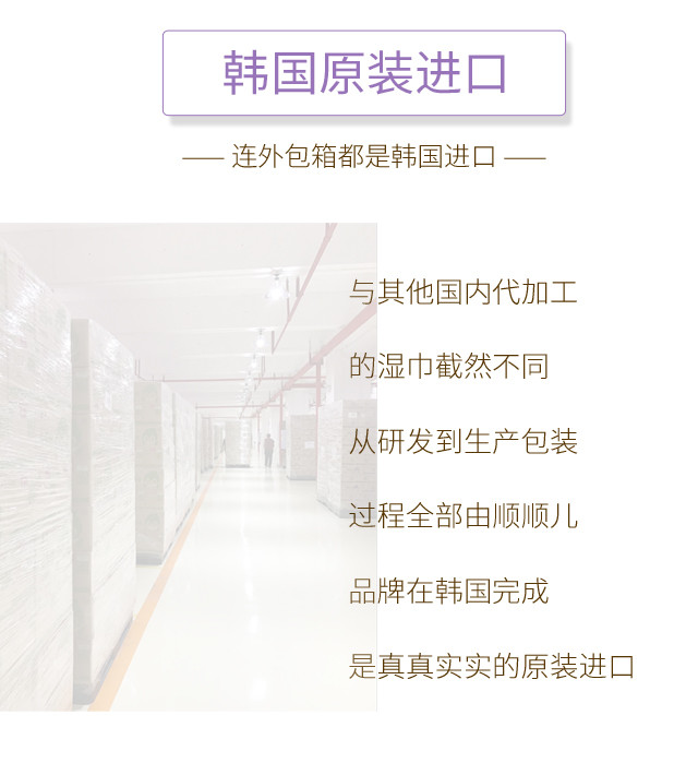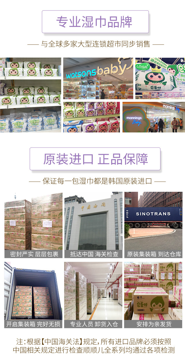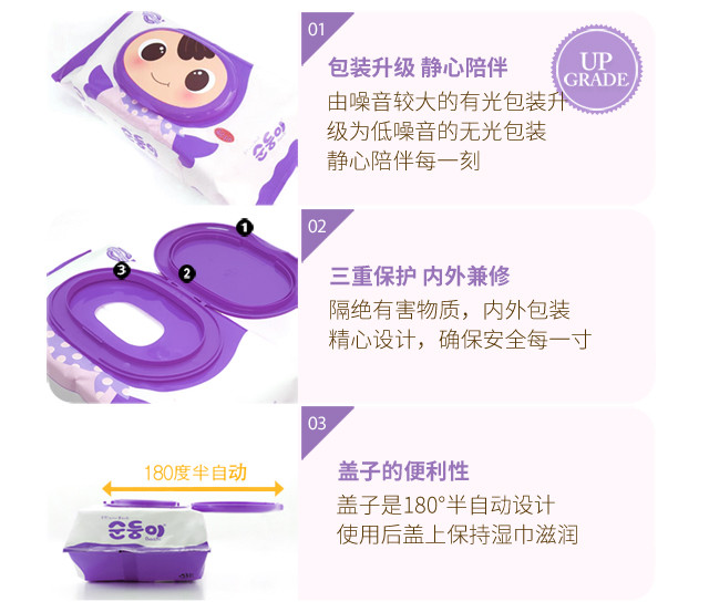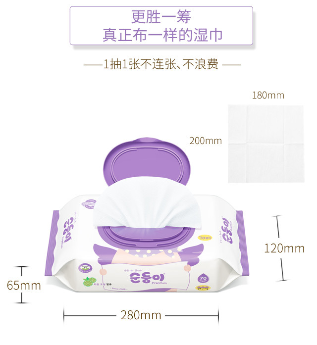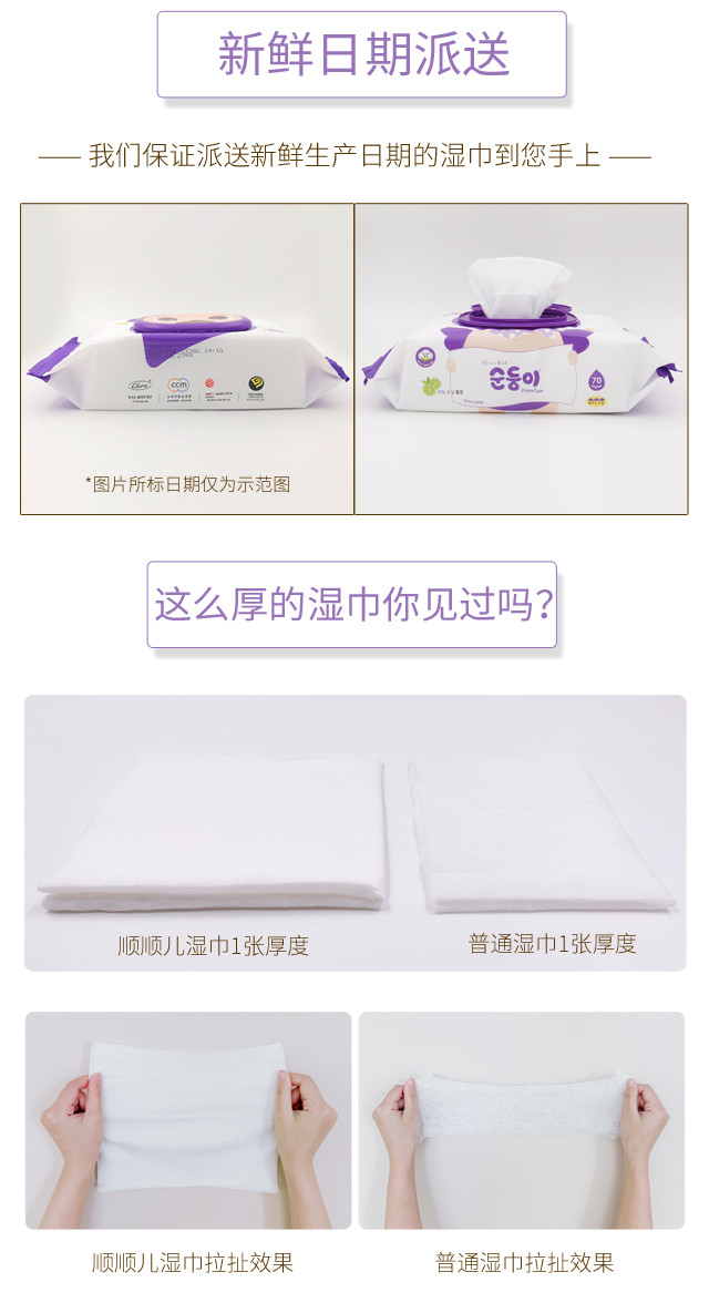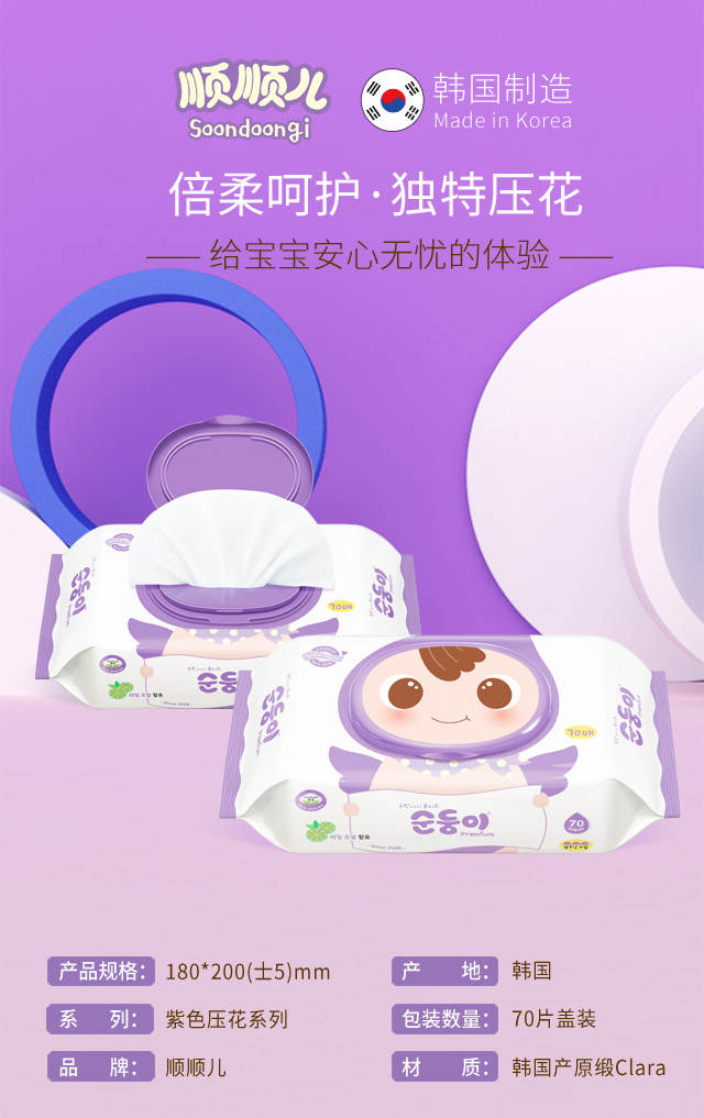 顺顺儿韩国原装进口婴儿湿巾紫色压花70抽10包
