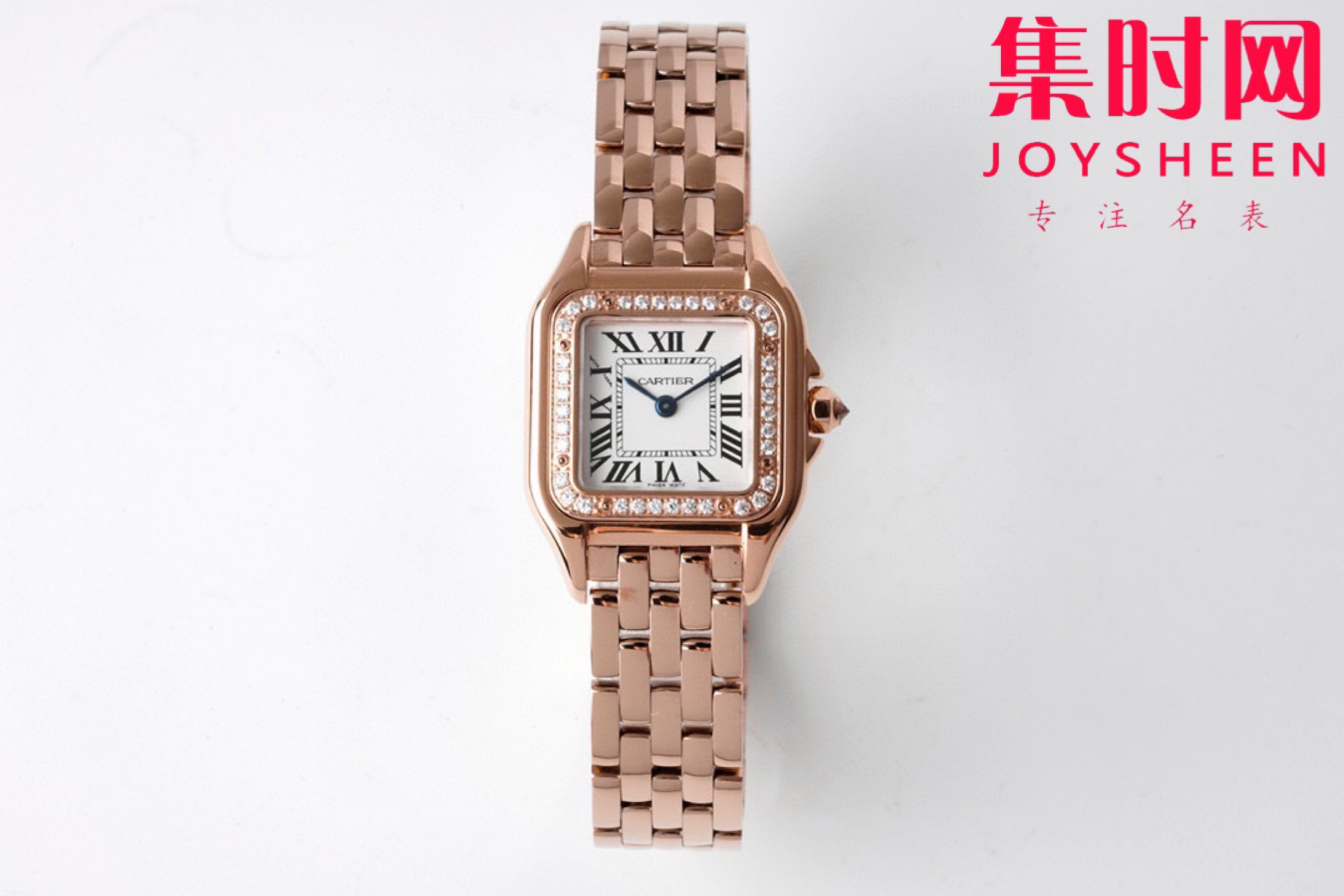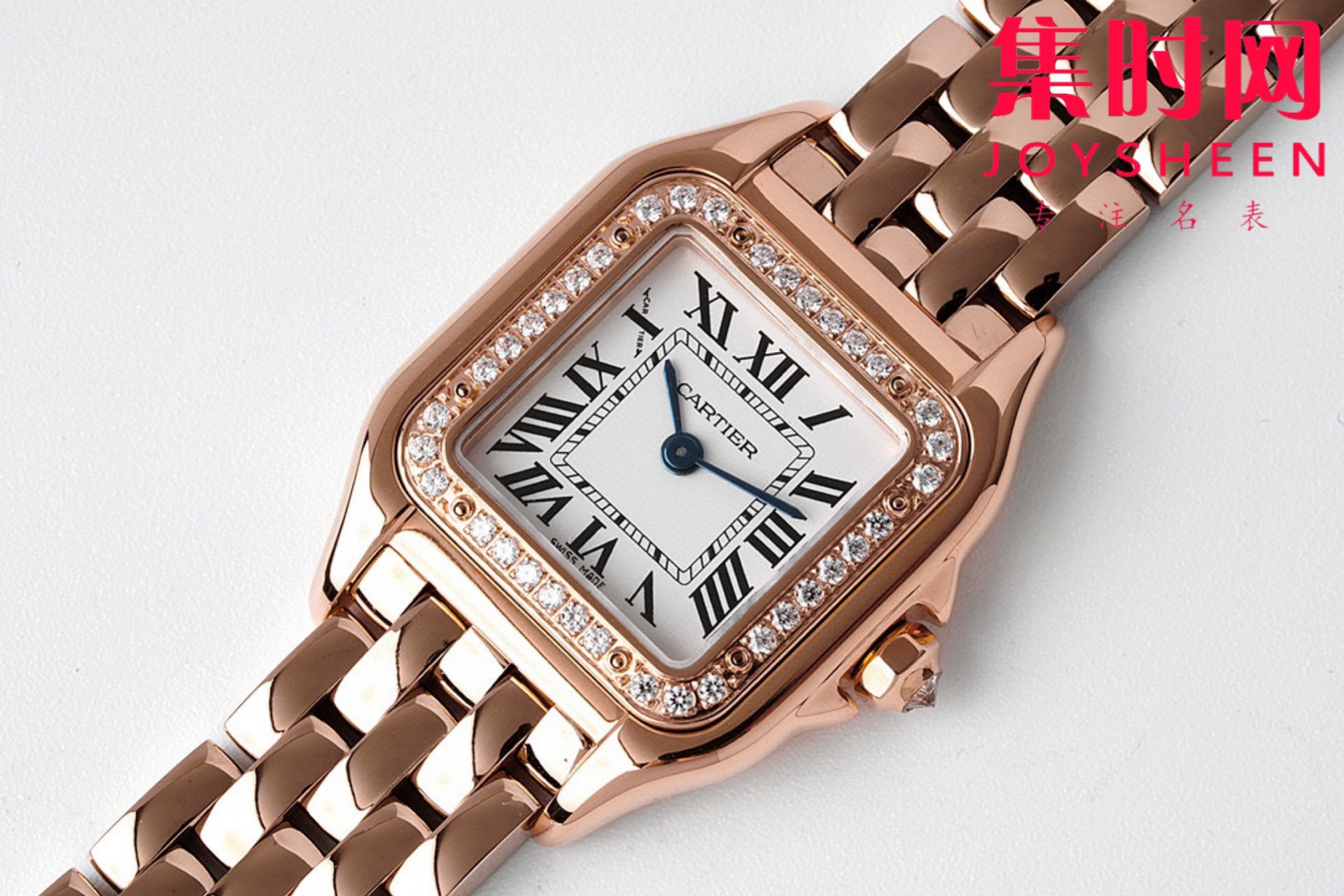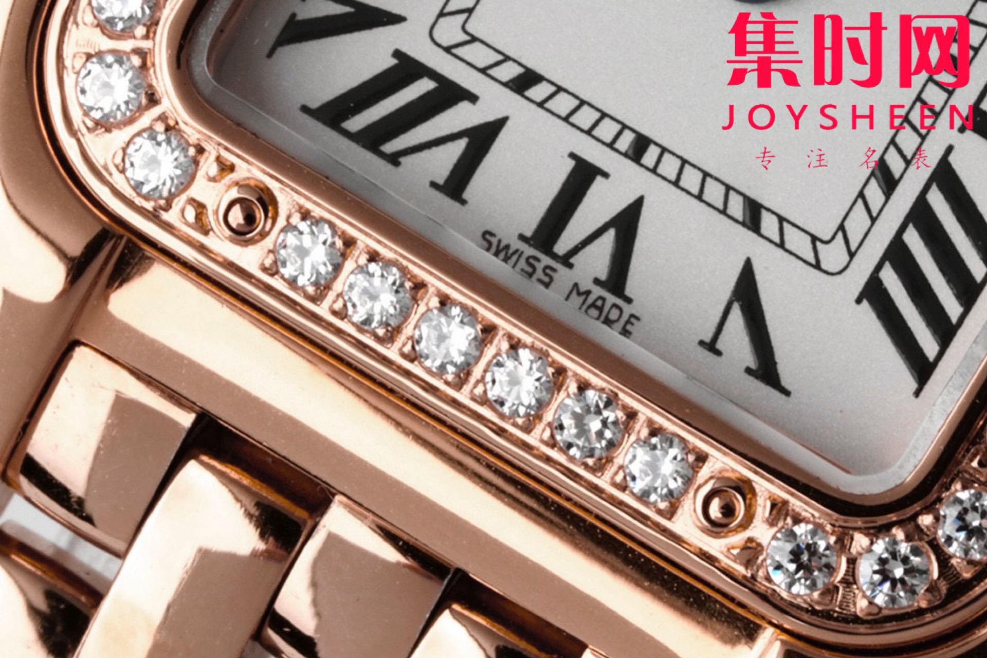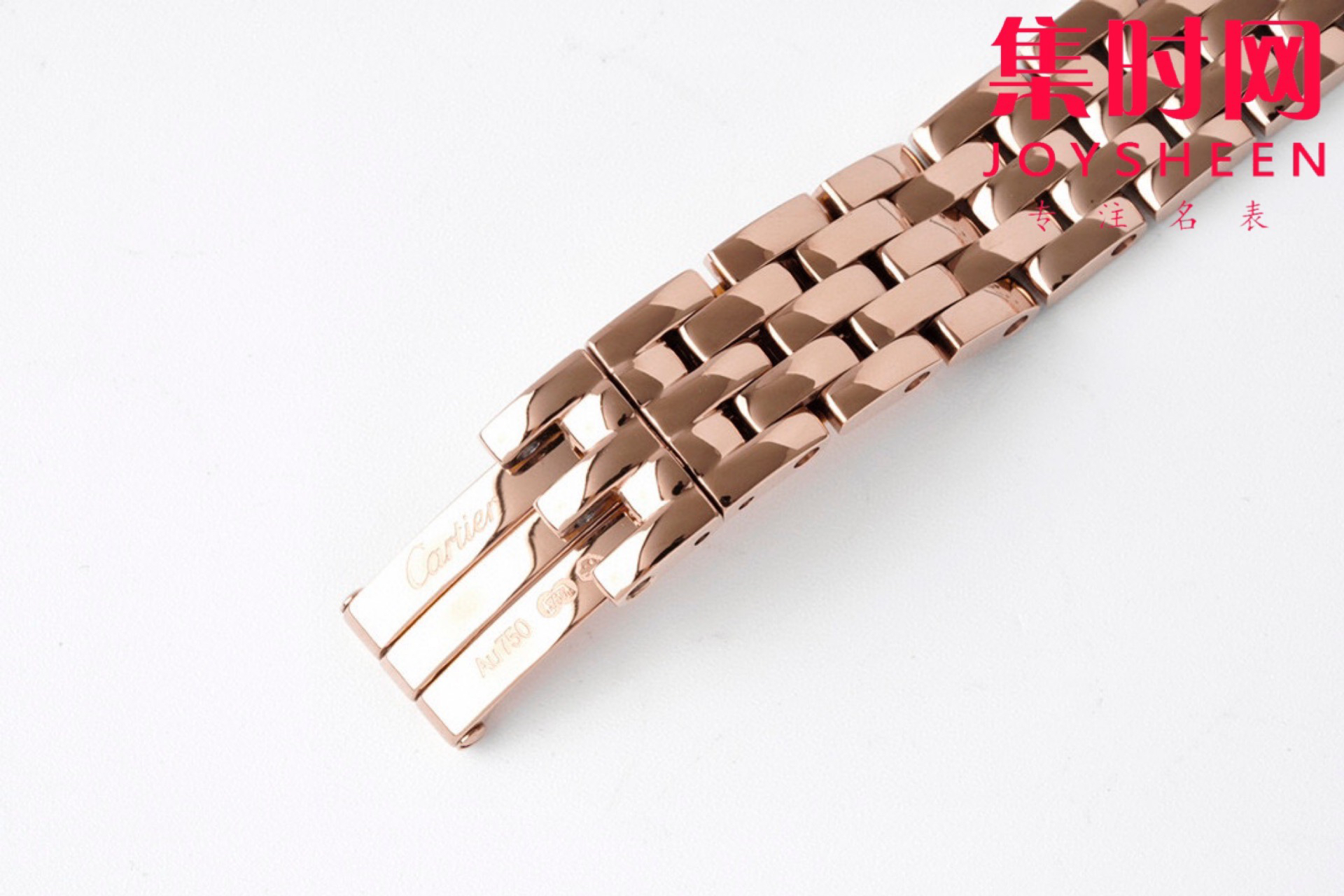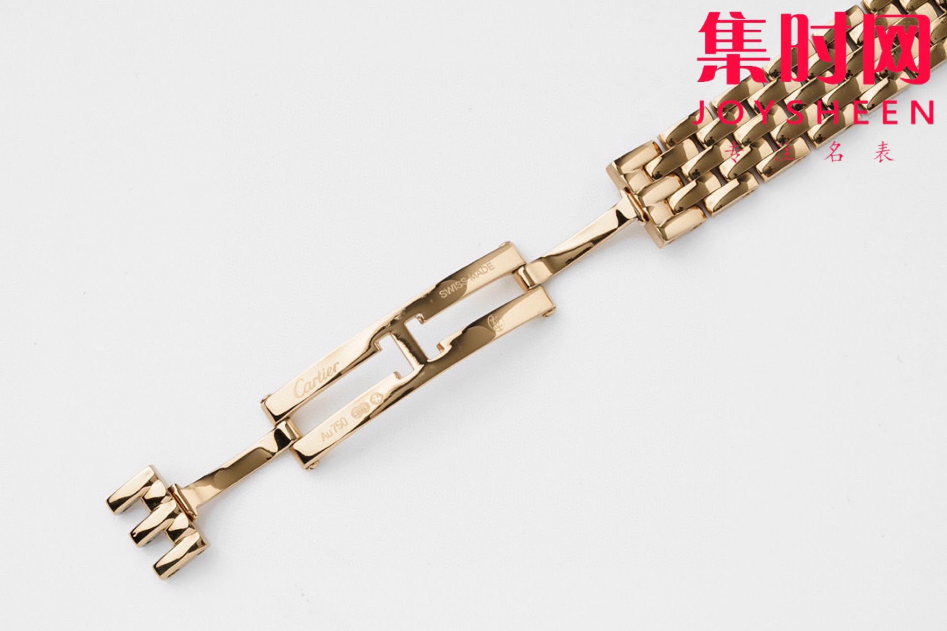 卡地亚Panthère de Cartier猎豹系列腕表 小号22X30mm 使用方形双层表壳看起来更加立体大方,更加突显出腕表的优雅与经典。白色表盘上,卡地亚式时标设计更为腕表注入一份品牌的 魅力。蓝色中央时分针宛若在两只随时间而舞动的精灵,为整款腕表再填华彩。 与传统卡地亚腕表一样,表冠上镶嵌有一颗具有品牌代表性的蓝宝石,向观表者展现高级钟表珠宝品牌卡地亚的独有魅力。表冠采用防滑纹理设计,方便对腕表的调试。两边的表冠护桥也为腕表增添了一份安全防护。 相比背透设计,密底工艺可以保障腕表机芯安全性。灵活自如的链节表链是腕表另一大亮点,处处都散发着曜目而饱满的光芒,从上到下都充满着独特的优雅奢华气质。