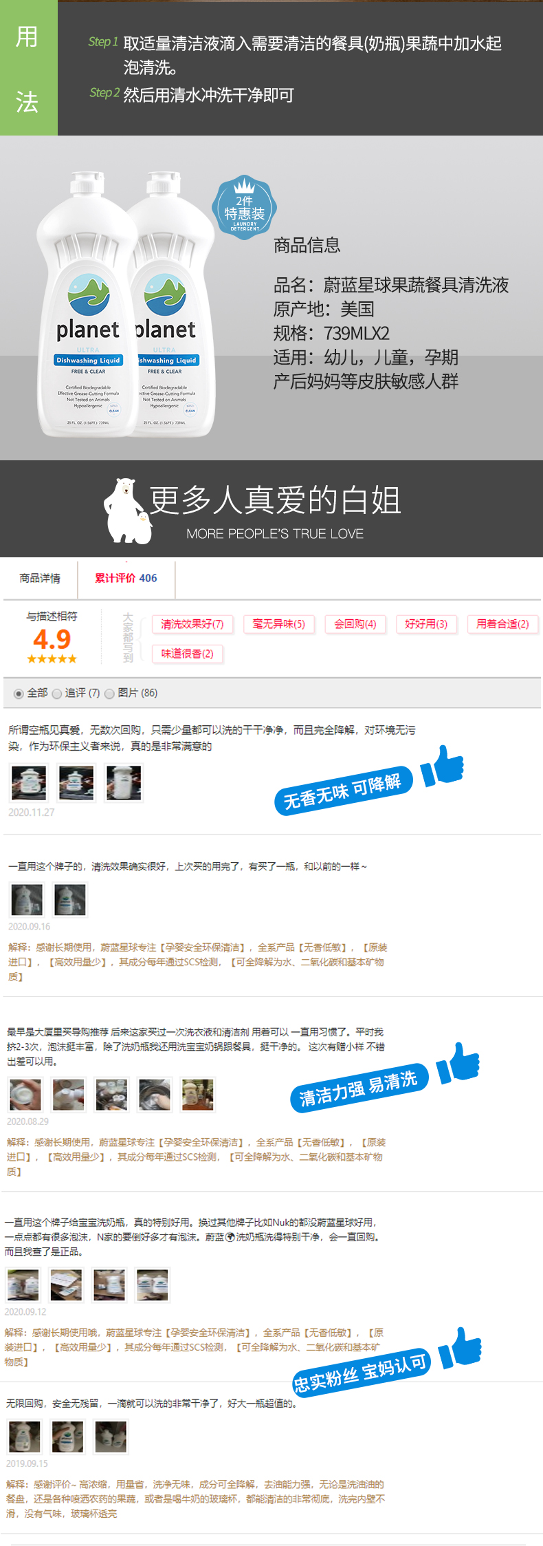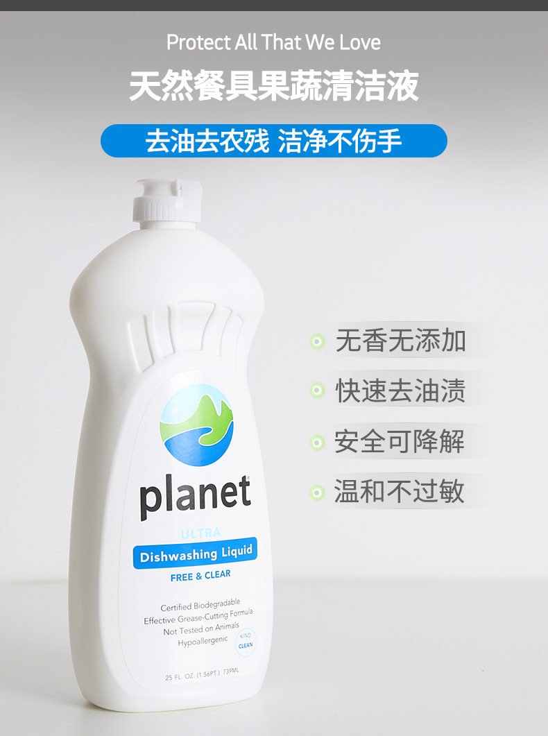 美国蔚蓝星球宝宝餐具果蔬清洗剂奶瓶餐具清洁剂无香低敏2瓶特惠装