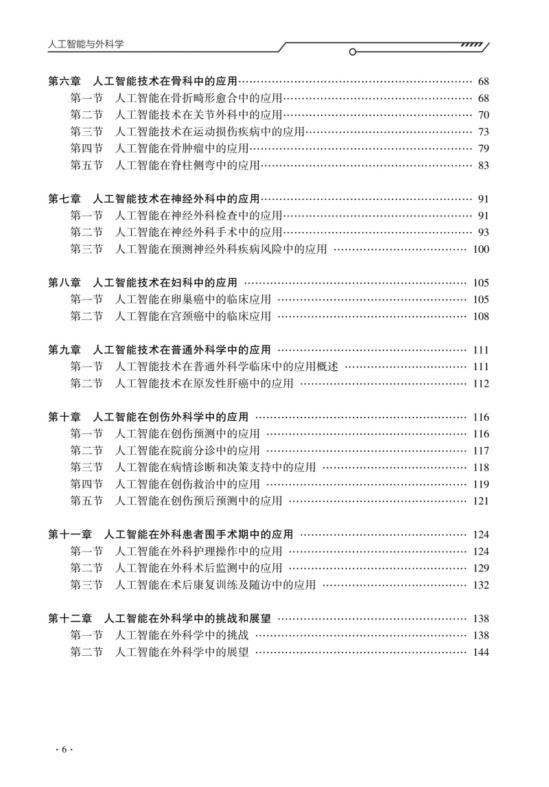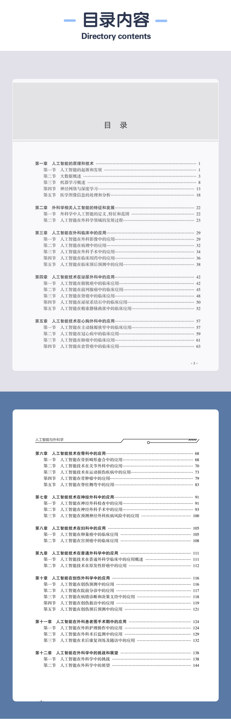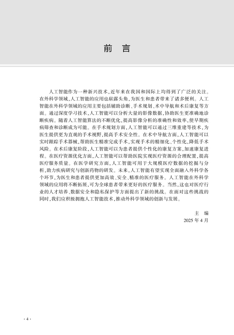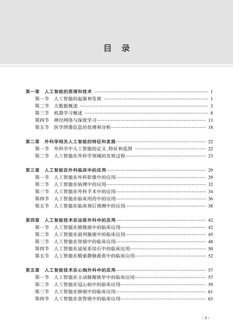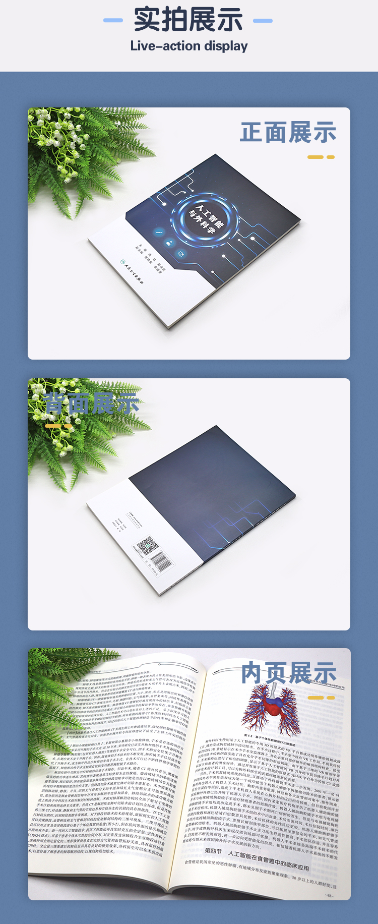 本教材覆盖了人工智能在外科医学应用中的基础知识、技术原理及前沿发展动态。主要包括人工智能的原理和技术,人工智能在外科医学领域中的发展过程,人工智能在外科临床诊断、外科手术、创伤外科救治、术后康复等领域,以及在外科教学、赋能神经外科、骨科、妇产科、普外科等临床案例中的应用,还包括人工智能在外科医学中的应用展望等。旨在向相关专业师生系统介绍人工智能在外科医学中的应用方法和前沿动态,覆盖人工智能在外科医学中应用的方法原理和国内外相关技术的**发展,具体包括医学影像、辅助诊疗、疾病的风险预测、健康管理、辅助医学研究平台等,注重学以致用。