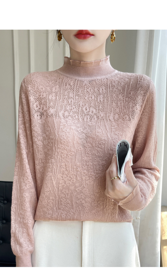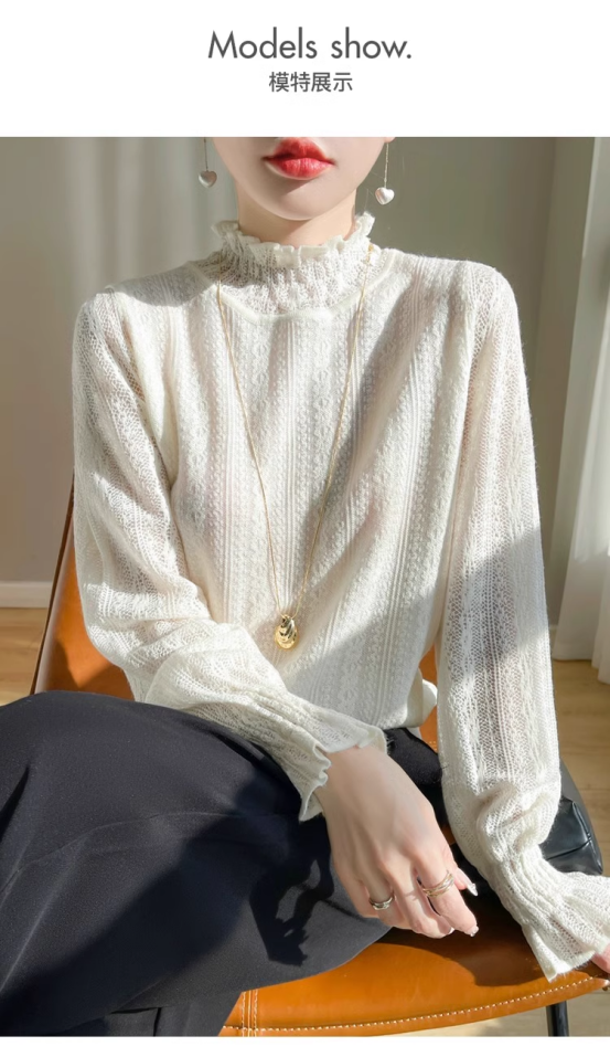 打底天花板,法式蕾丝打底衫,舒适的版型+梦幻的面料! 半高领设计,修饰脖颈线条,短脖星人也爱! 高密度蕾丝面料,半透明的镂空编织,同时单穿也不易暴露走光! 轻薄~不起球~好穿到爆炸,单穿/叠穿/内搭 ! 必须多入几件,这波羊毛必须薅❗