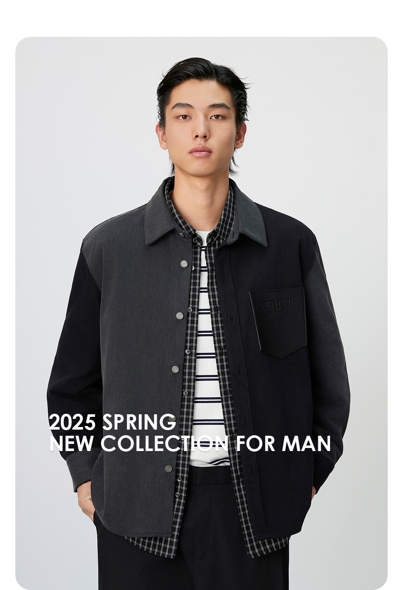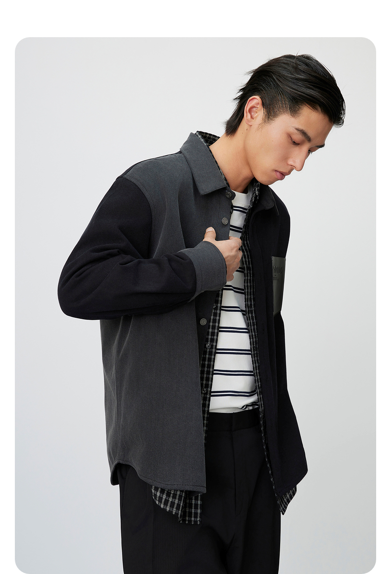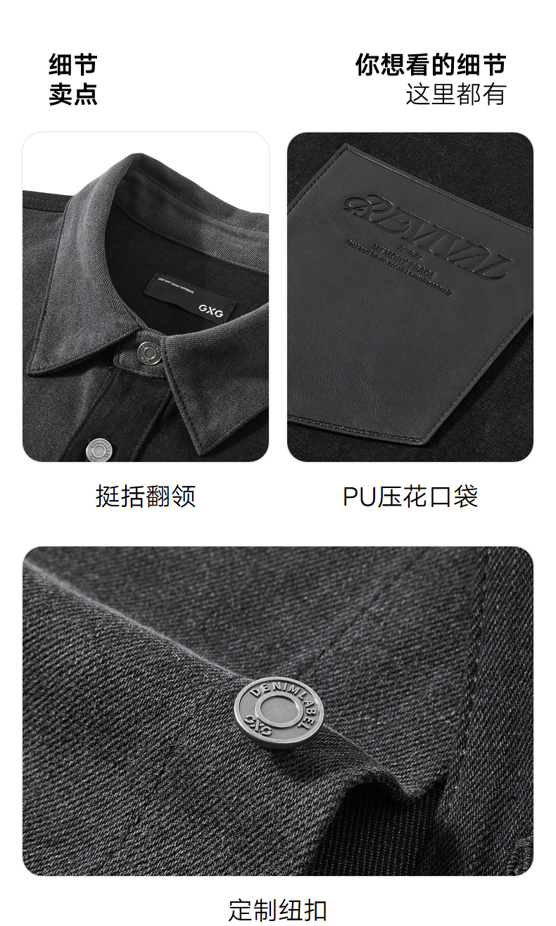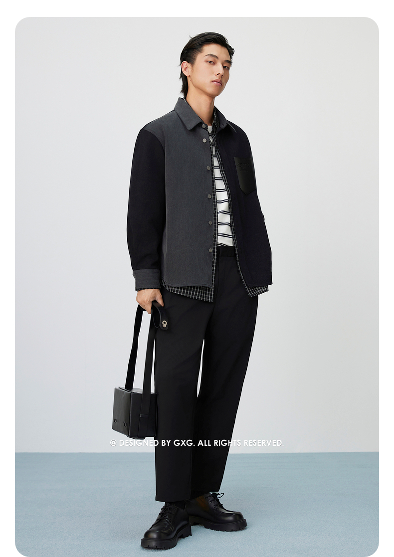 GXG男装 黑灰色拼色口袋设计潮流时尚宽松牛仔衬衫外套 25春热卖